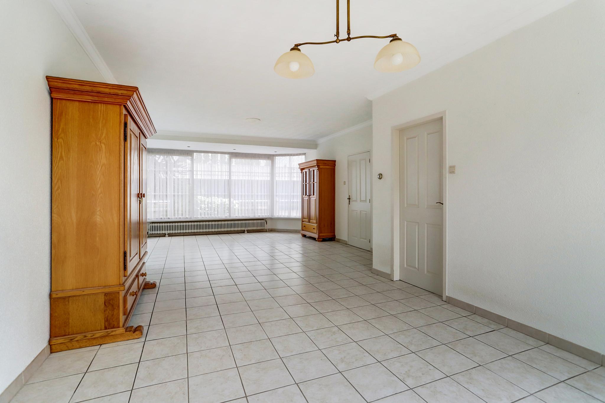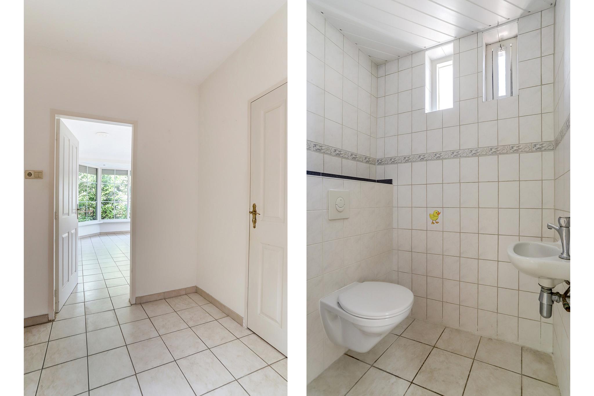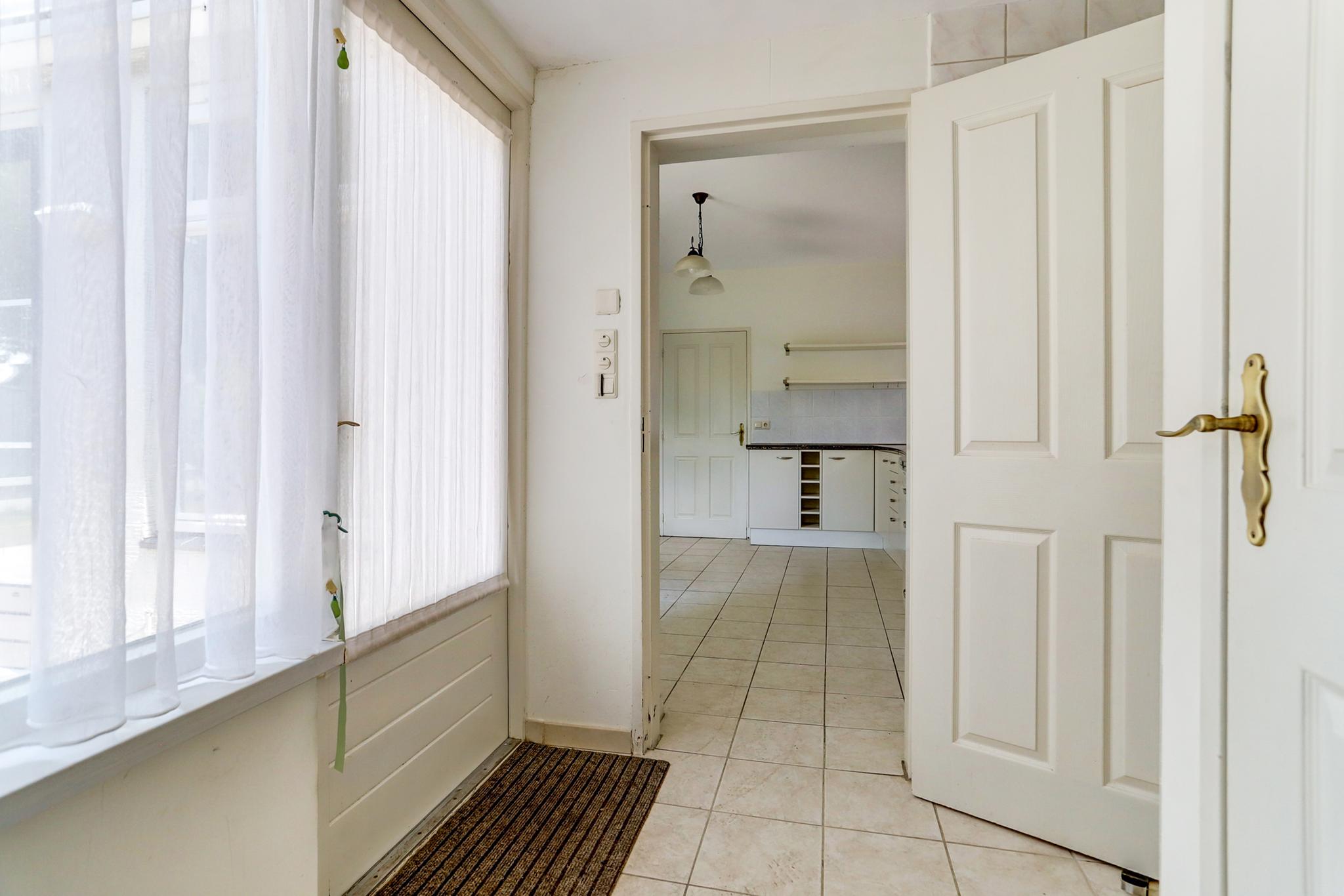 Hal afgewerkt met een tegelvloer, stucwerk wanden en een stucwerk plafond.
