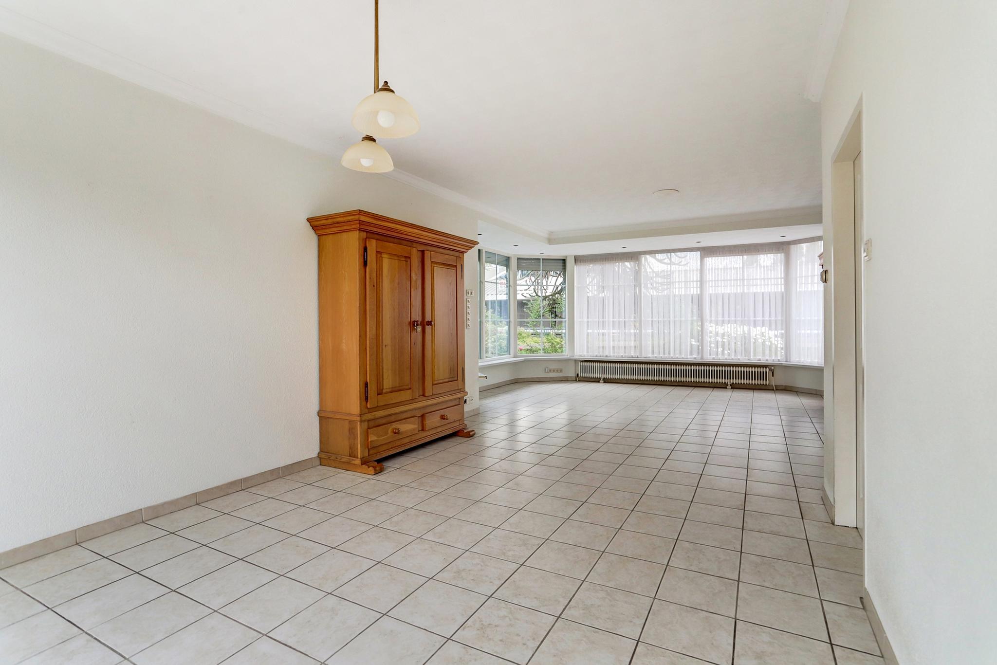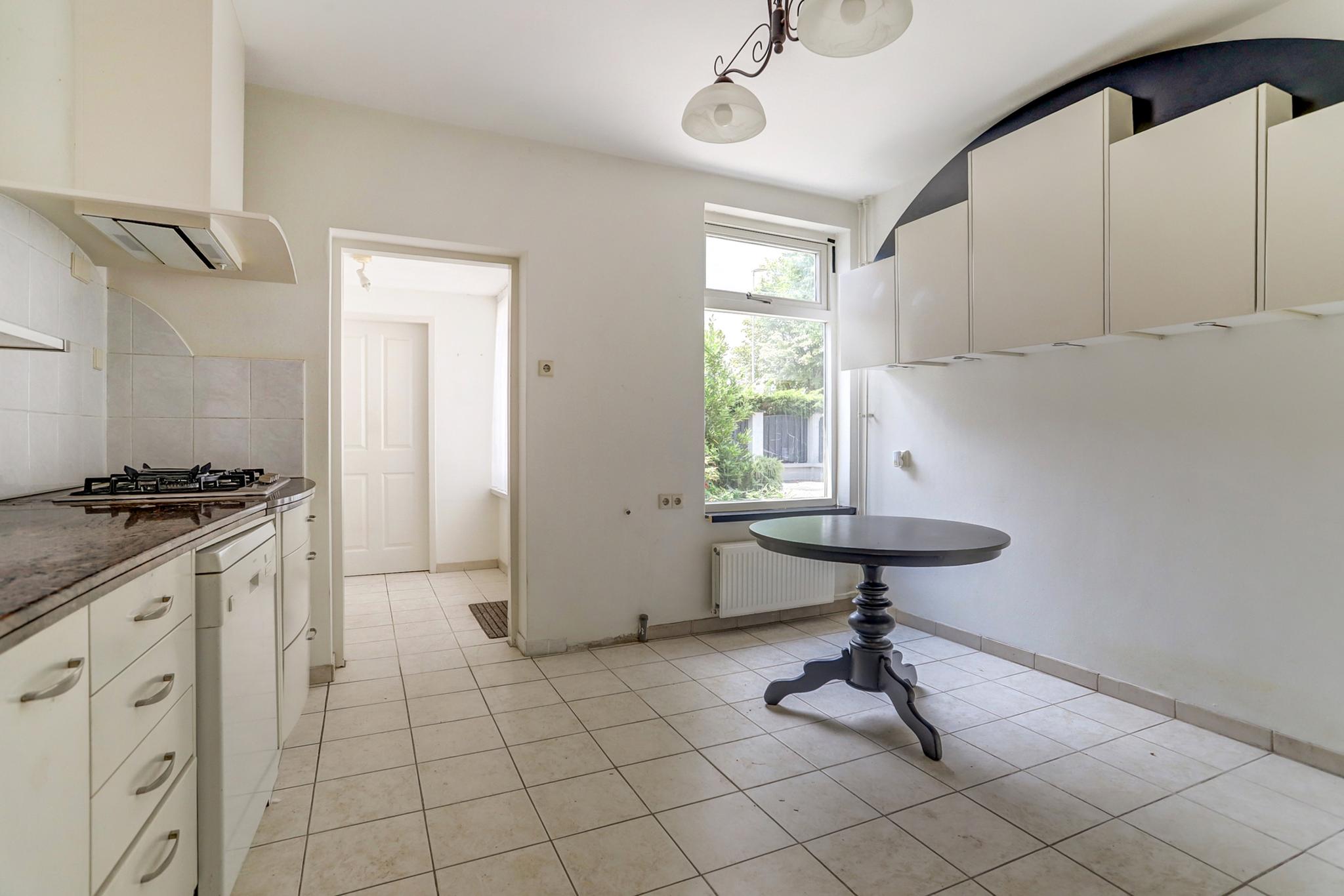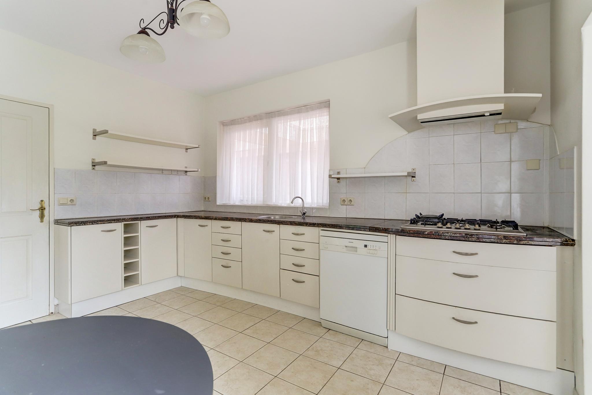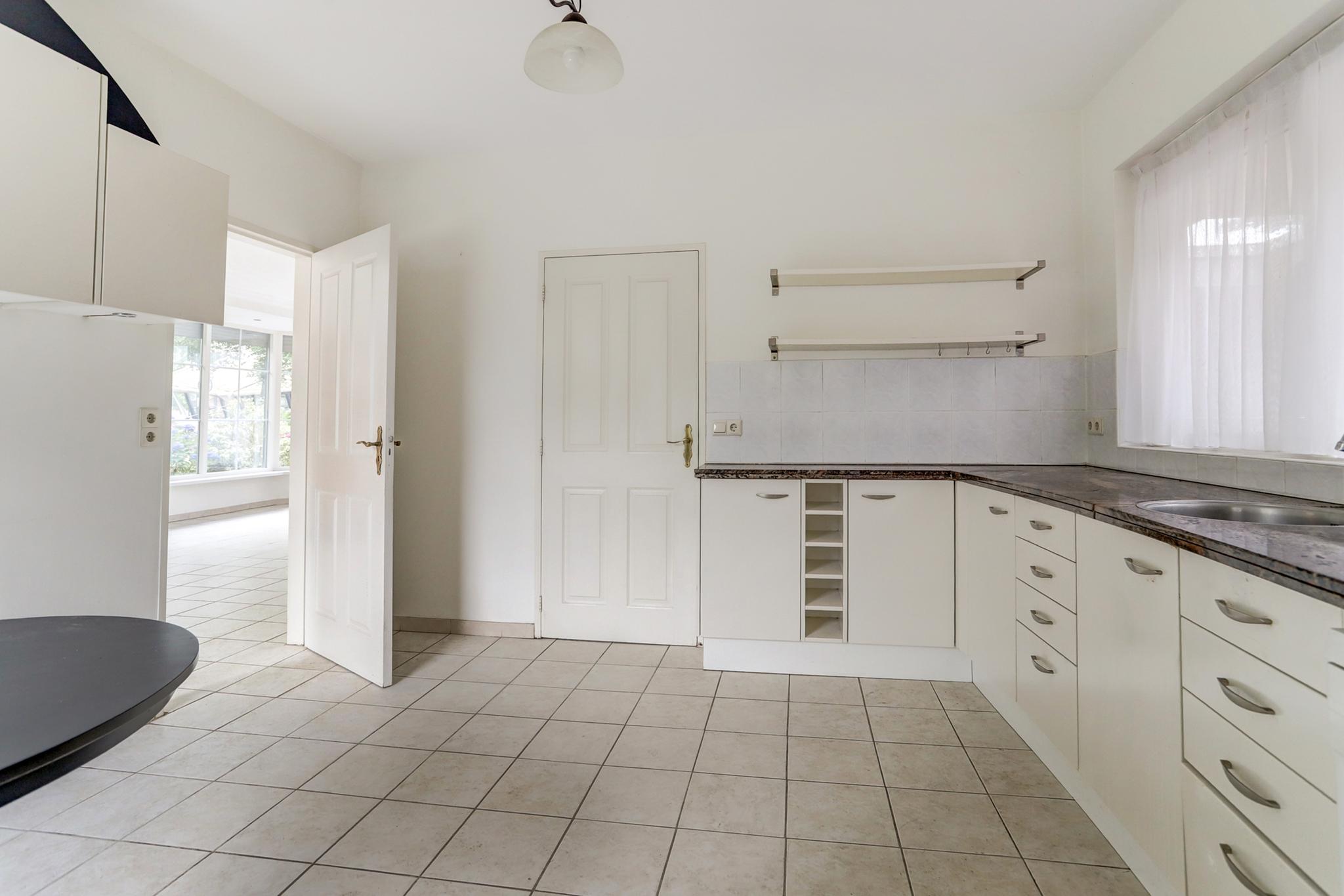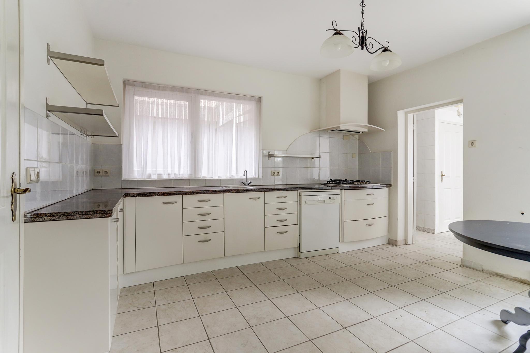 De woonkeuken is afgewerkt met een tegelvloer en deels betegelde wanden.