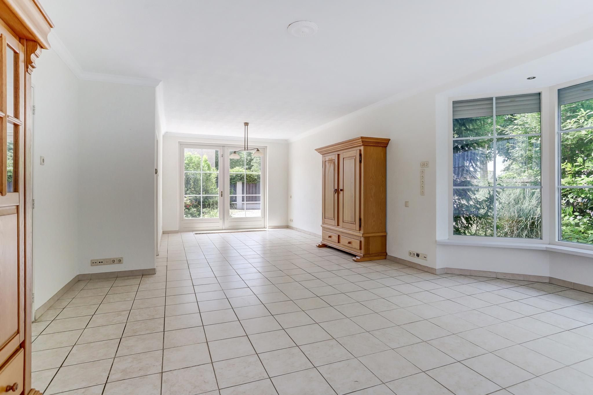 De royale living met openslaande tuindeuren en afgewerkt met een tegelvloer, spachtelputz wanden en een fijn schuurwerk plafond.