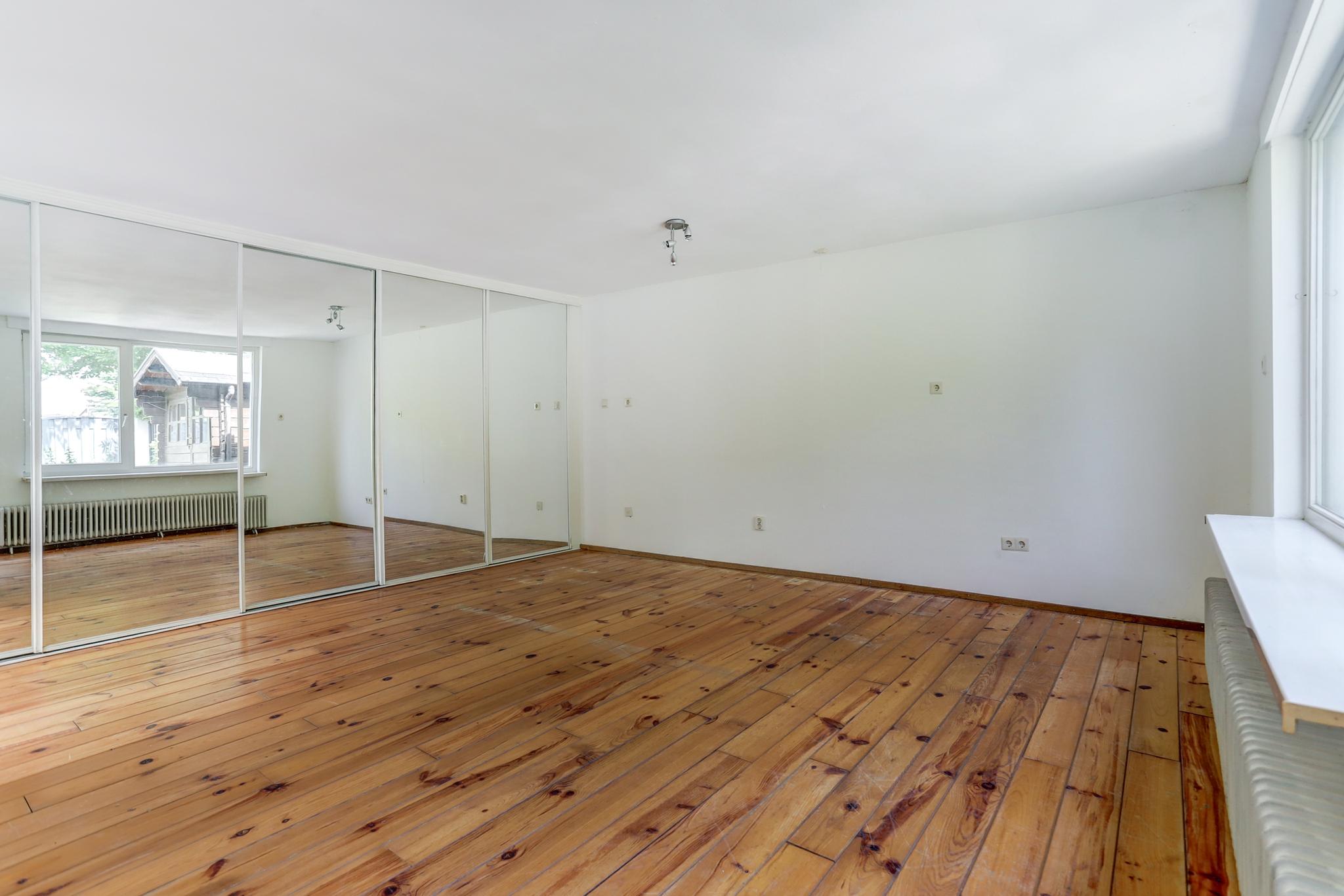 Slaapkamer 1 met een vaste kastenwand en afgewerkt met een houten delen vloer, stucwerk wanden en een fijn schuurwerk plafond.