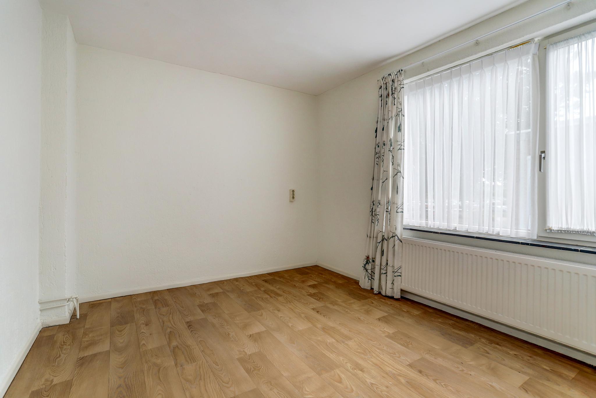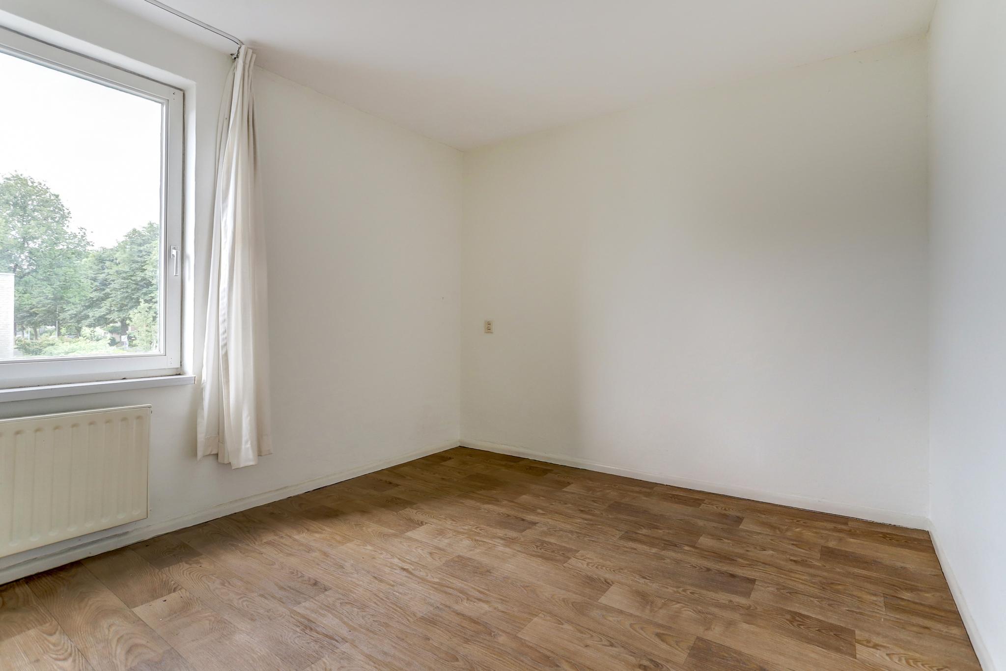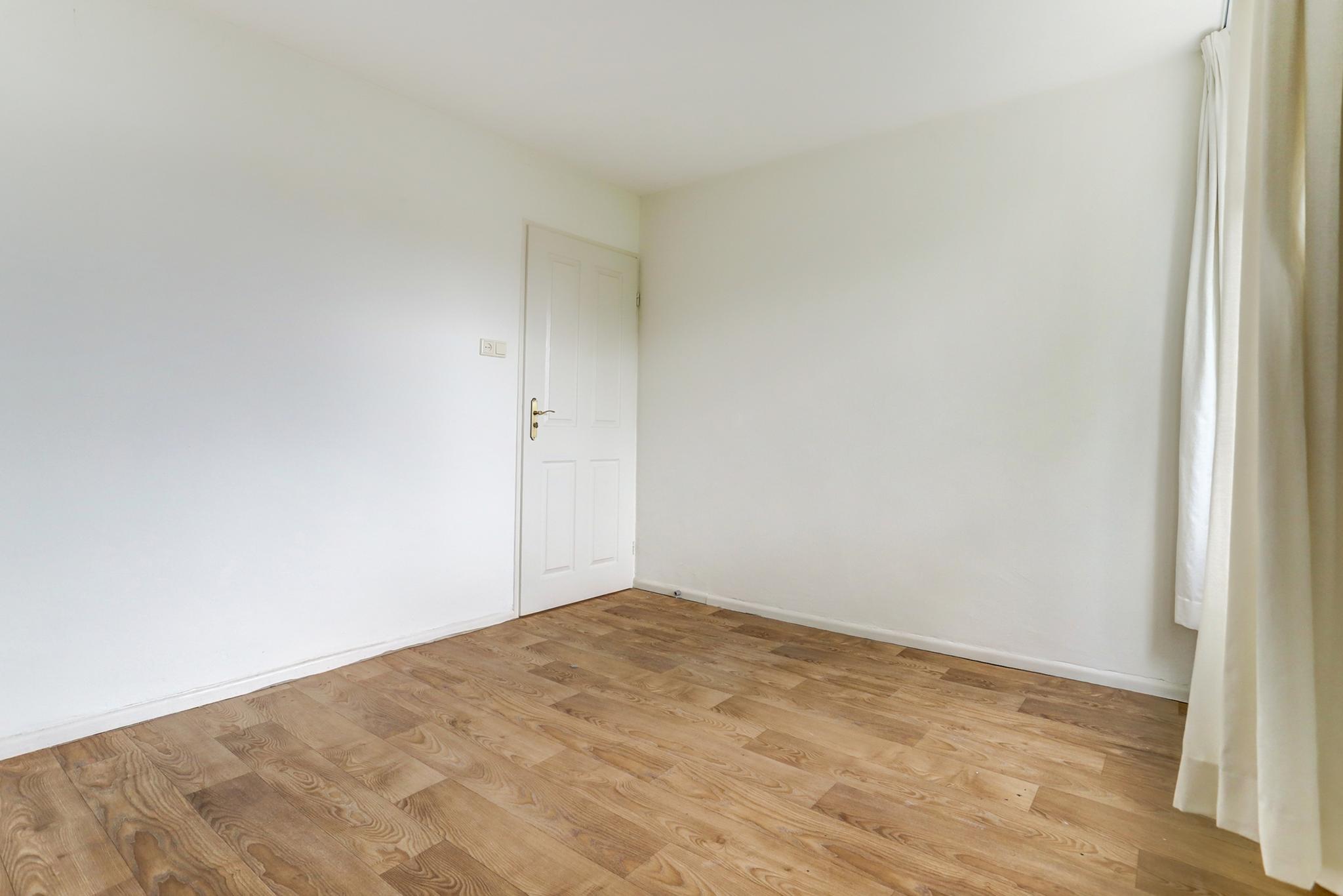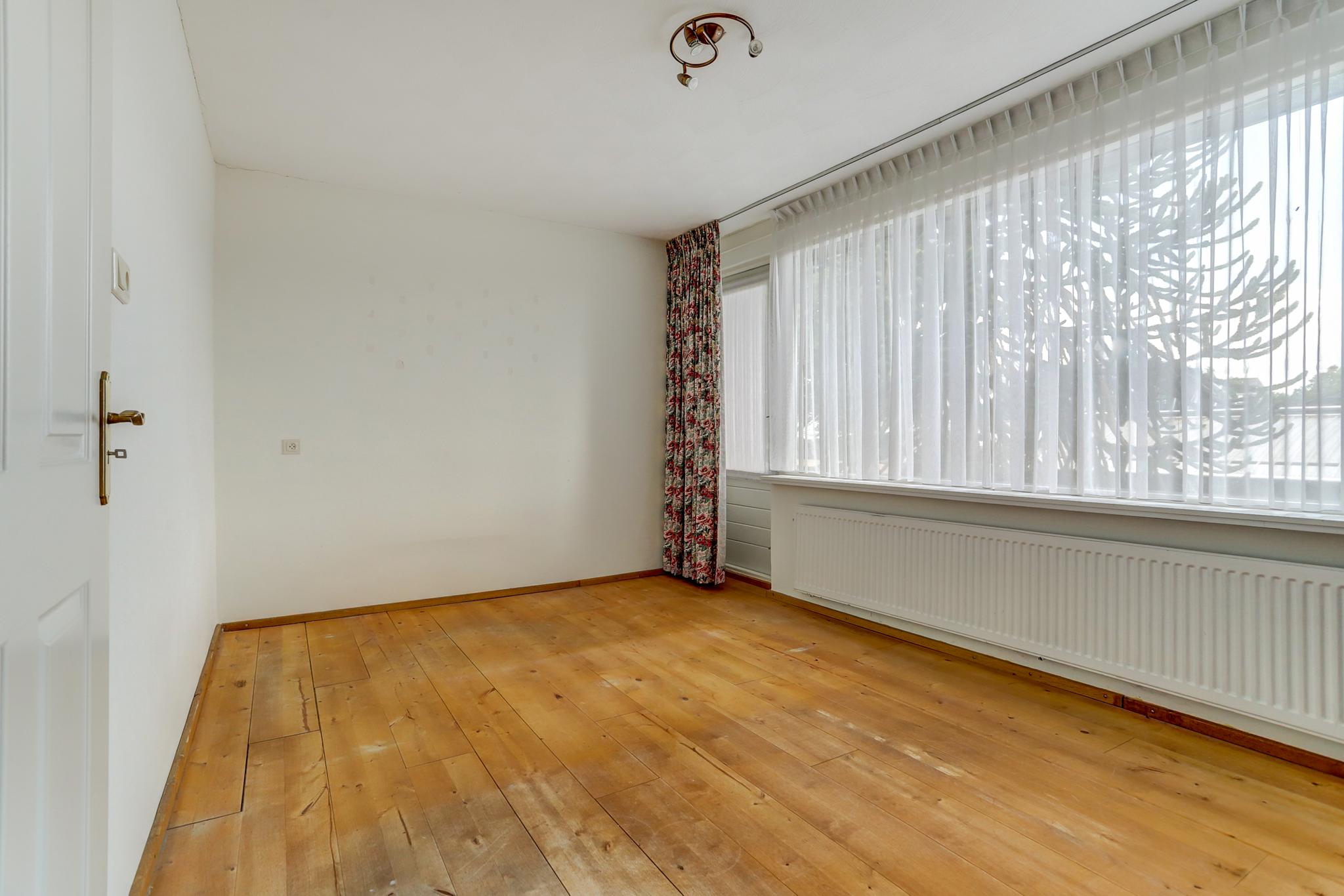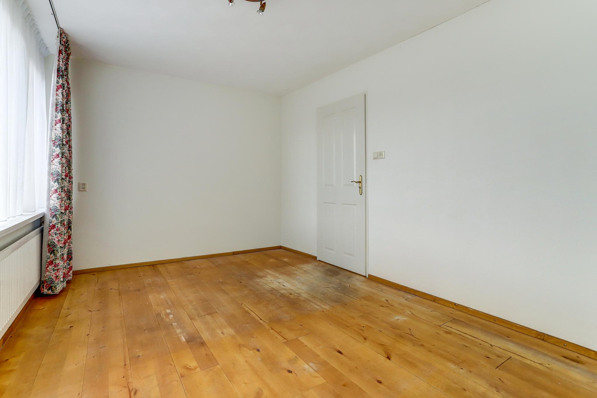 Slaapkamer 3 aan voorzijde is afgewerkt met een houten delen vloer, stucwerk wanden en een fijn schuurwerk plafond.
