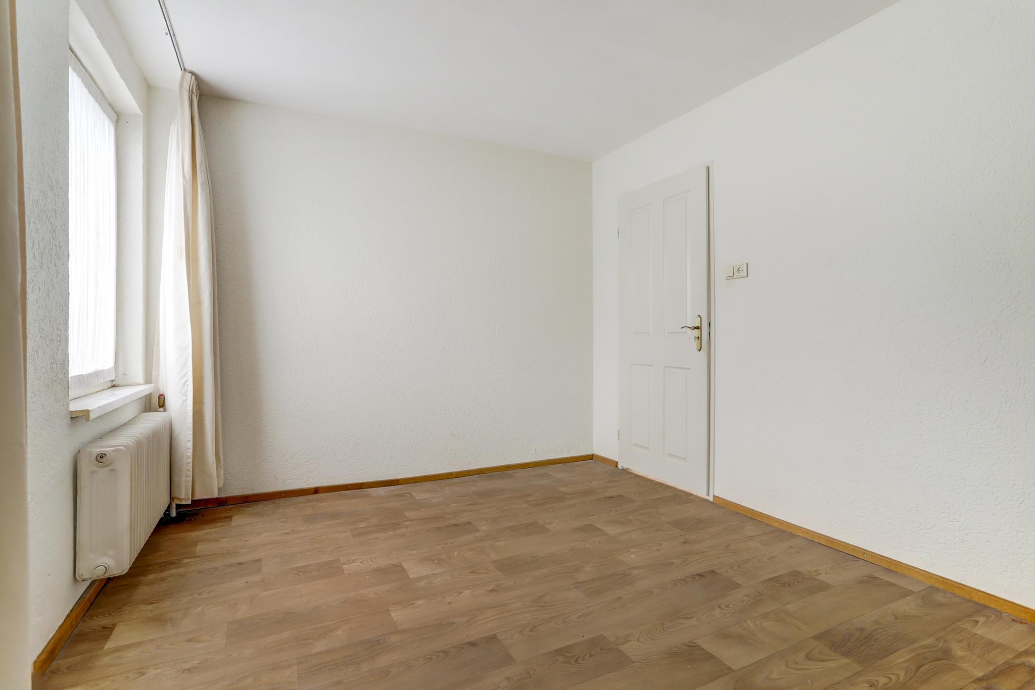 Slaapkamer 4 aan achterzijde is afgewerkt met een pvc vloer, stucwerk wanden en een fijn schuurwerk plafond.