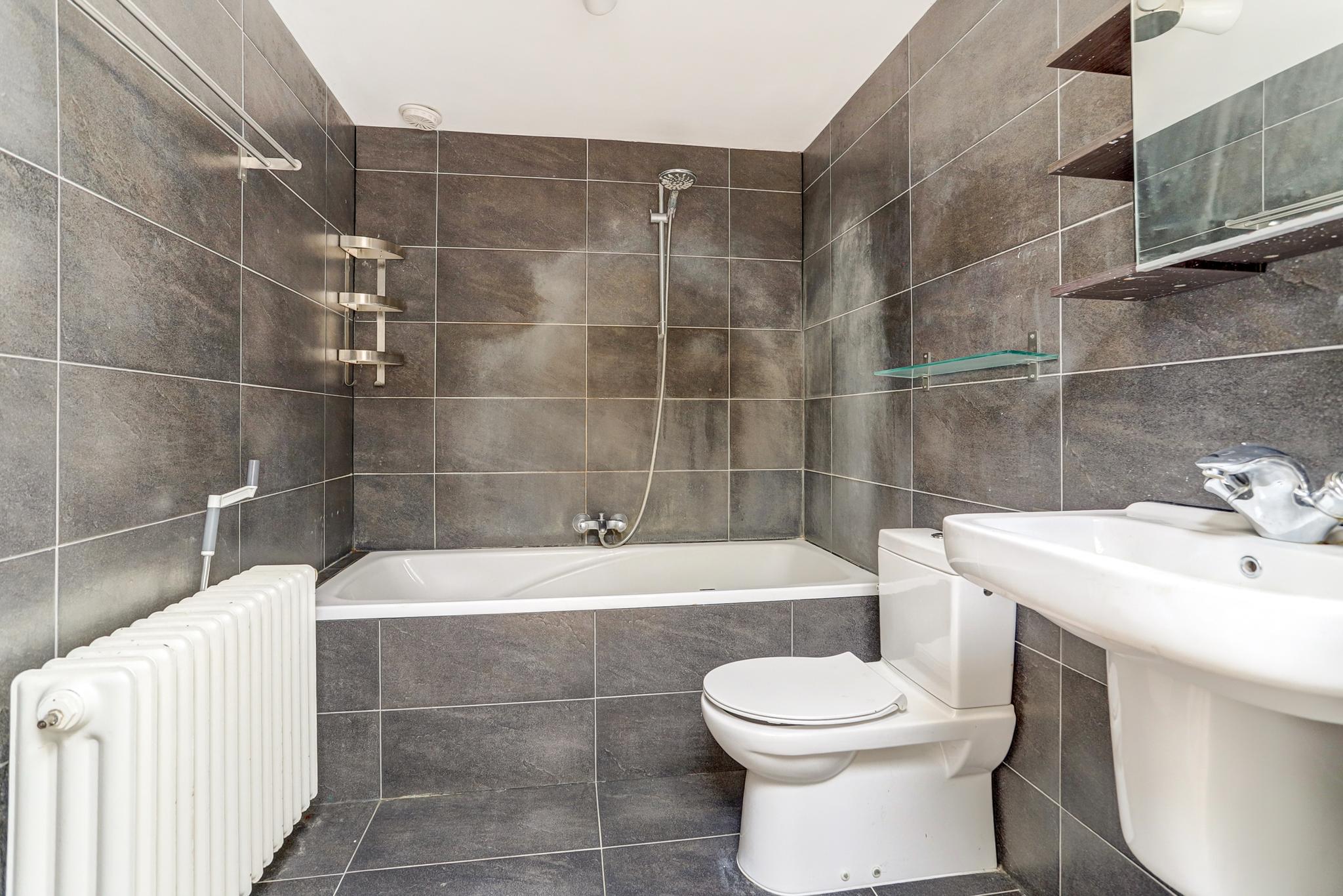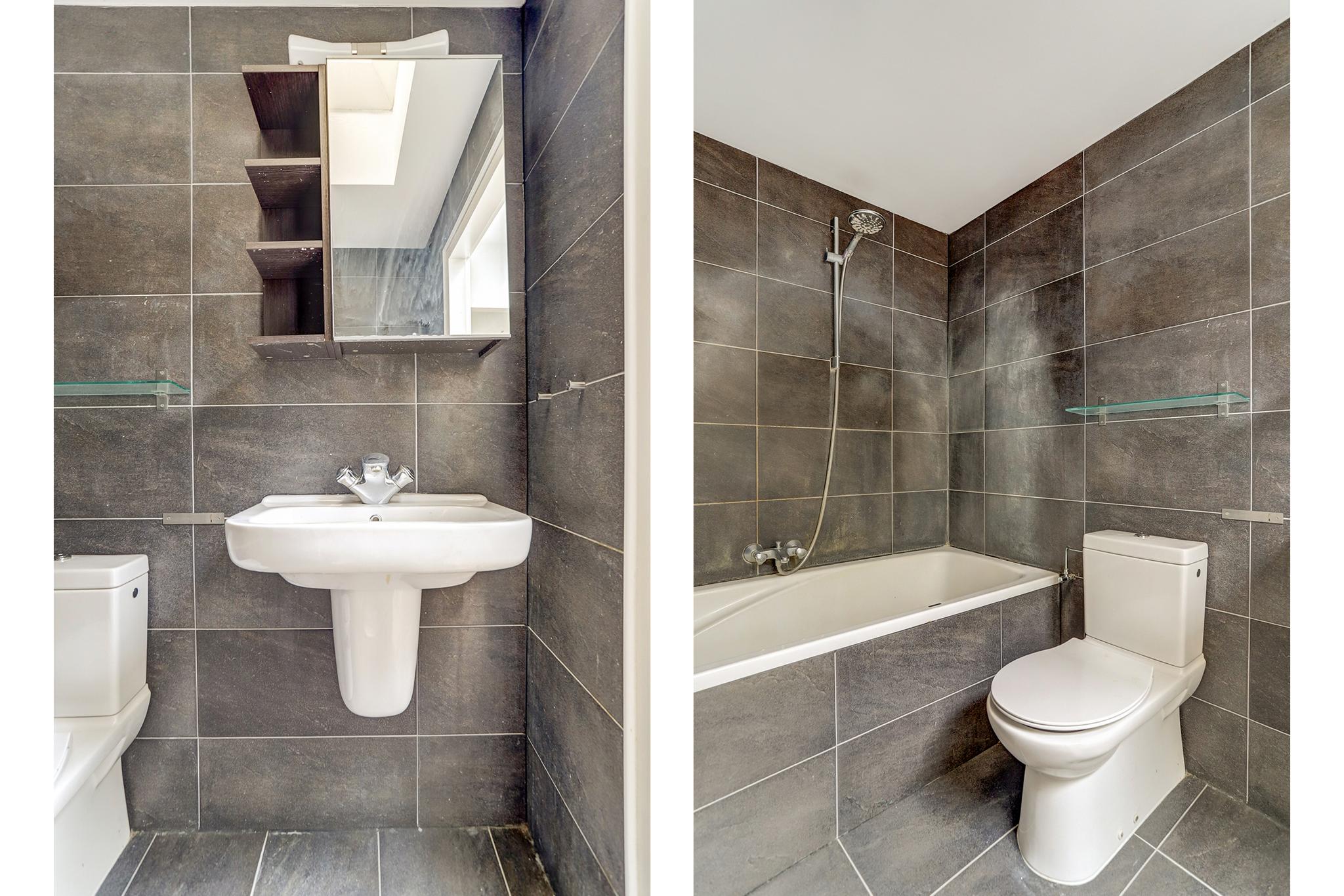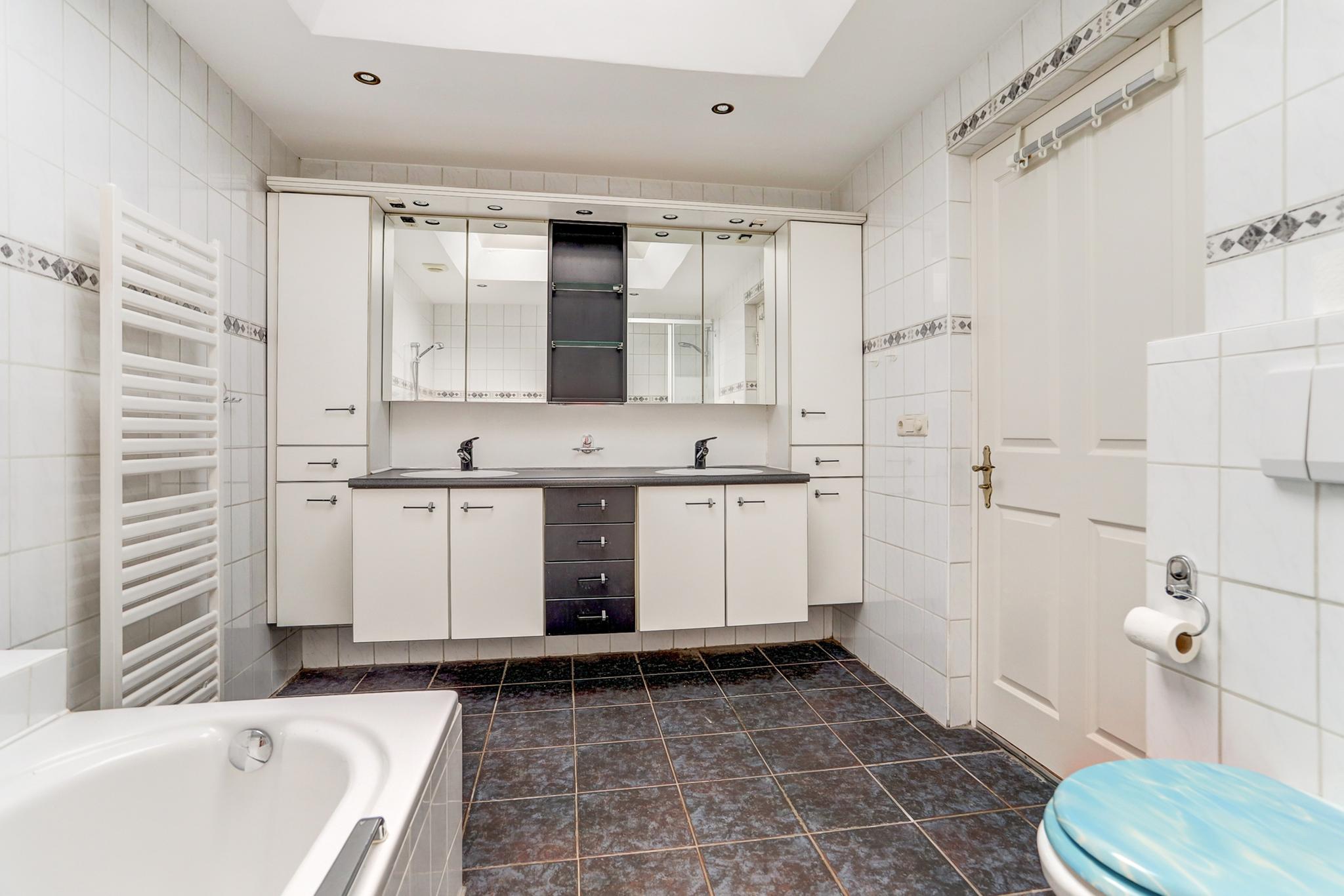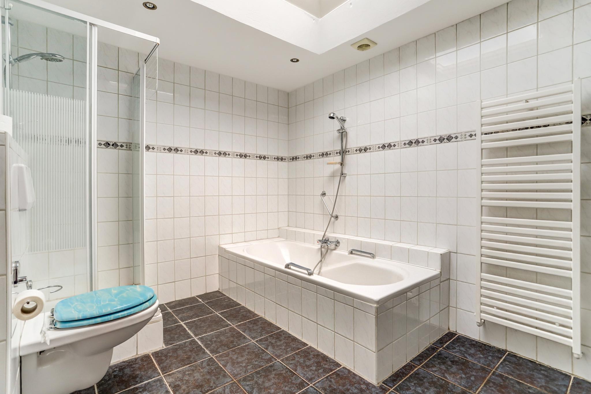 De betegelde badkamer is voorzien van een separate douche, ligbad, 3e toilet en een badmeubel met geïntegreerde dubbele wastafel.
