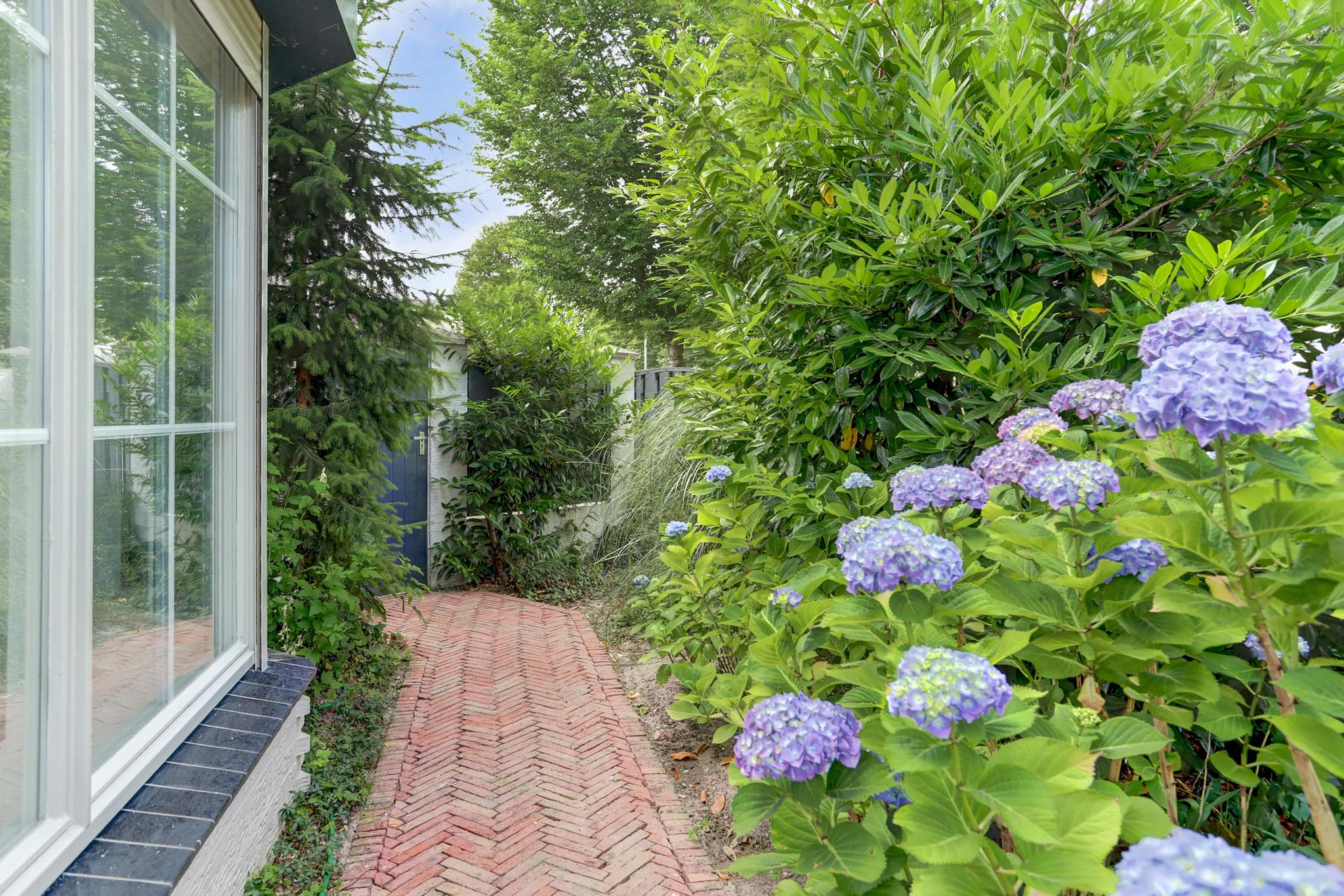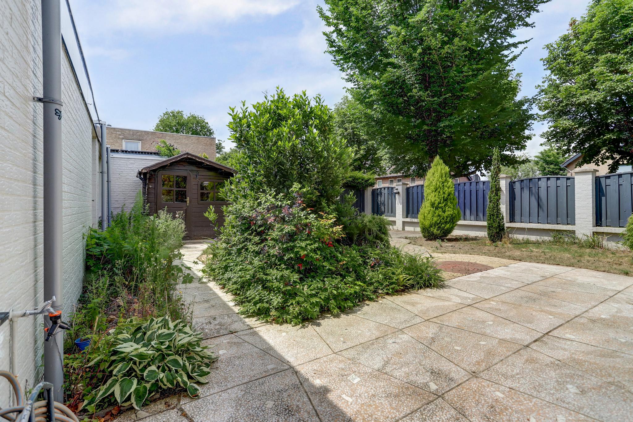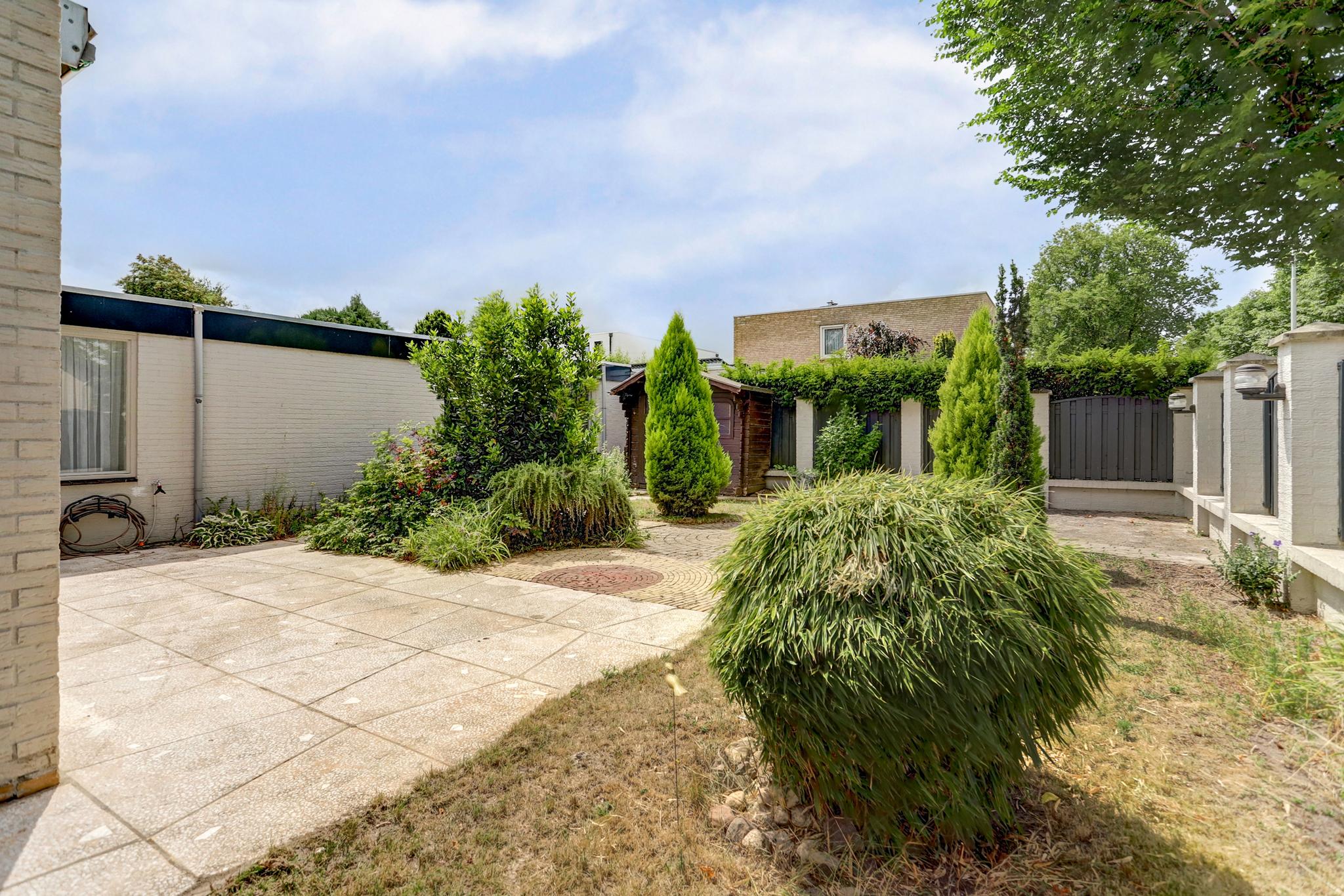 Achtertuin met een afsluitbare achterom en een gemetselde deels natuurlijke erfafscheiding en aangelegd met terassen, sierbestrating en diverse beplantingen.