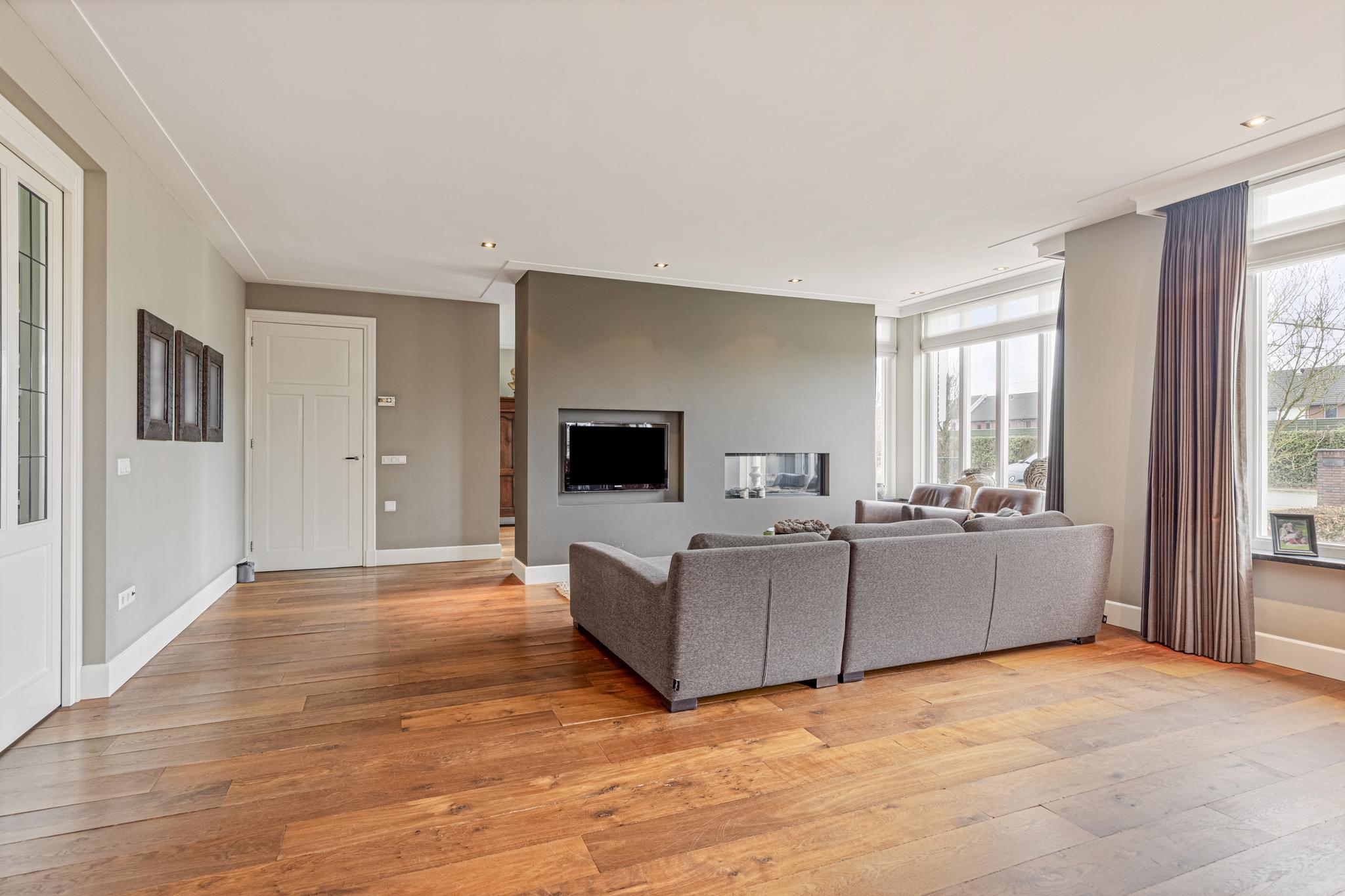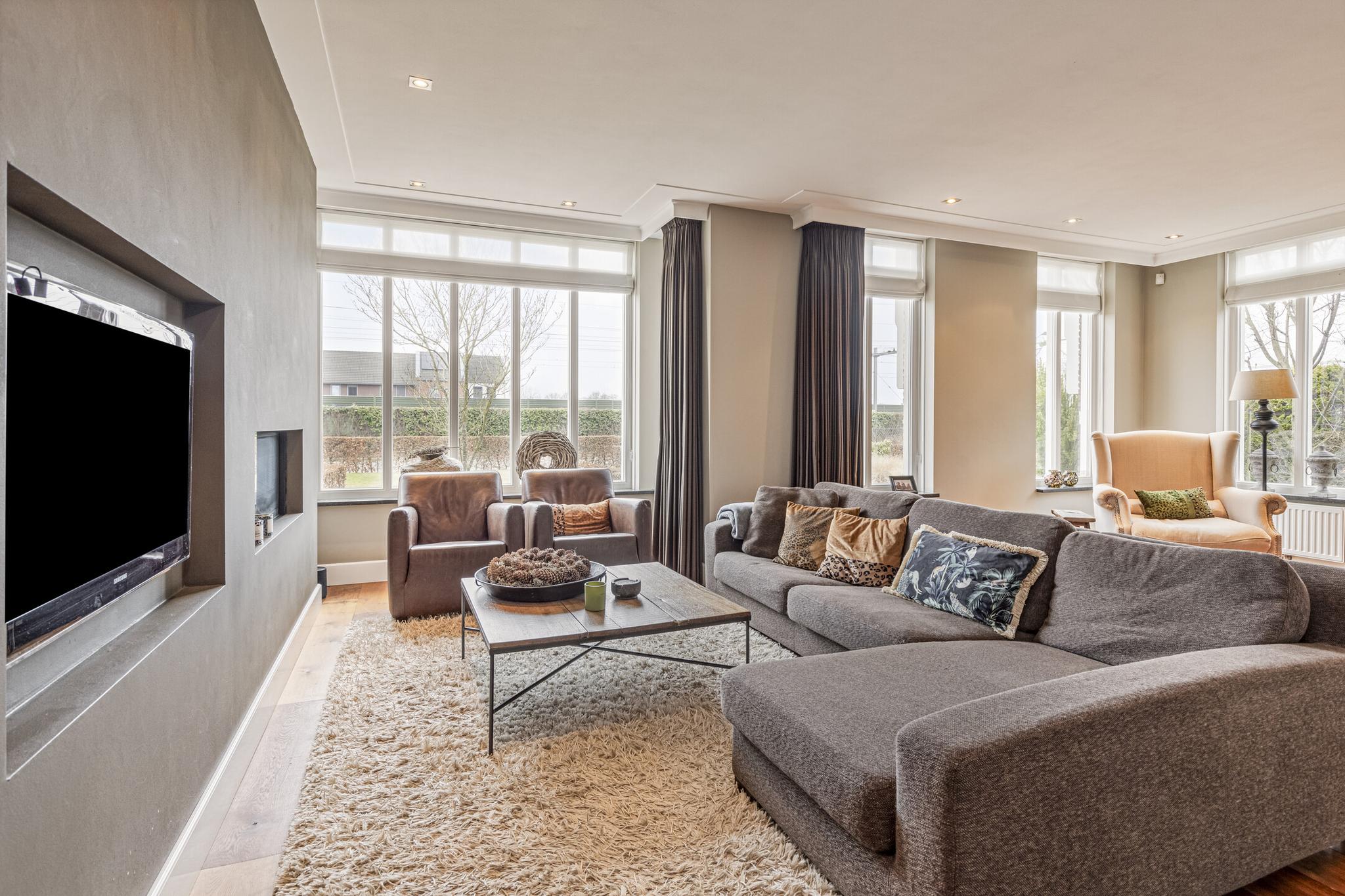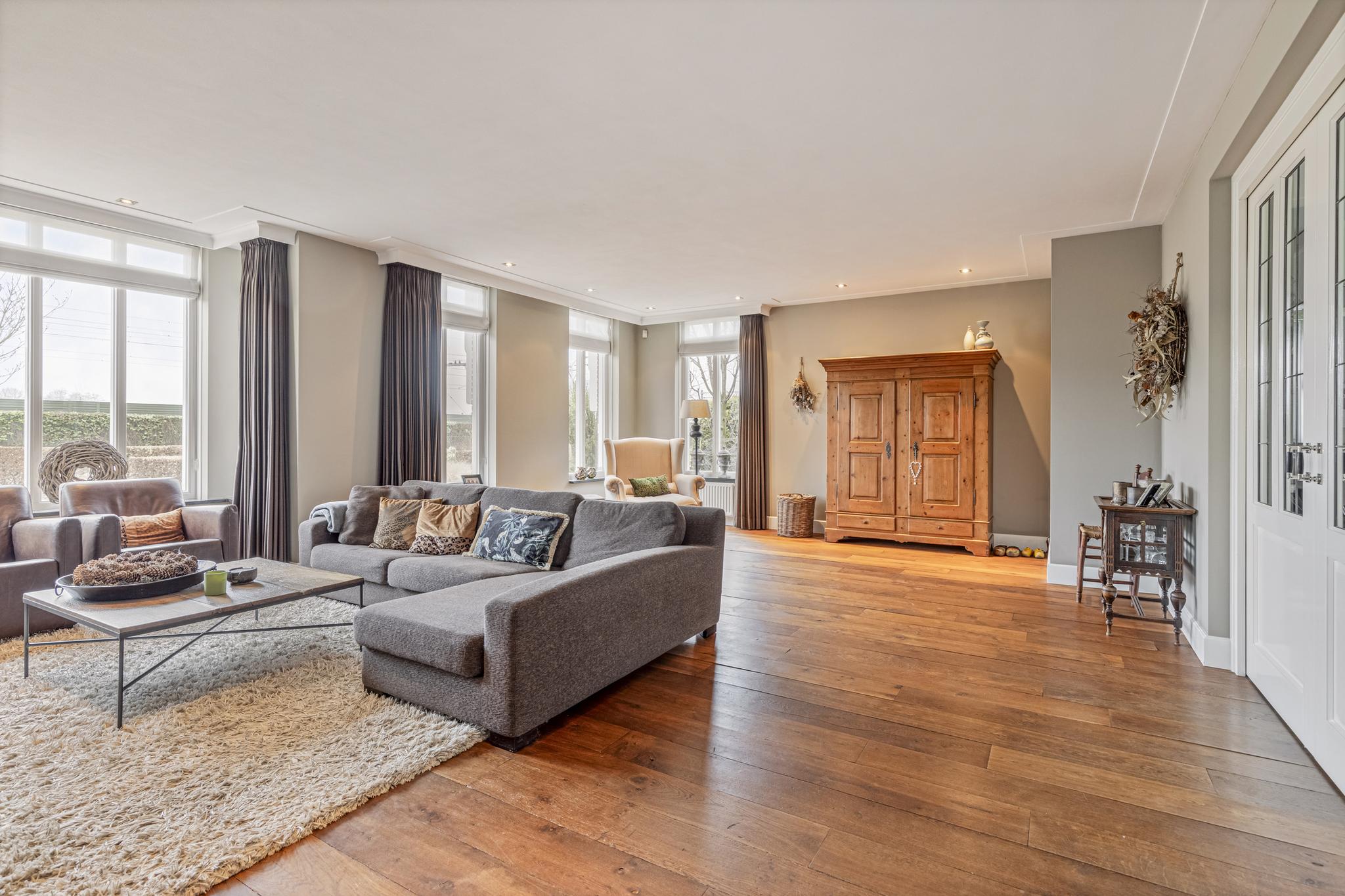 De royale sfeervolle living is afgewerkt met een massief houten delen vloer, stucwerk wanden en een stucwerk plafond met inbouwverlichting.