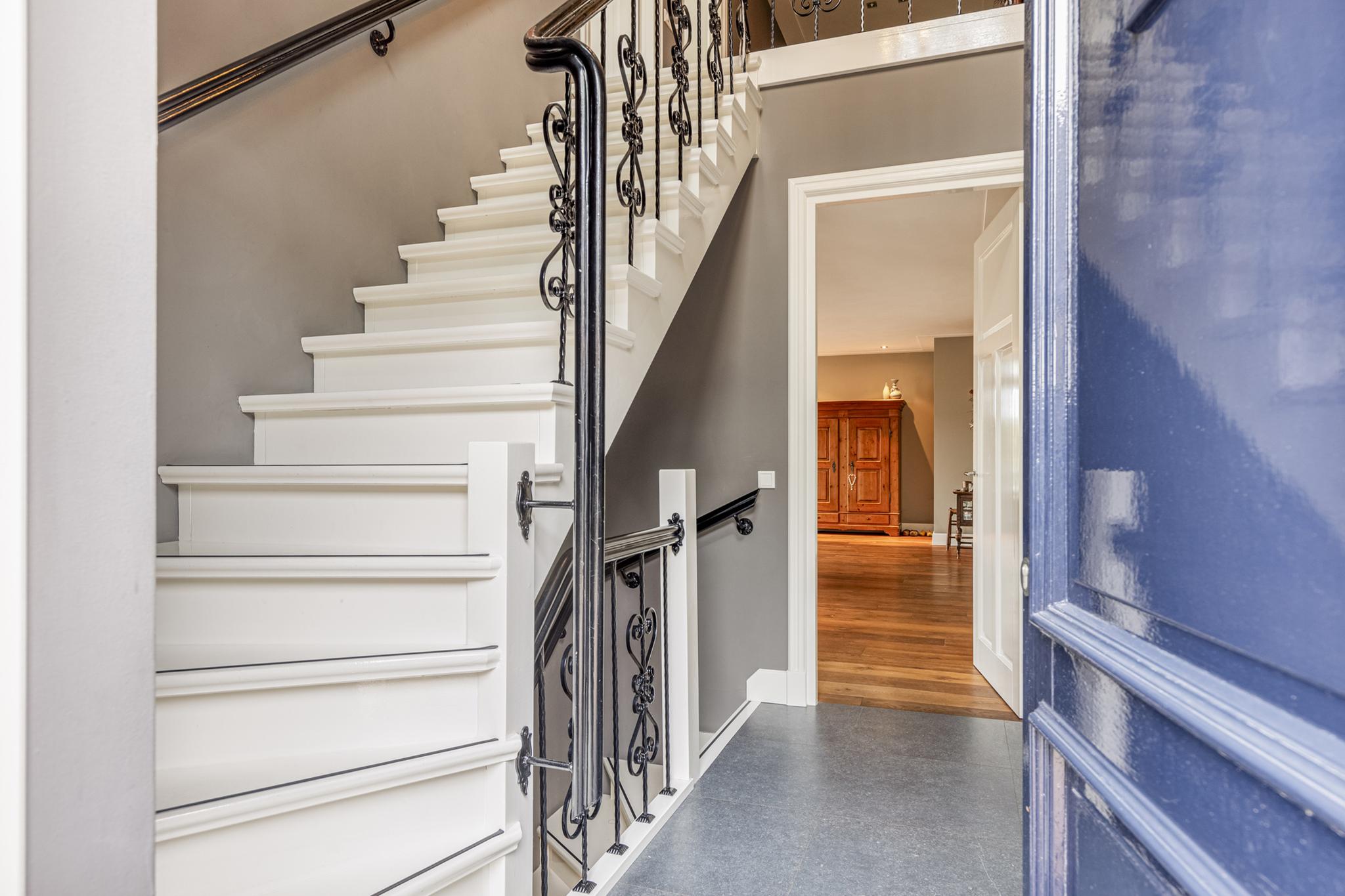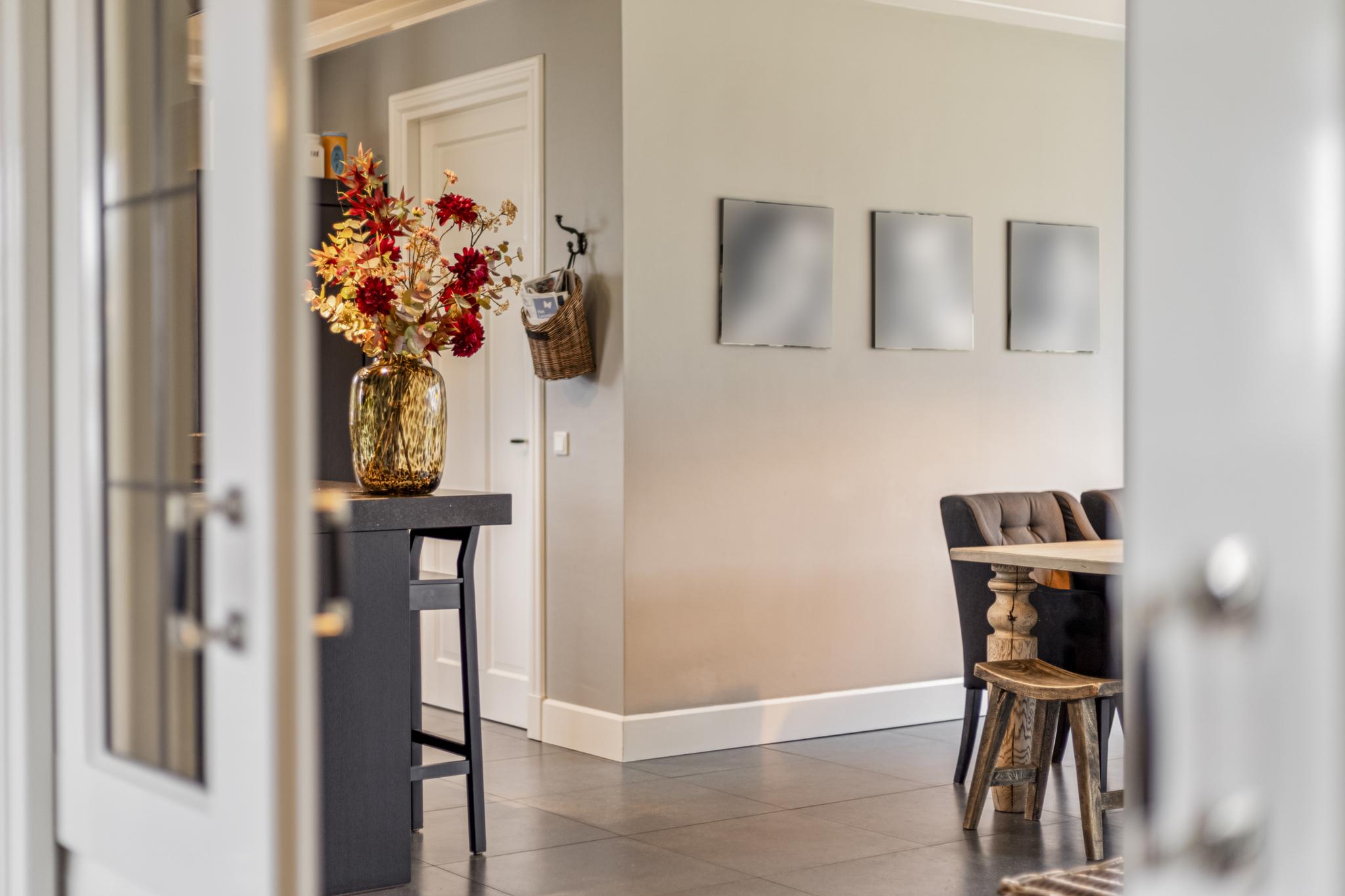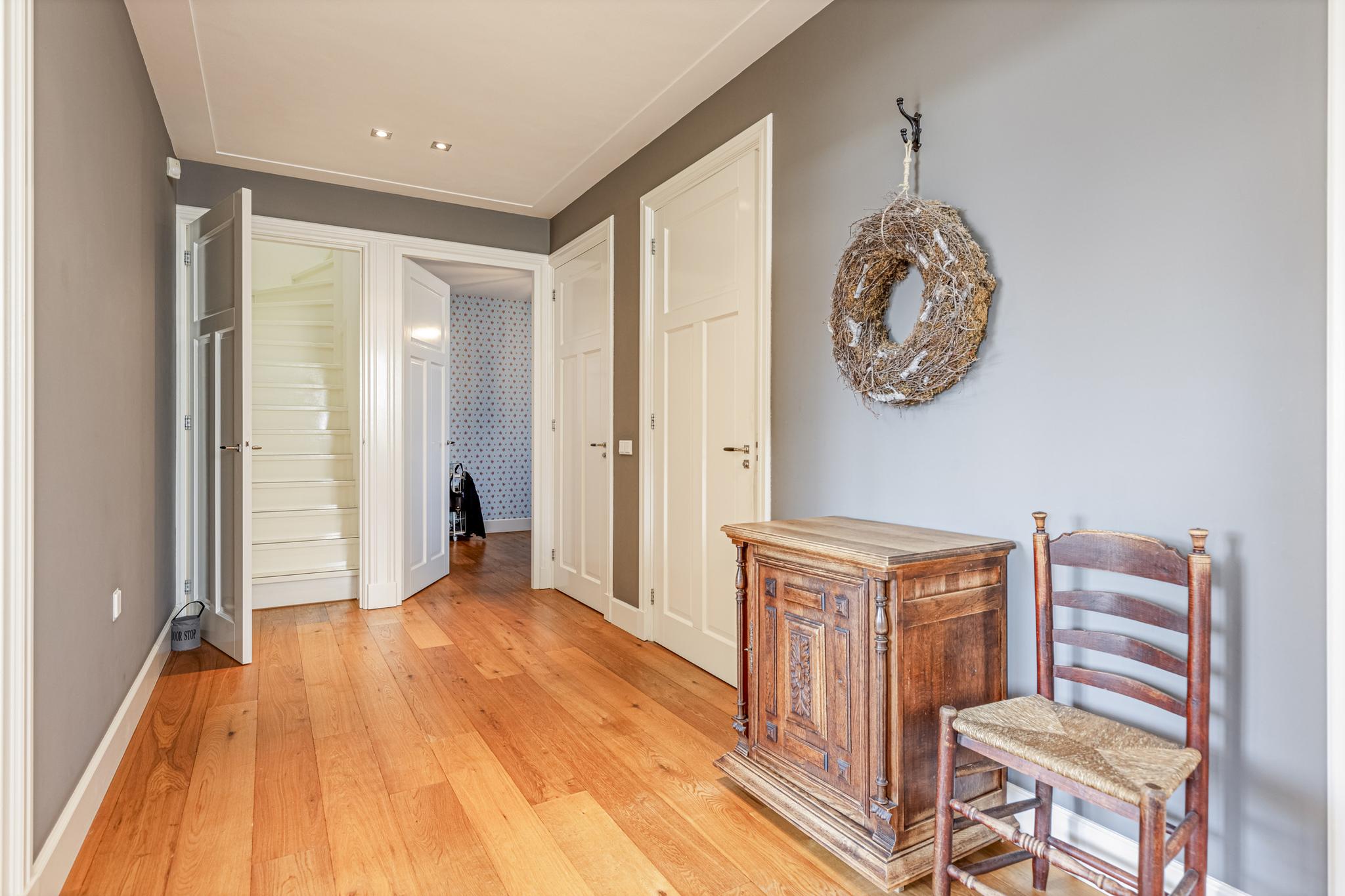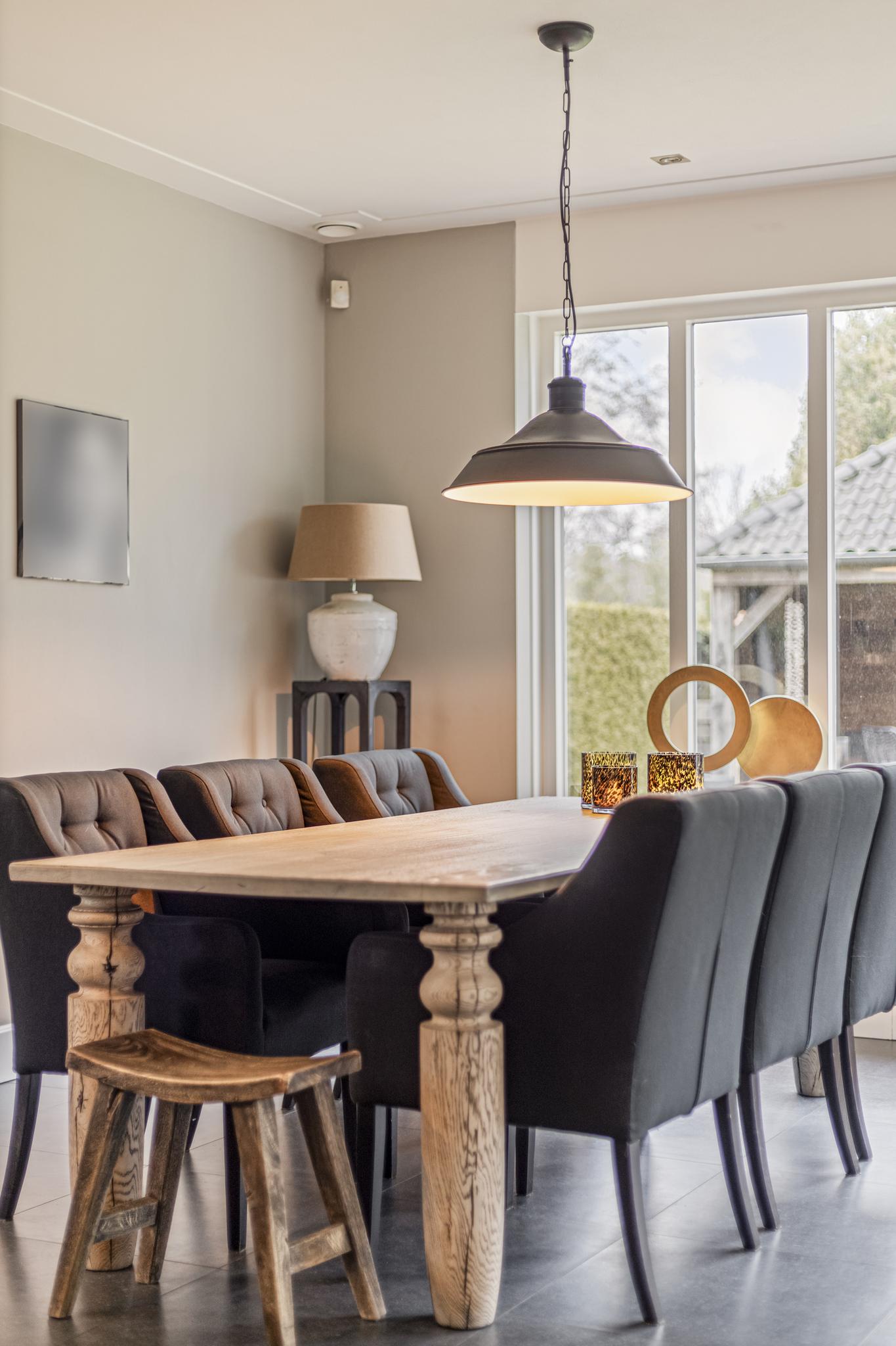 De royale sfeervolle living is afgewerkt met een massief houten delen vloer, stucwerk wanden en een stucwerk plafond met inbouwverlichting.