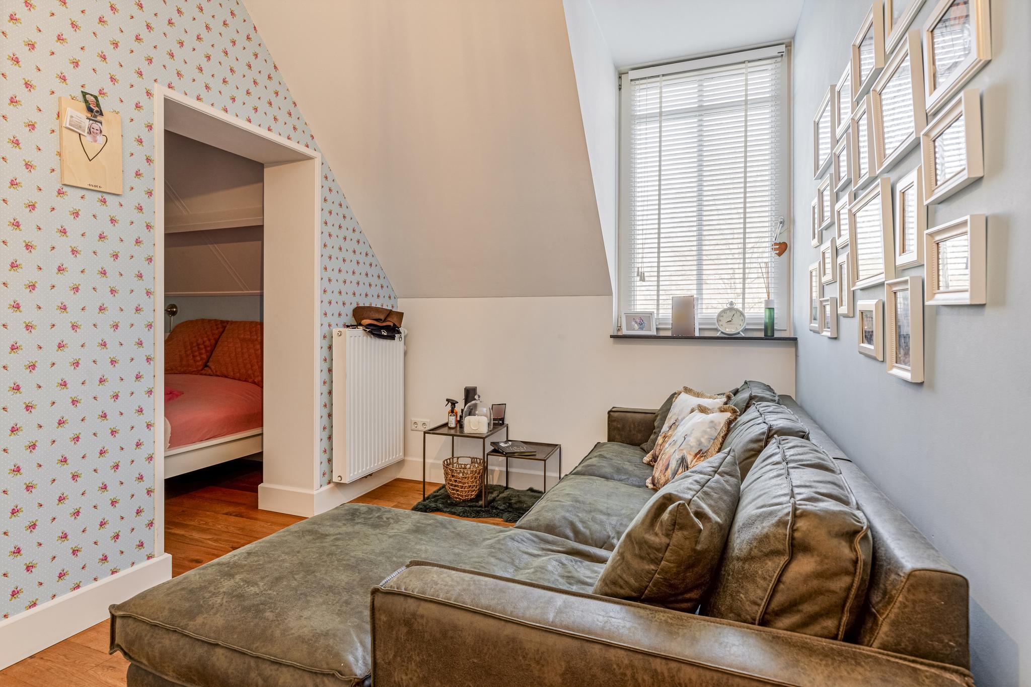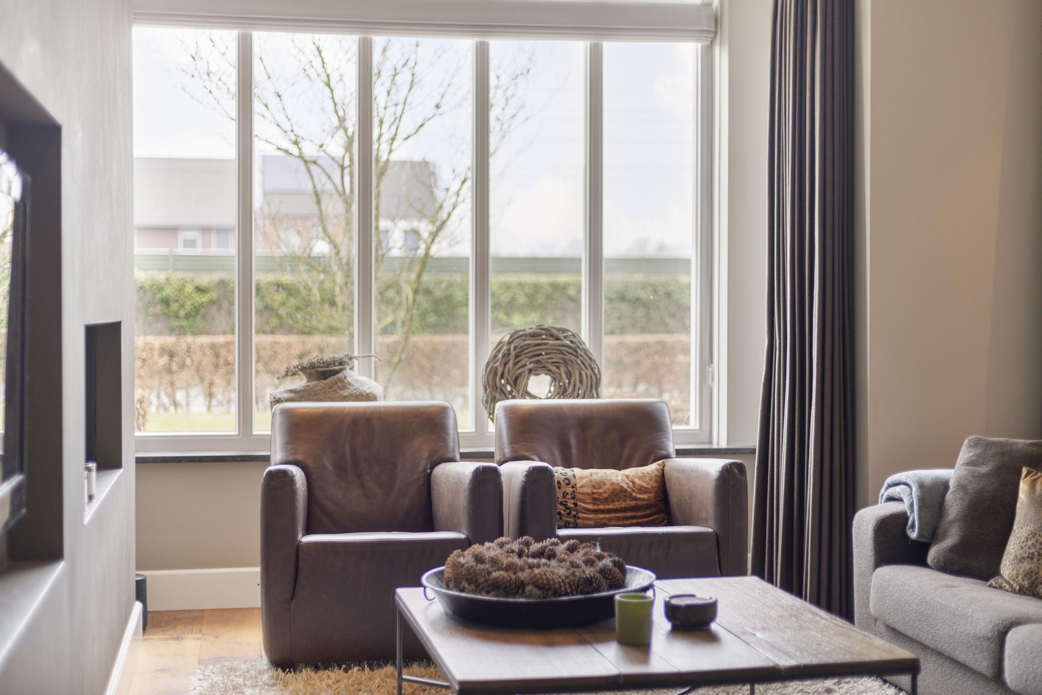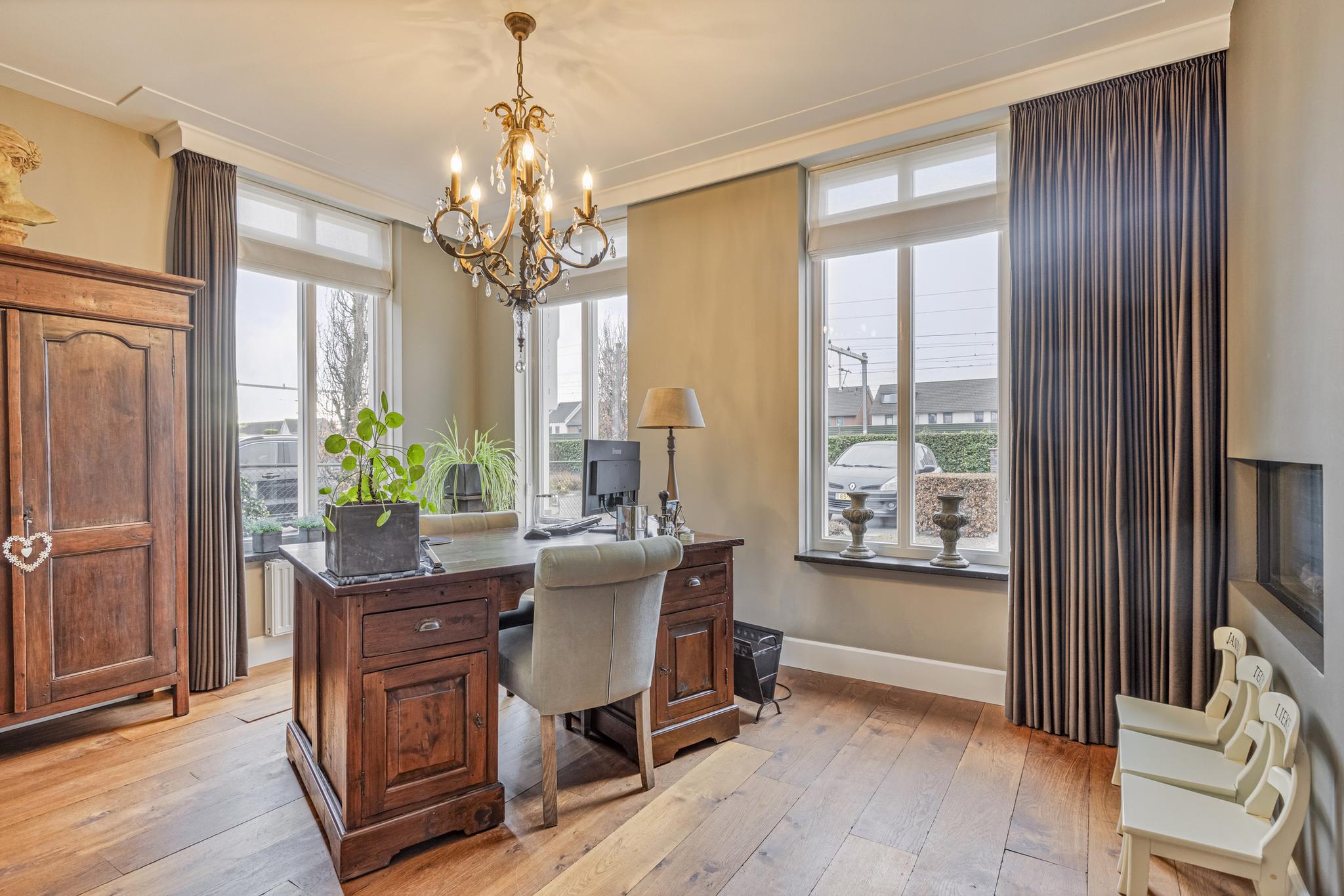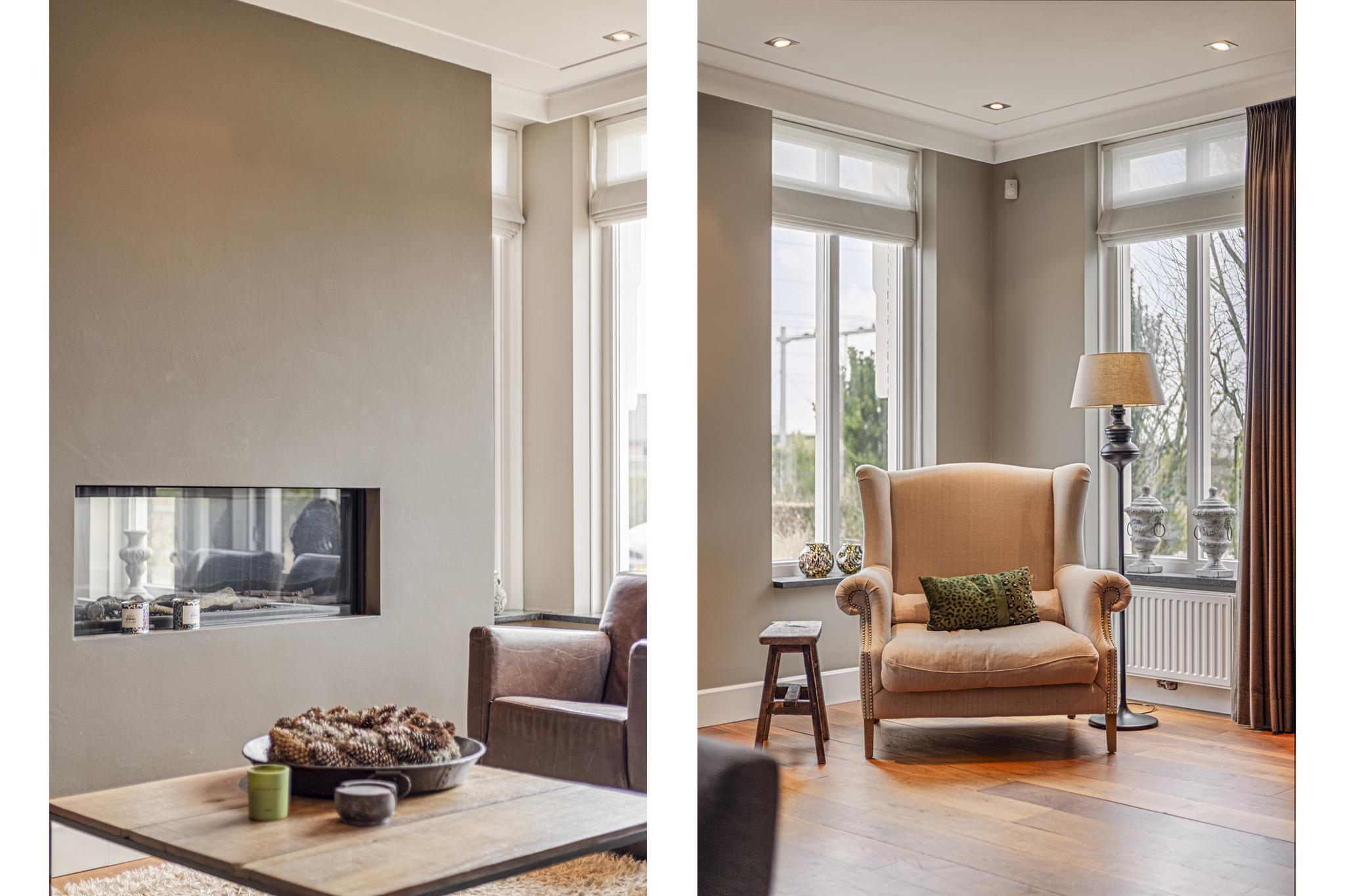 Deze woonkamer staat in open verbinding met de werkkamer die deels is afgescheiden met een tussenmuur waar de tunnel gashaard in is verwerkt die vanuit zowel de living en werkkamer is te aanschouwen.