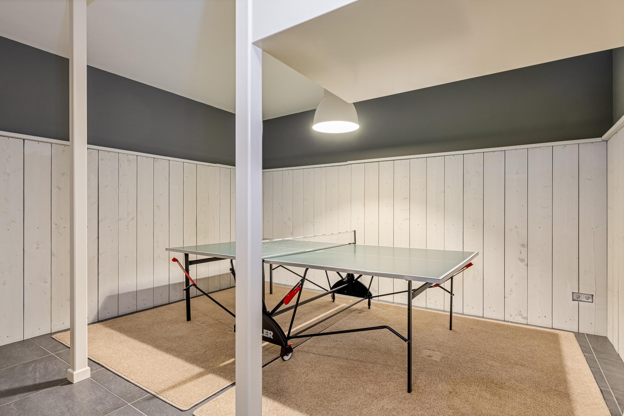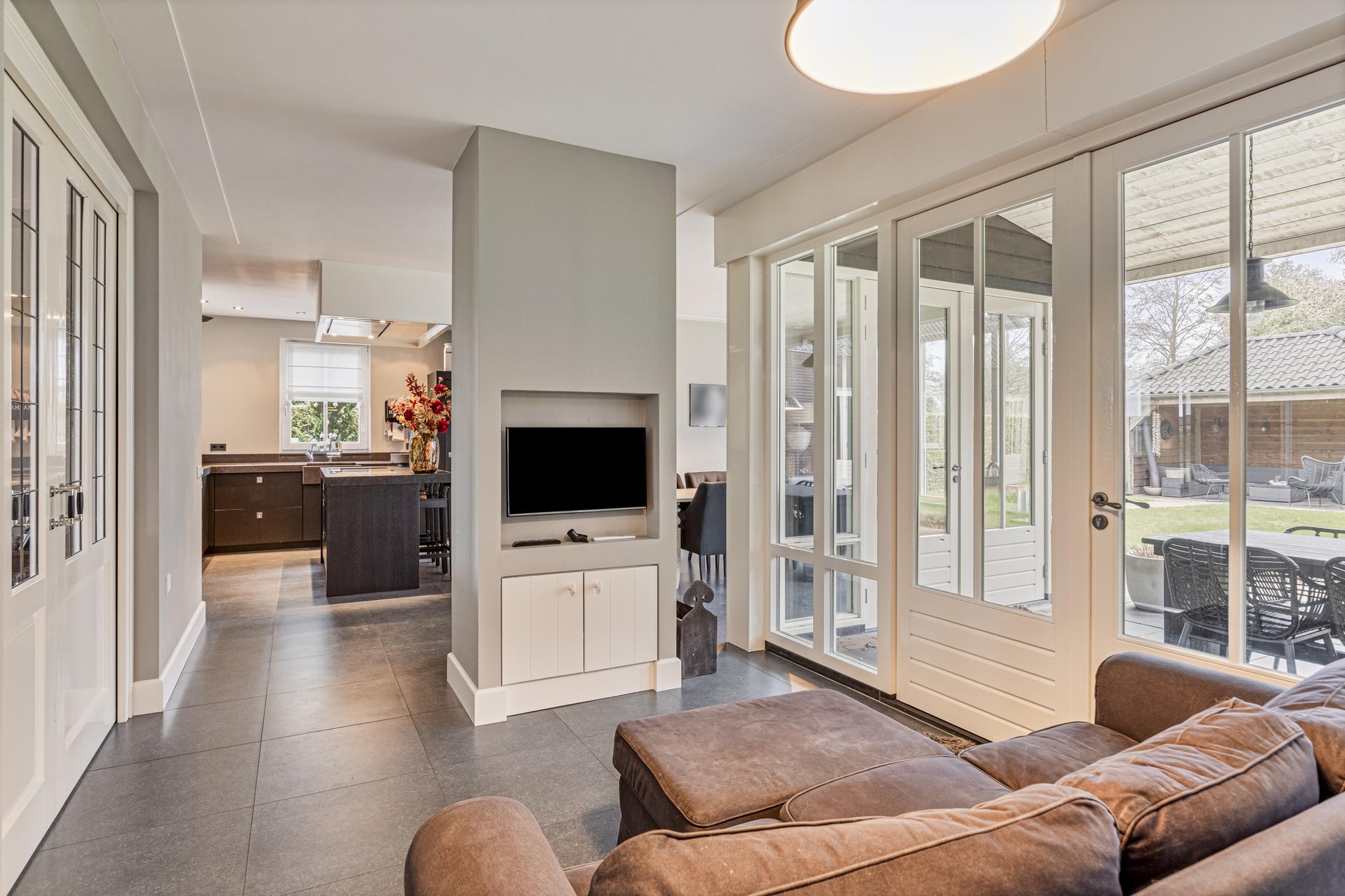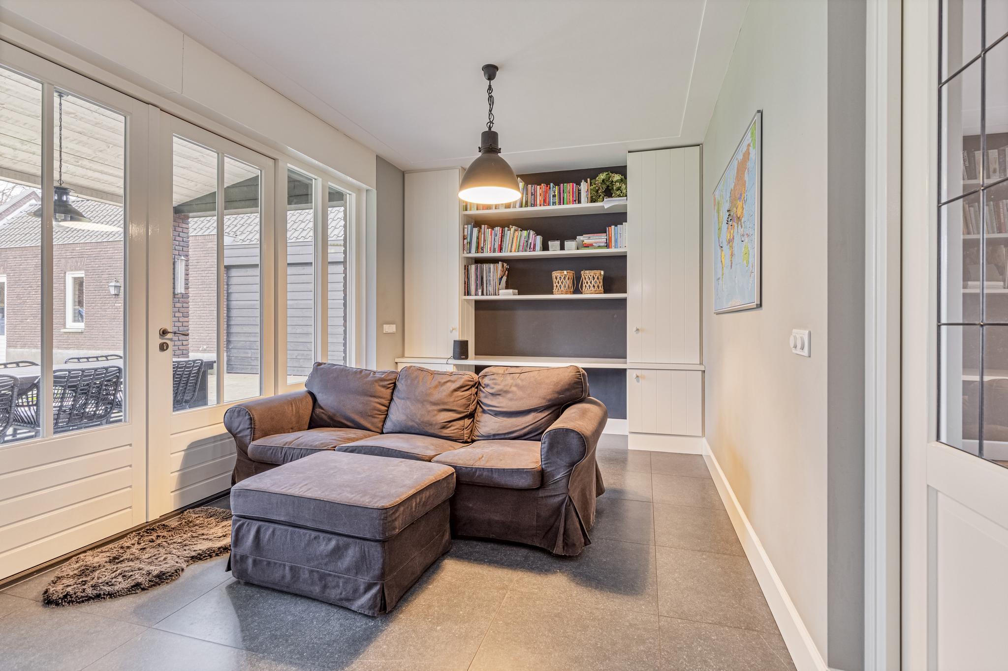 In open verbinding met de woonkeuken bevind zich de extra speelruimte met openslaande tuindeuren naar de overdekt terras en ingericht met een maatkast.