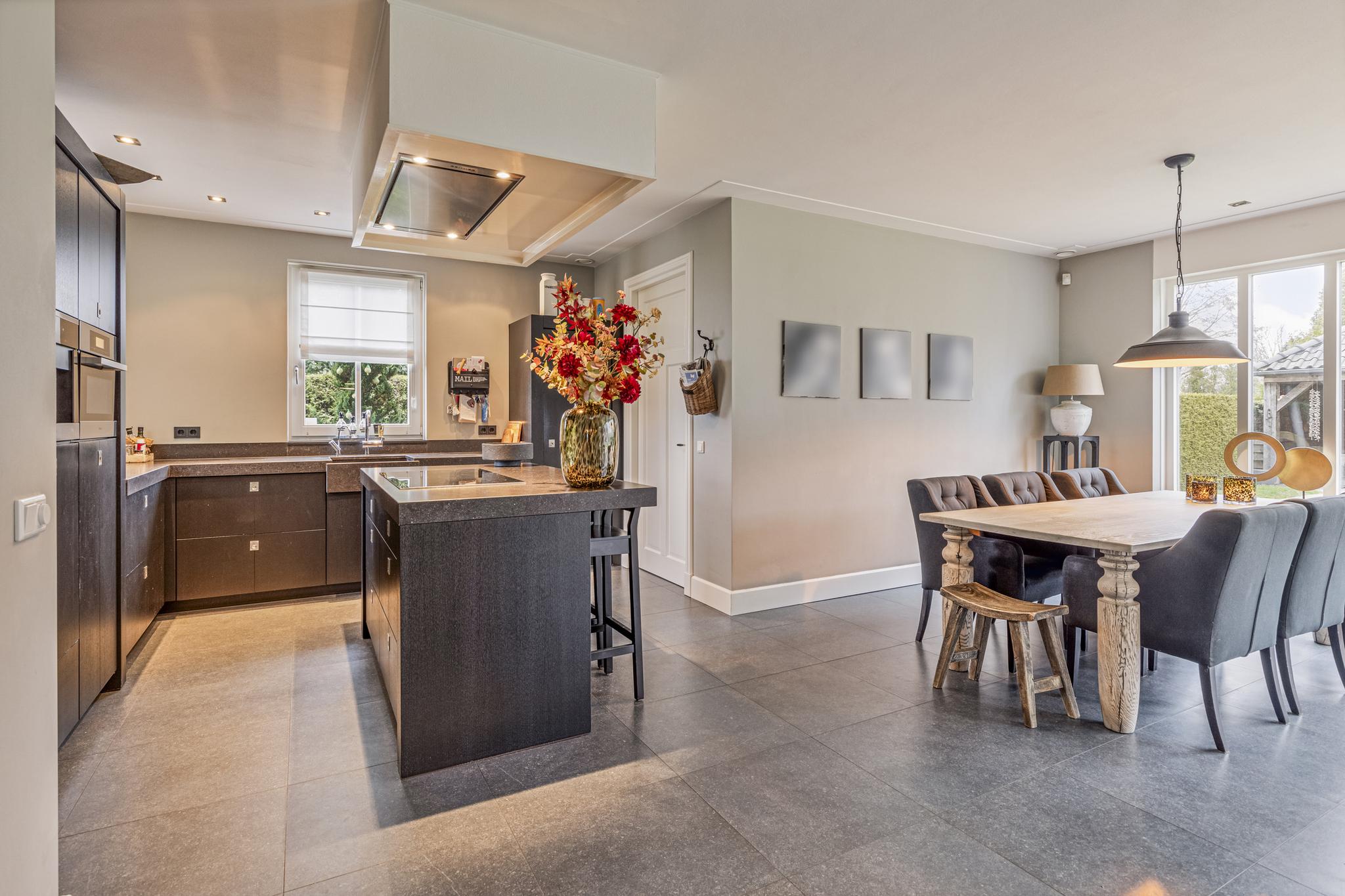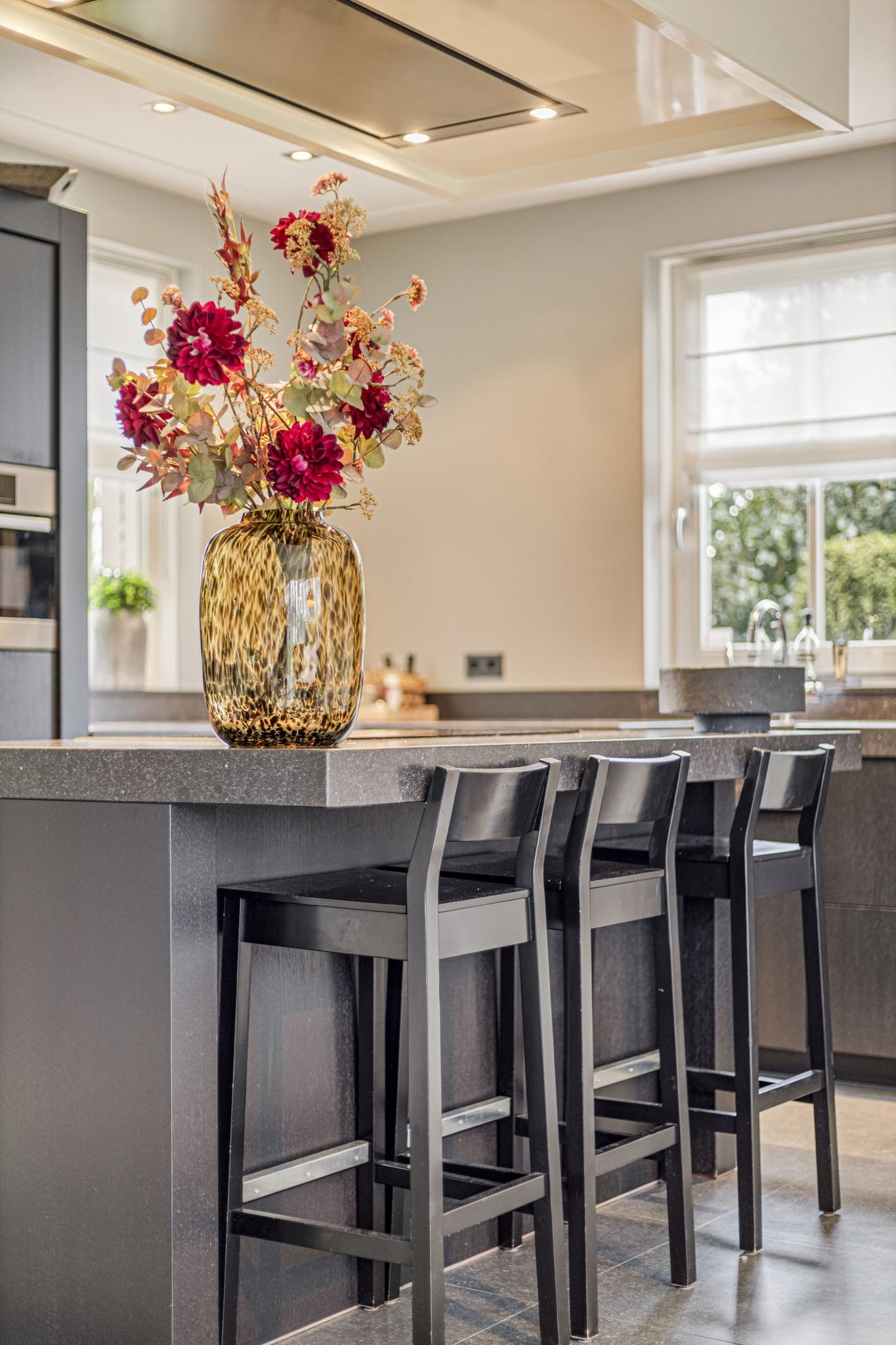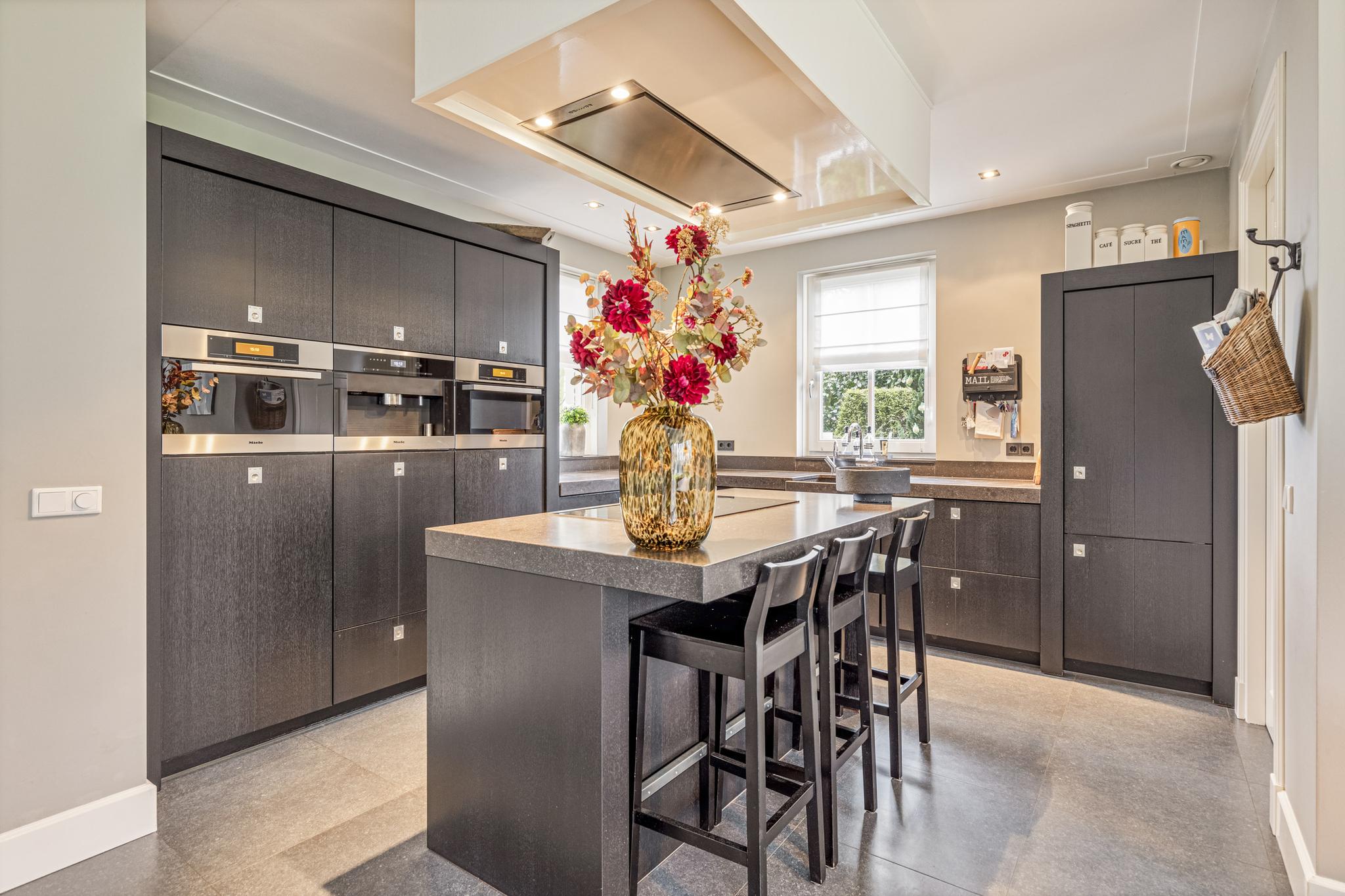 De luxe keukeninrichting is ingericht met een kookeiland met een inductie kookplaat waaraan ook de gezellige eetbar is gevestigd.