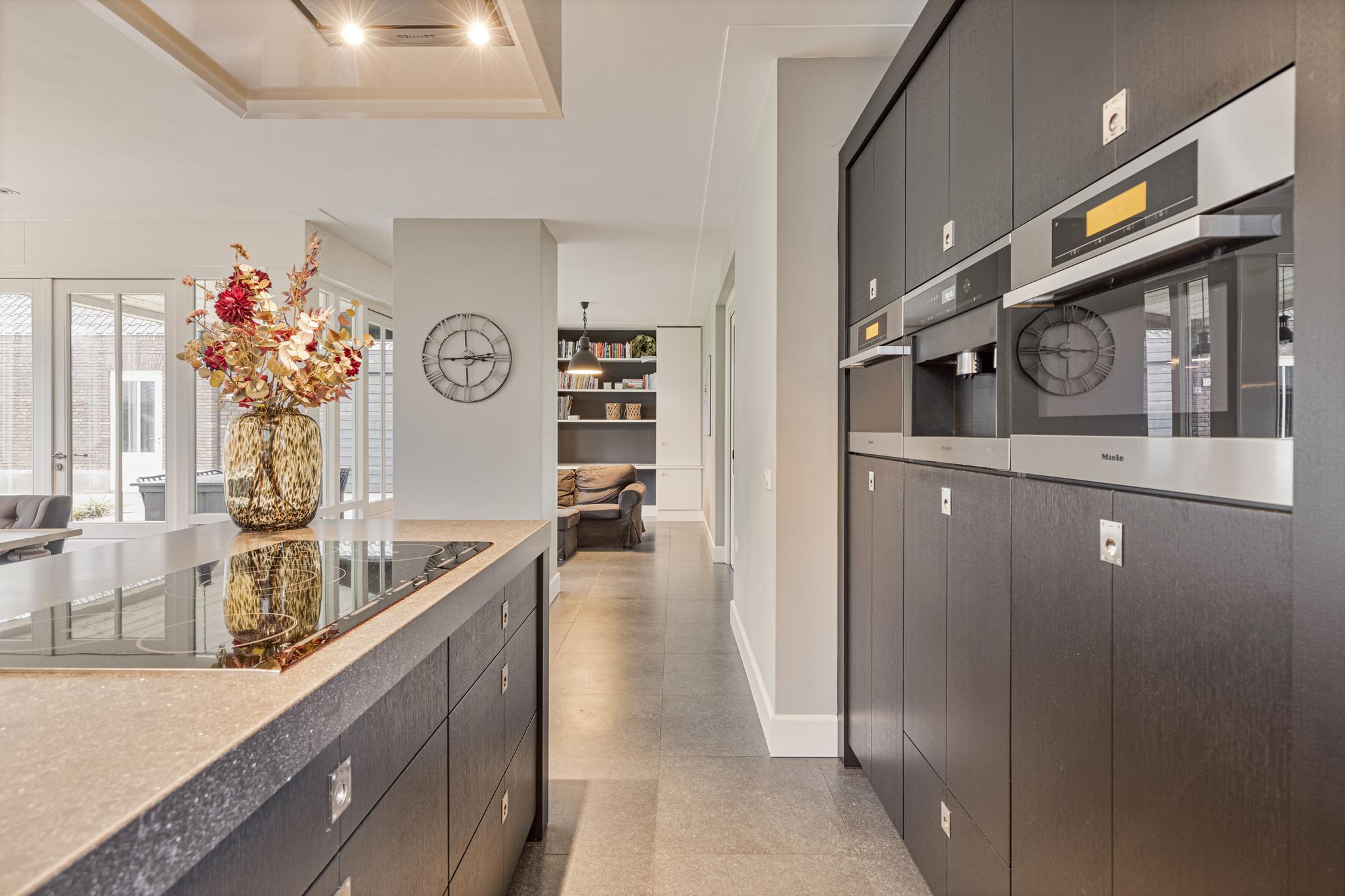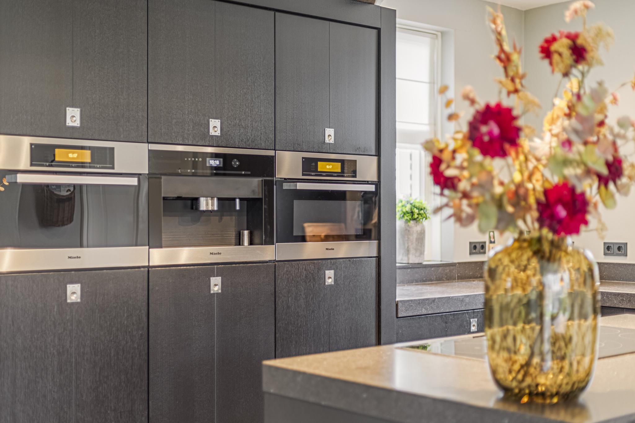 De wandopstelling van de keuken is voorzien van diverse laden en kasten met de Miele inbouwapparatuur zoals de stoomoven, combi oven/magnetron, koffie automaat, Quooker warmwater kraan, geïntegreerde spoelbak en een composiet werkblad.