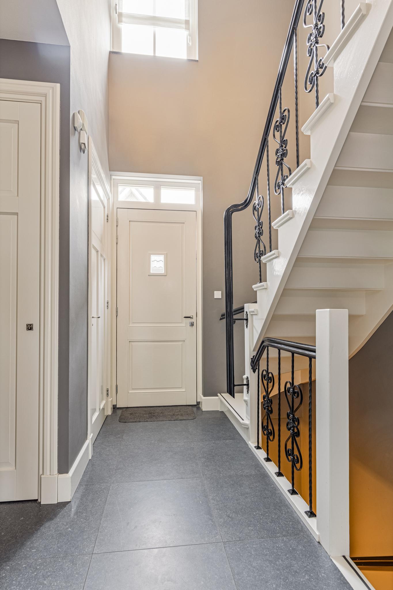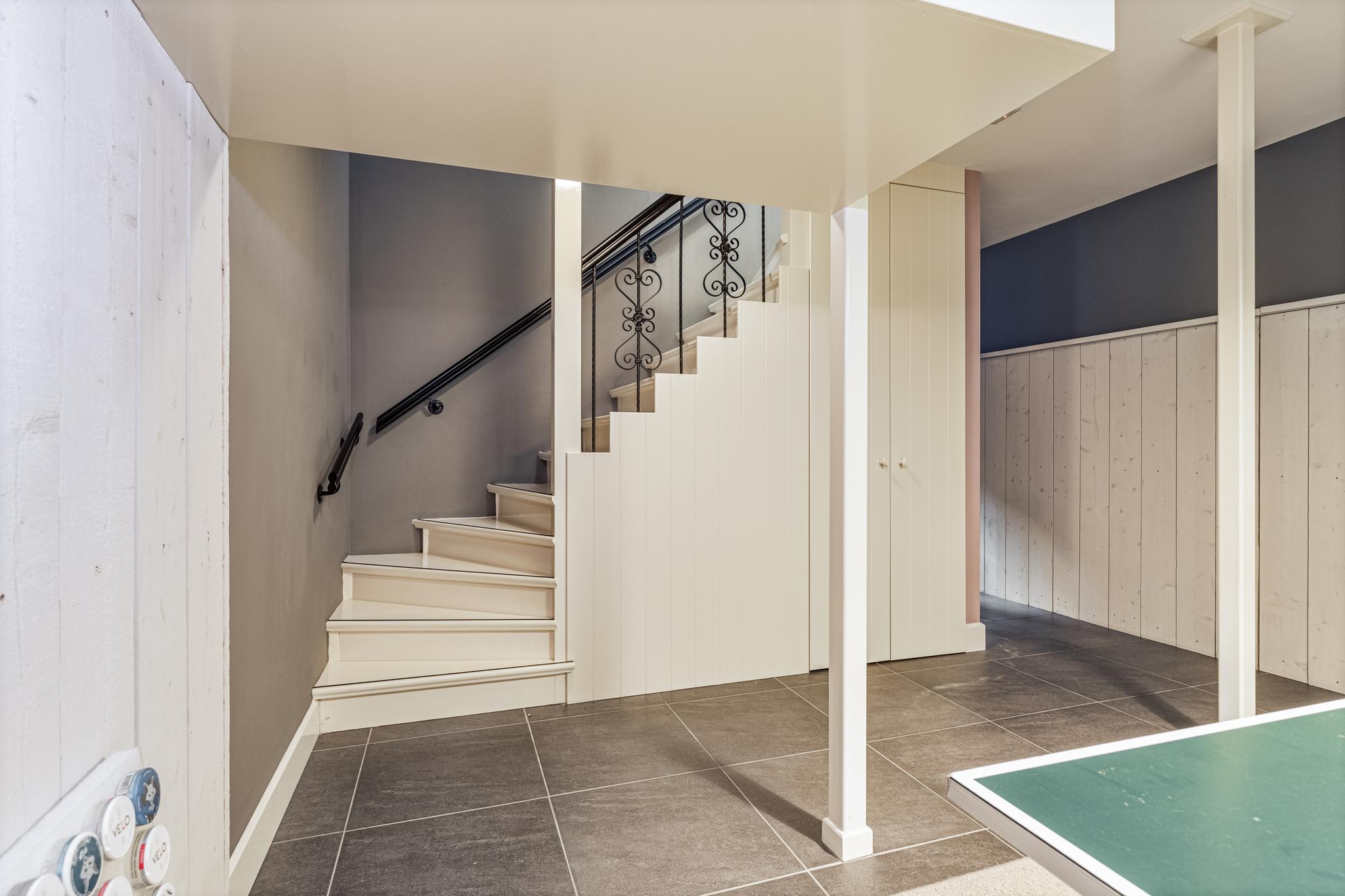 Ruimte 1 met een trapkast is afgewerkt met een tegelvloer, stucwerk deels houten delen wanden en een stucwerk plafond.