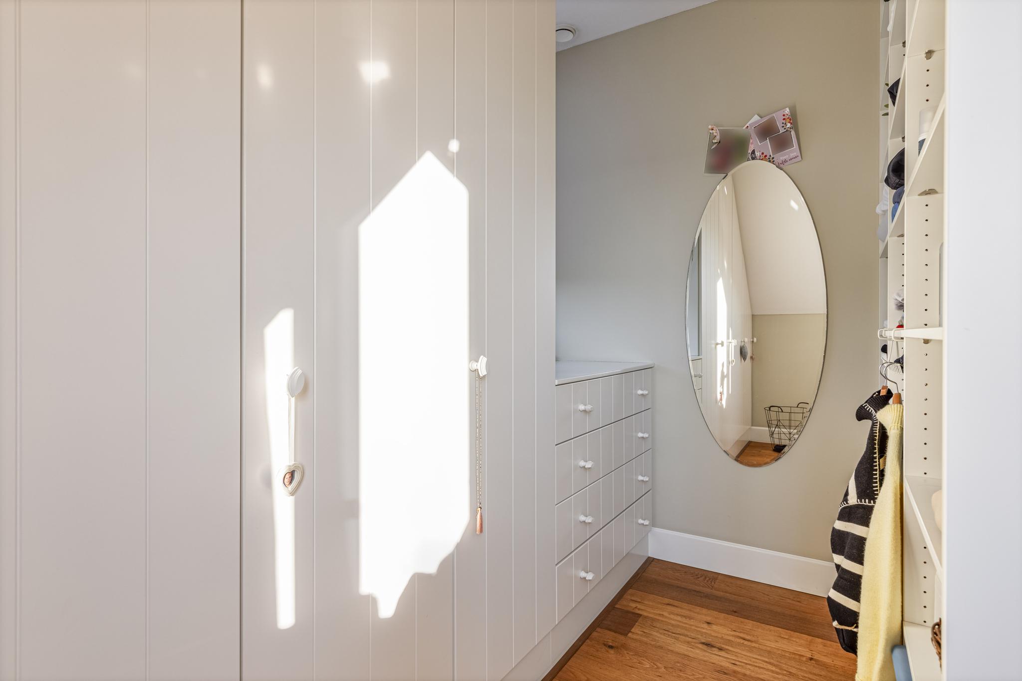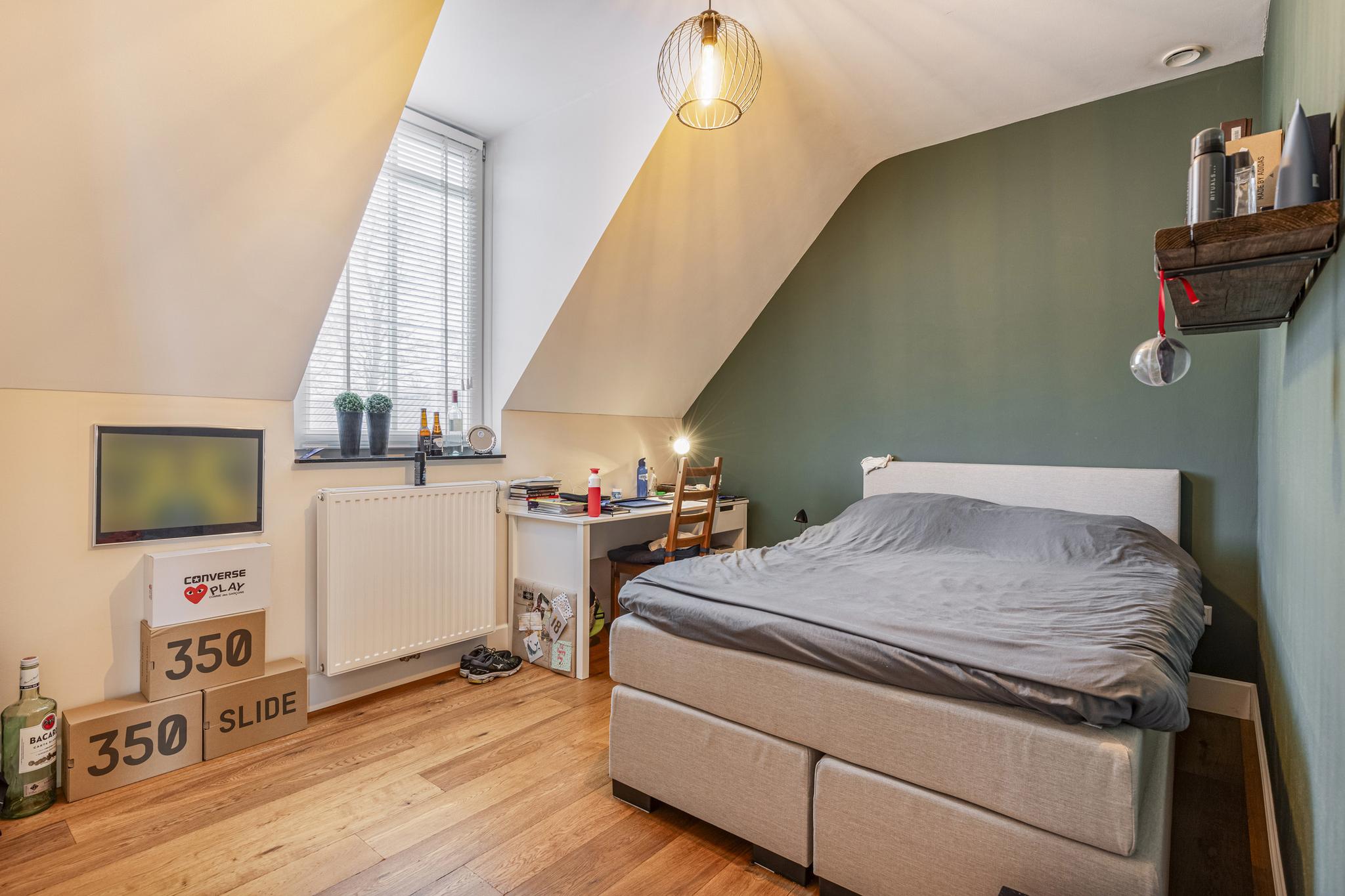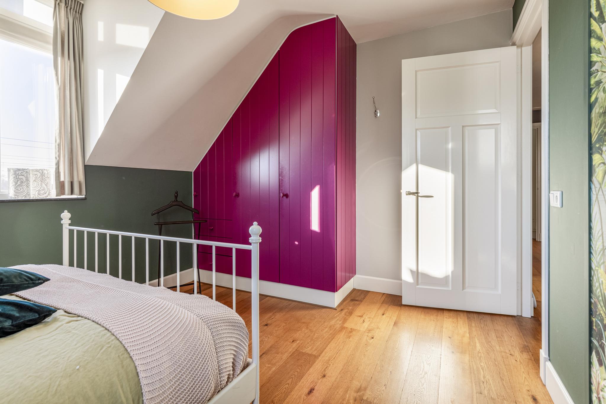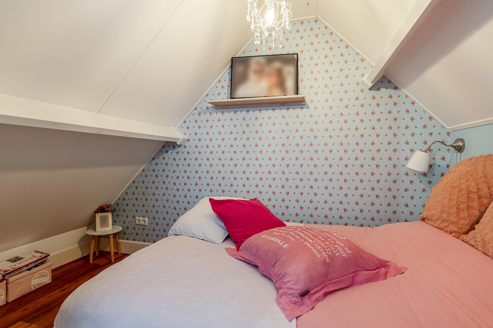 Slaapkamer 4 aan achterzijde betreft een leuke speelse kamer met een apart open slaapgedeelte en een praktische trapkast met legschappen.