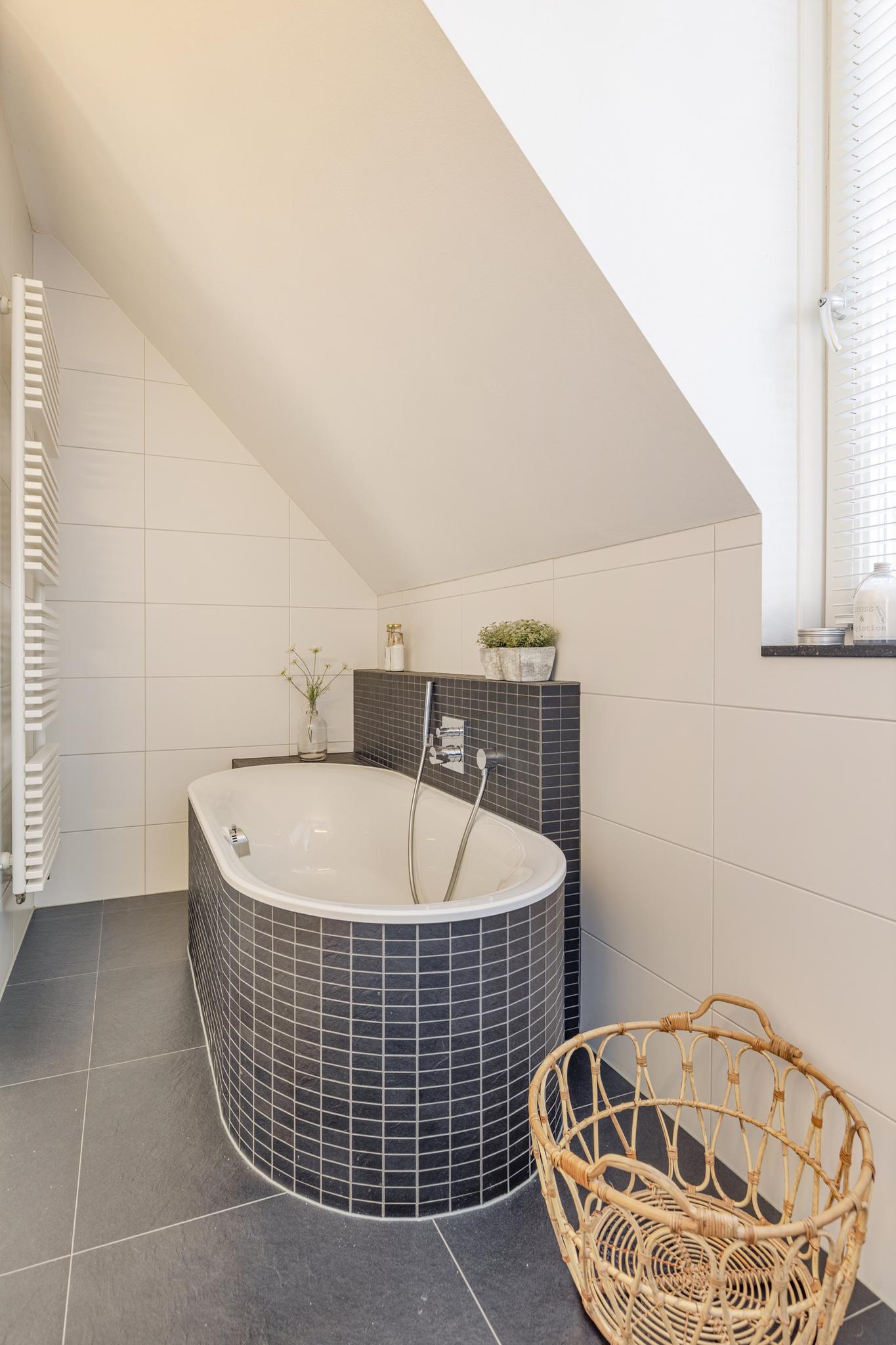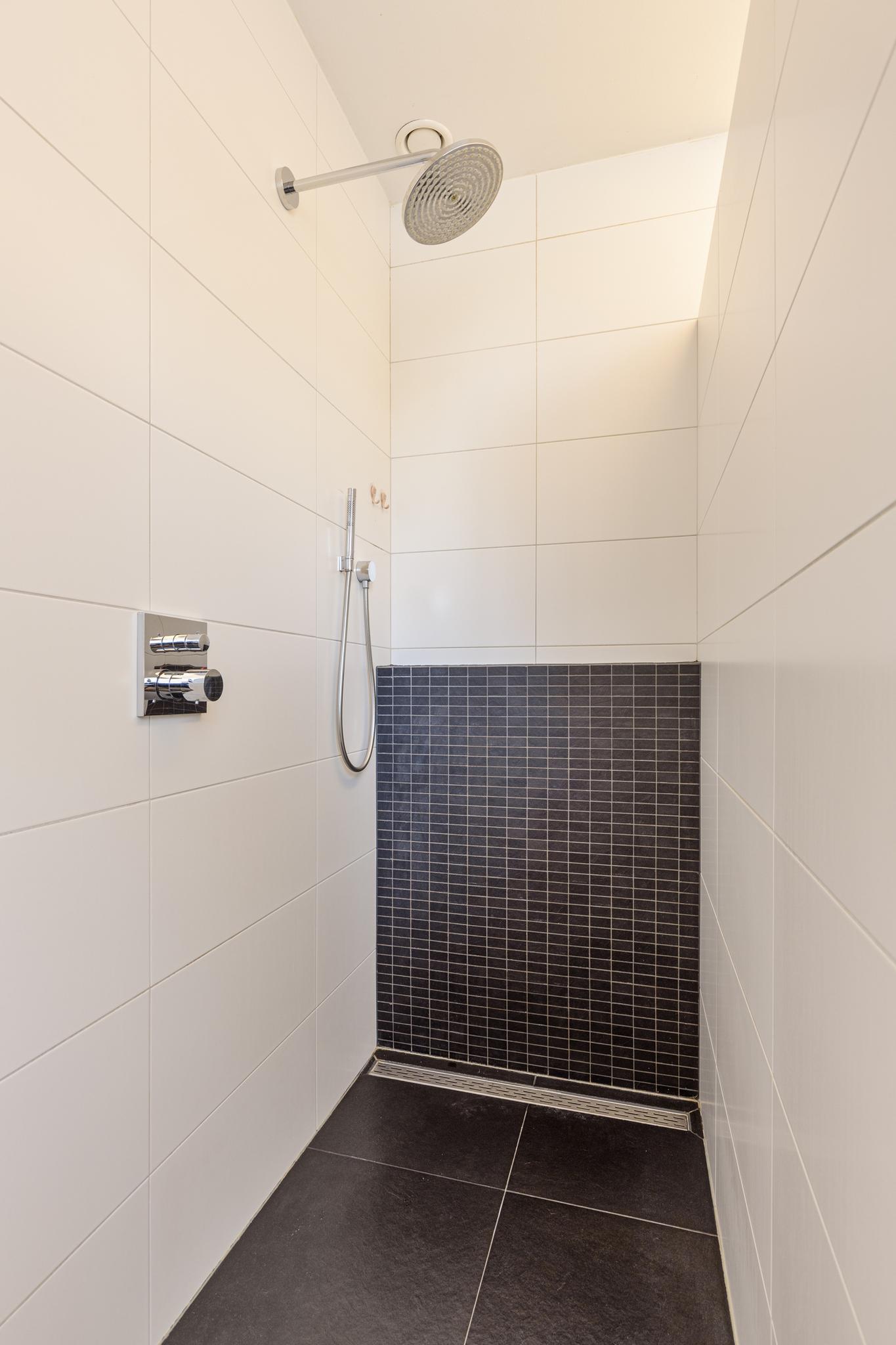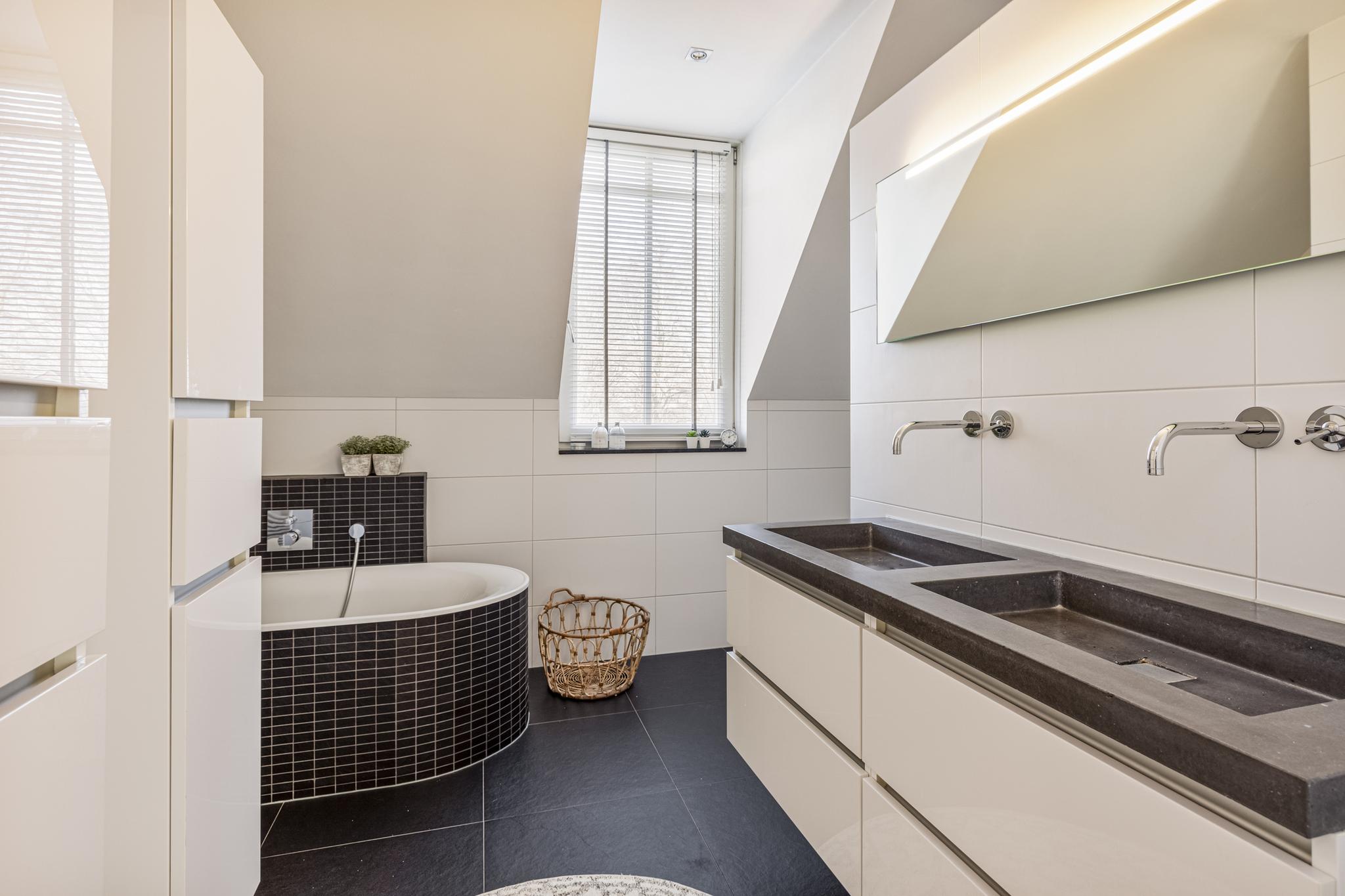 De luxe ruime badkamer is geheel betegeld en is voorzien van een badmeubel met een dubbele geïntegreerde wastafel, kunststof duo ligbad, open inloopdouche met thermostaatkraan en regendouche, design radiator en 2 wandkasten.