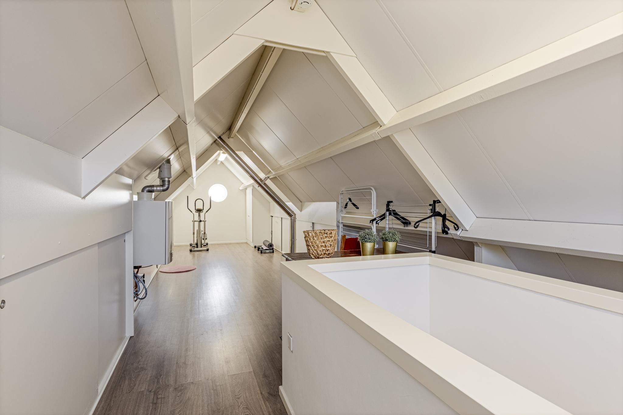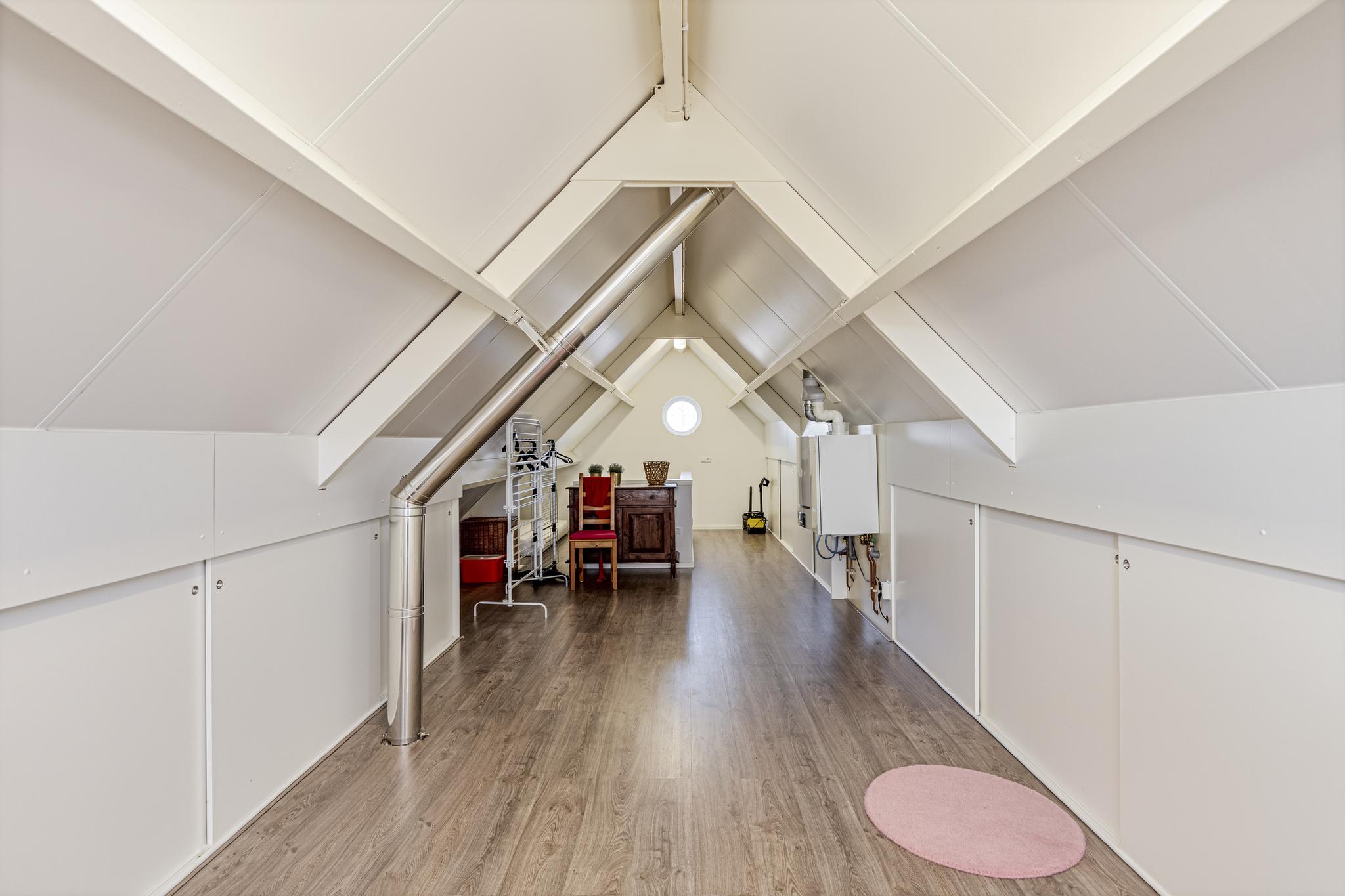 Zolderruimte over de volle breedte van de woning met bergkasten aan weerszijden onder de schuinte van de kap, opstelling van de Nefit HR c.v. combiketel uit 2008, WTW mechanische ventilatie en de ruimte is afgewerkt met een nette laminaatvloer.
