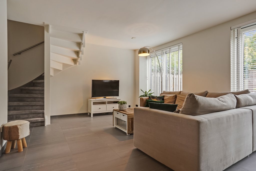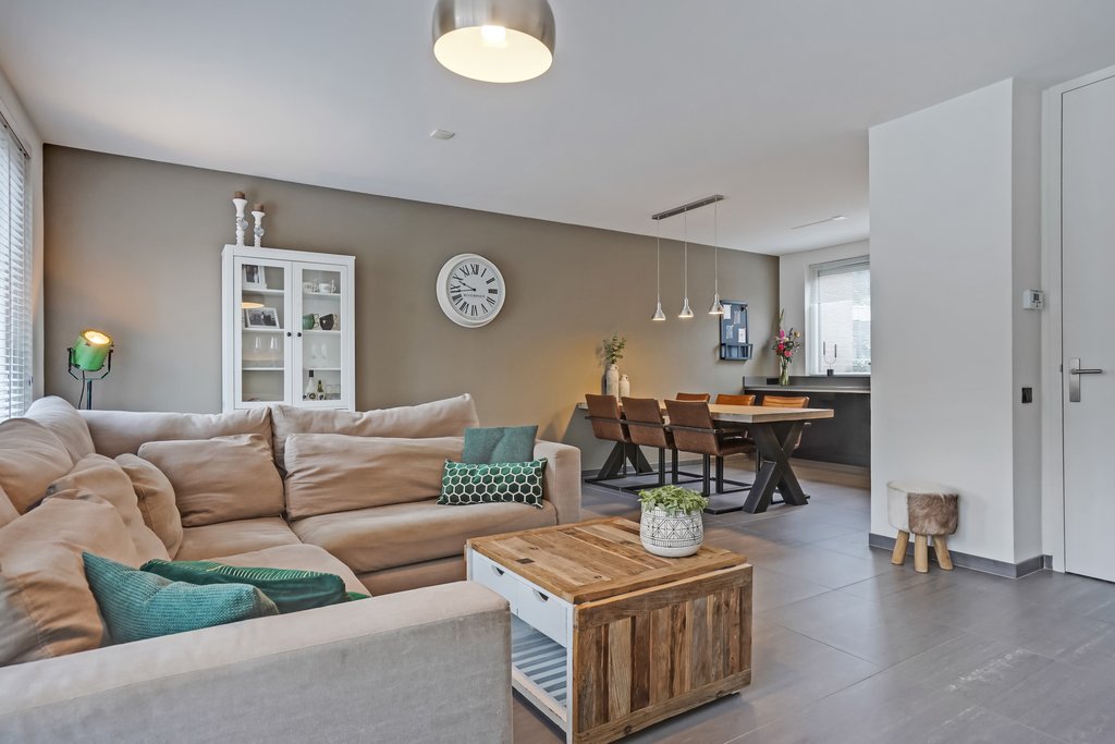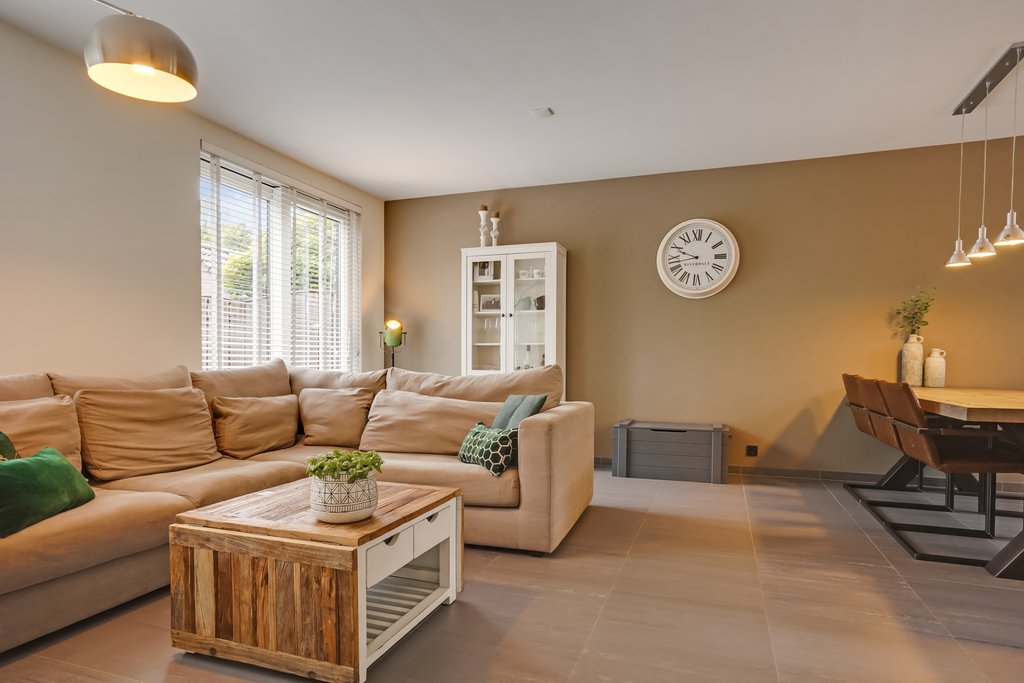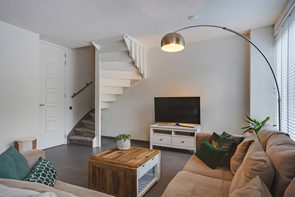 Sfeervolle living met een schuifpui aan achterzijde en afgewerkt met een mooie tegelvloer voorzien van vloerverwarming, gestukadoorde wanden en een strak pleisterwerk plafond.