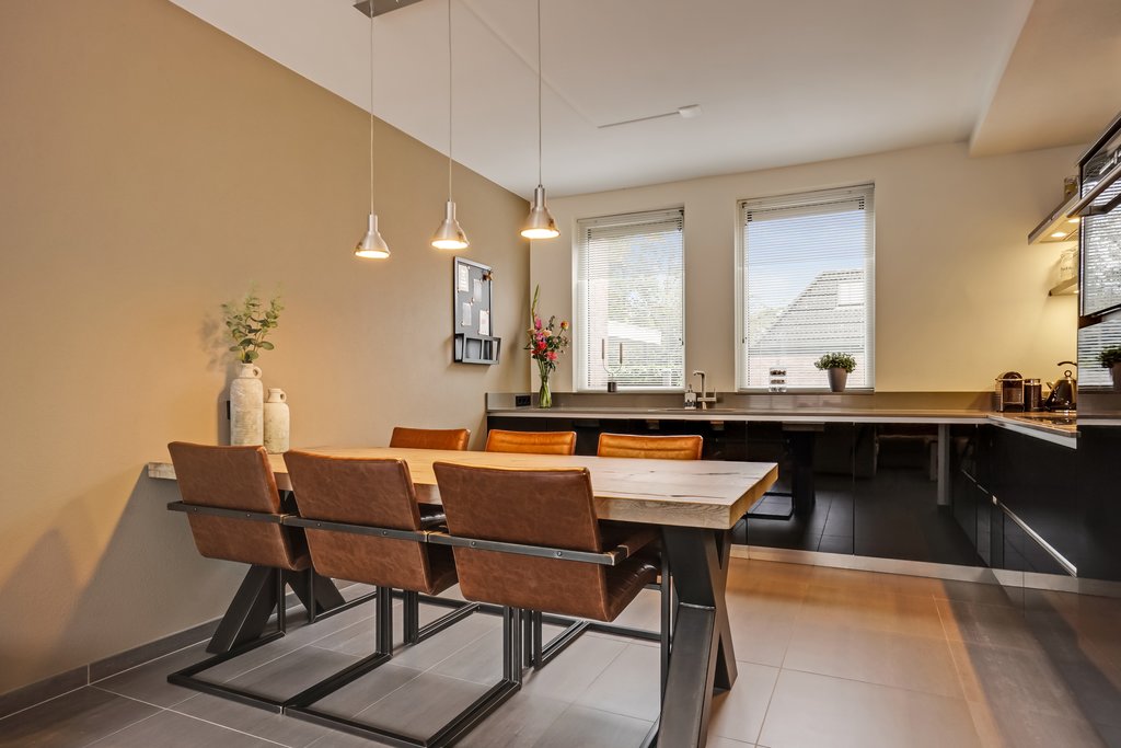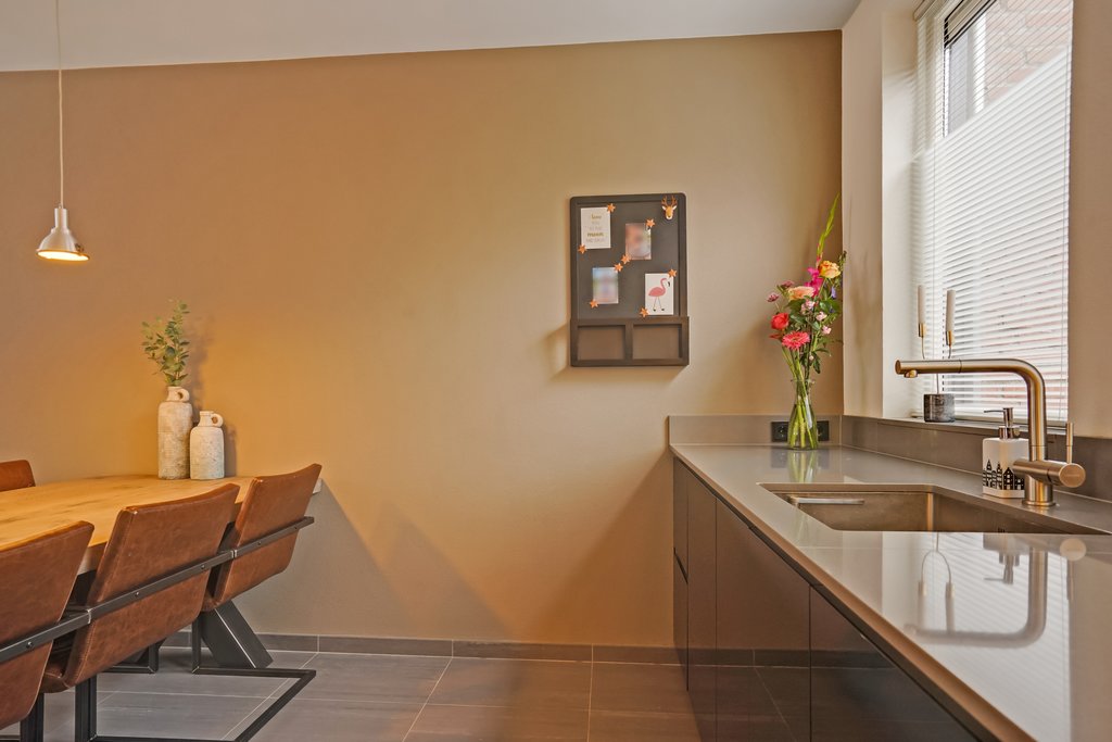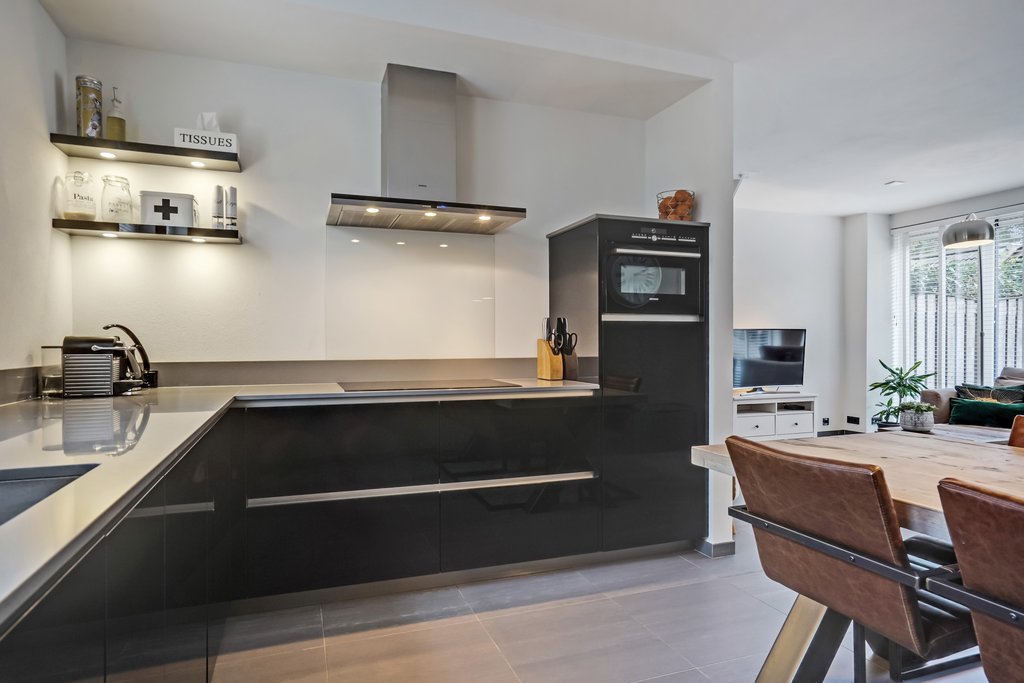 Open keuken met een luxe keukeninrichting in hoekopstelling voorzien van diverse laden en kasten, composiet werkblad, r.v.s. spoelbak, close in boiler, vaatwasmachine, inductie kookplaat, afzuigkap, koelkast en een elektrische oven/magnetron.