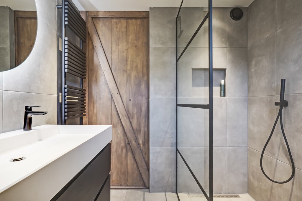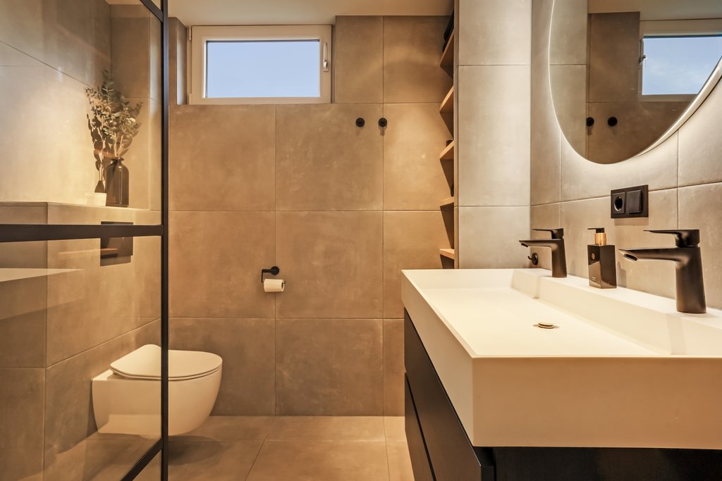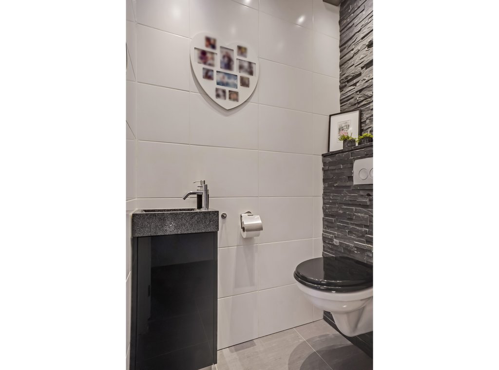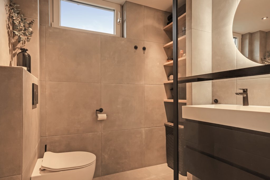 De badkamer is voorzien van een mooi badmeubel met dubbele doorlopende wastafel, zwevend closet met muurspoeling en een ruime inloopdouche met thermostaatkraan.