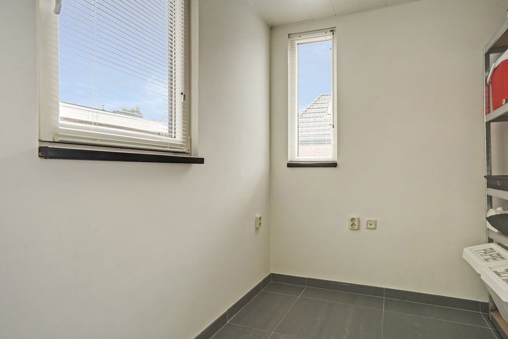 Kantoor/werkkamer via loopdeur in hal te bereiken en afgewerkt met een tegelvloer voorzien van vloerverwarming, stucwerk wanden en een systeemplafond met inbouwverlichting.