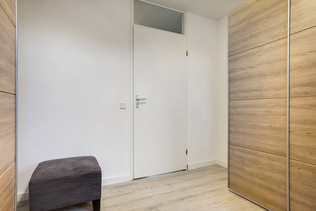 Slaapkamer 1 aan voorzijde afgewerkt met een laminaatvloer, fijn schuurwerk wanden en een spuitwerk plafond.