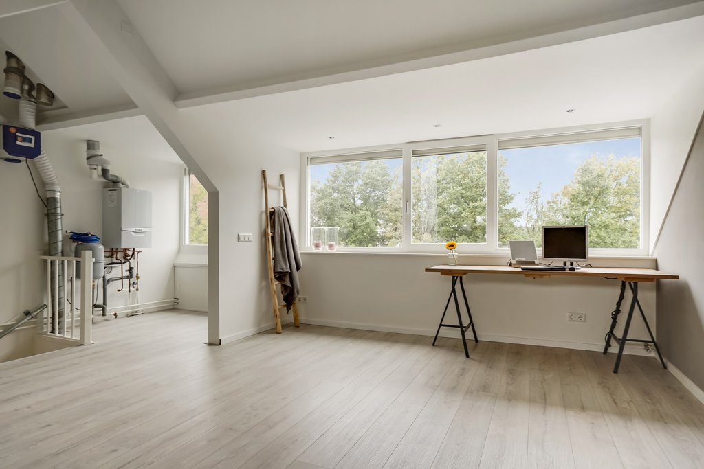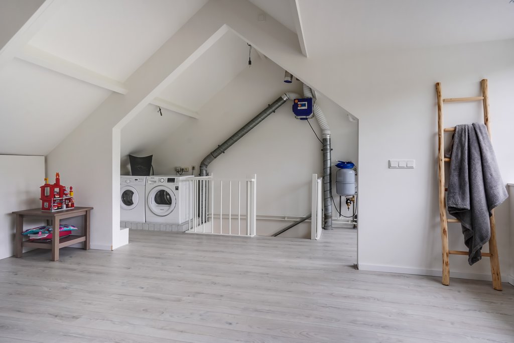 Royale zolderetage met een dakkapel over de volle breedte aan achterzijde, aansluiting t.b.v. wasapparatuur, unit voor de mechanische ventilatie en opstelling van de HR c.v. combiketel van het merk Vaillant.