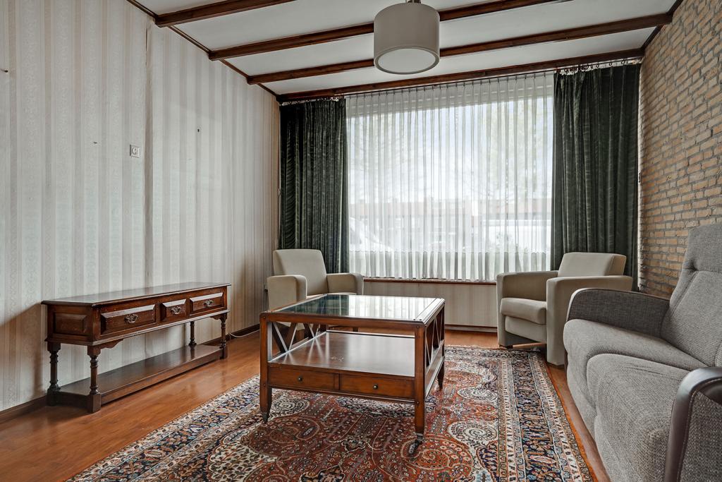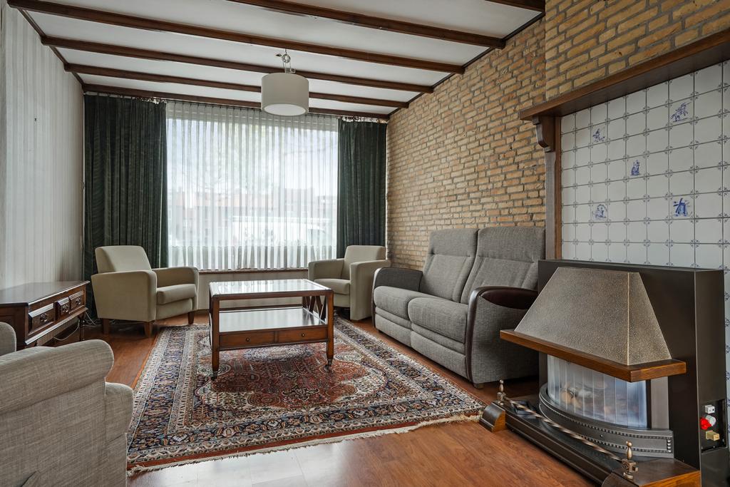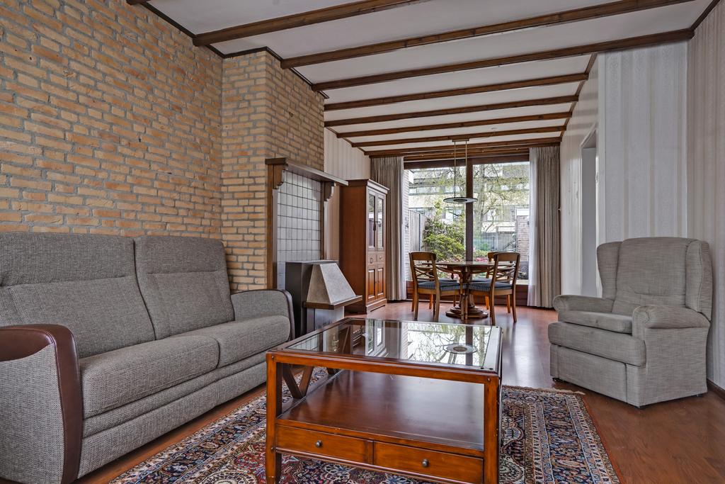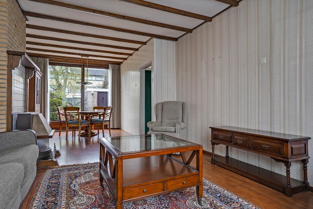 De woonkamer met een schuifpui, gemetselde schouw met gashaard en afgewerkt met een laminaatvloer, behangen deels steenstrips wanden en een sierbalken plafond.