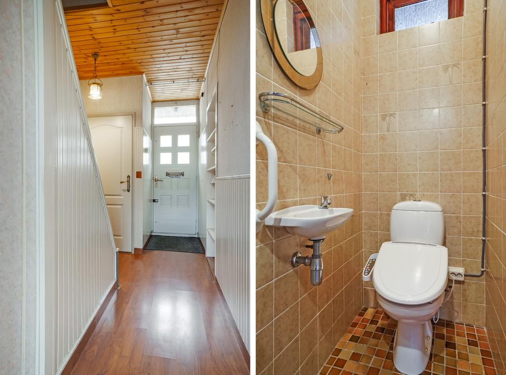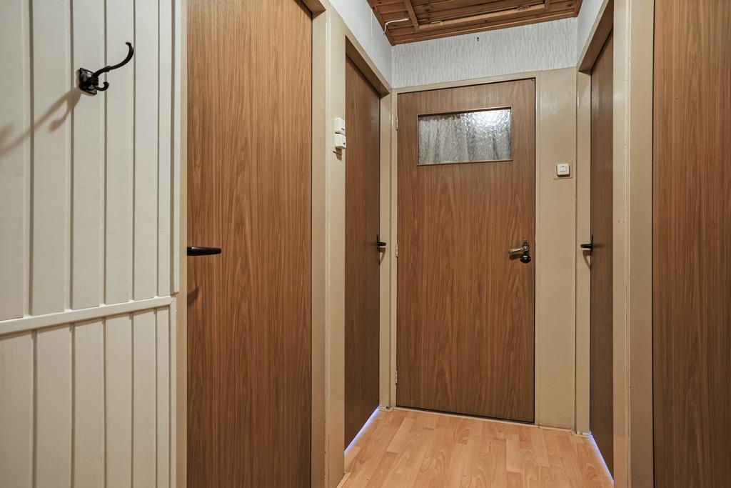 Hal afgewerkt met een laminaatvloer, houten lambrisering deels behangen wanden en een houten delen plafond.