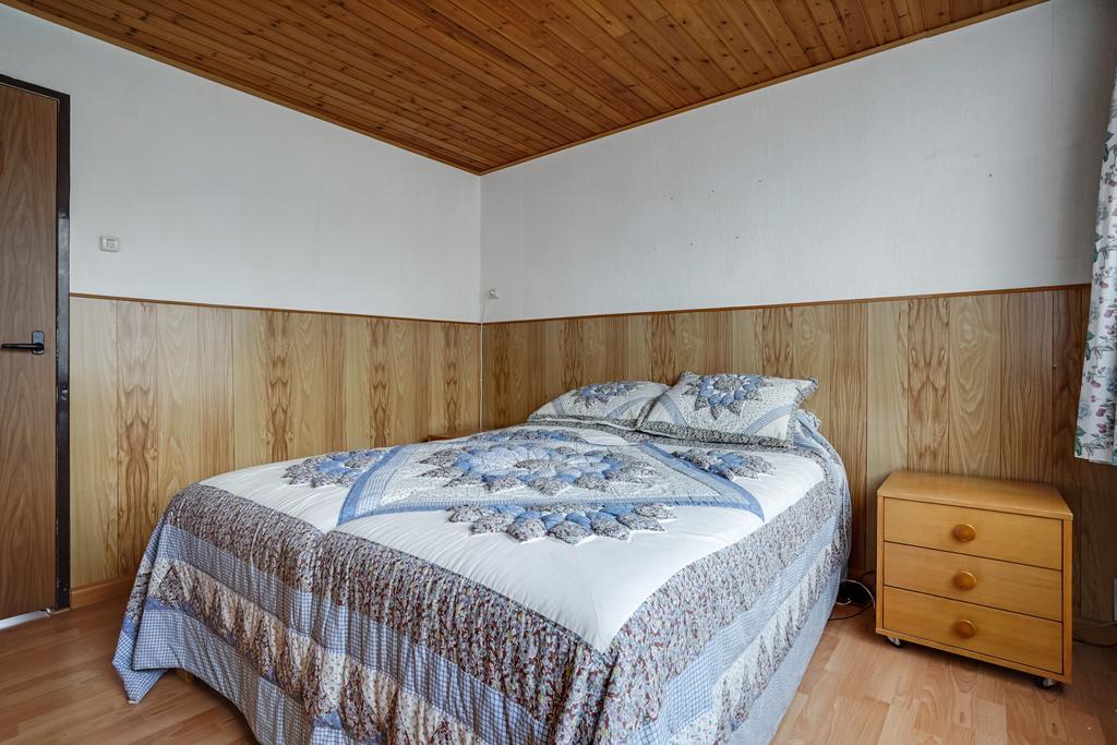 Slaapkamer 3 aan achterzijde afgewerkt met een laminaatvloer, lambrisering deels behangen wanden en een houten delen plafond.