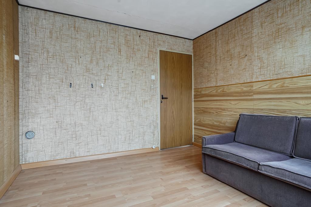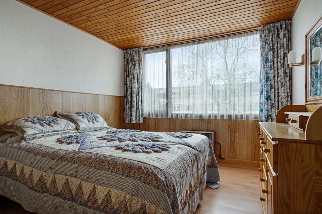 Slaapkamer 1 aan voorzijde afgewerkt met een laminaatvloer, behangen wanden en een pleisterwerk plafond.