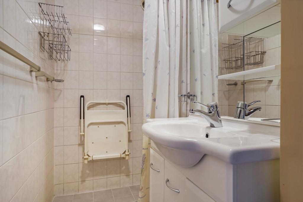 Betegelde badkamer voorzien van een douche en badmeubel met wastafel.
