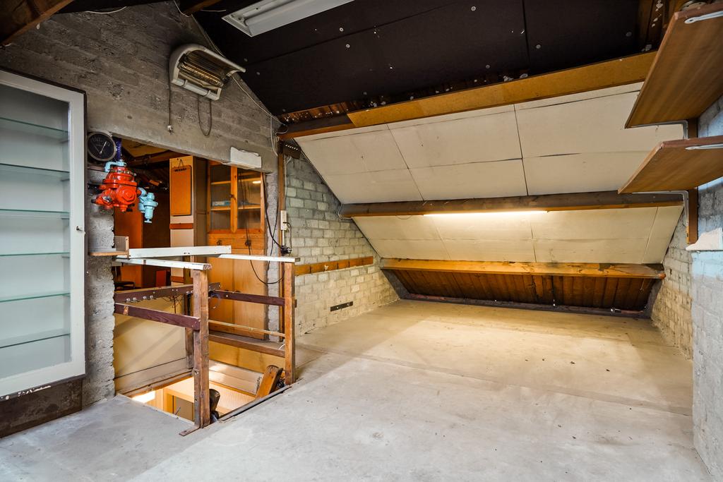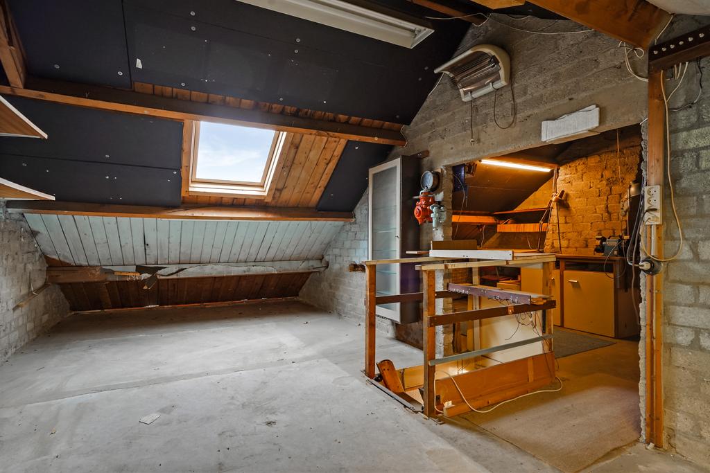 Zolderetage met een betonnen verdiepingsvloer met een houten kapconstructie en een Velux dakvenster.