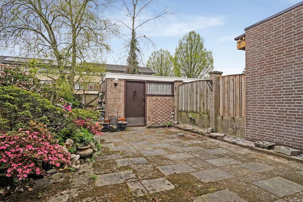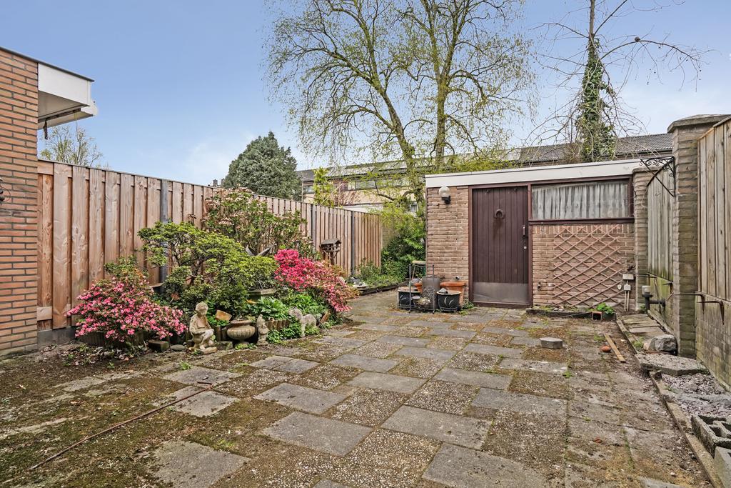 Circa 14 meter diepe achtertuin met een afsluitbare achterom, houten delen deels gemetselde erfafscheiding en aangelegd met terrastegels en diverse beplanting.