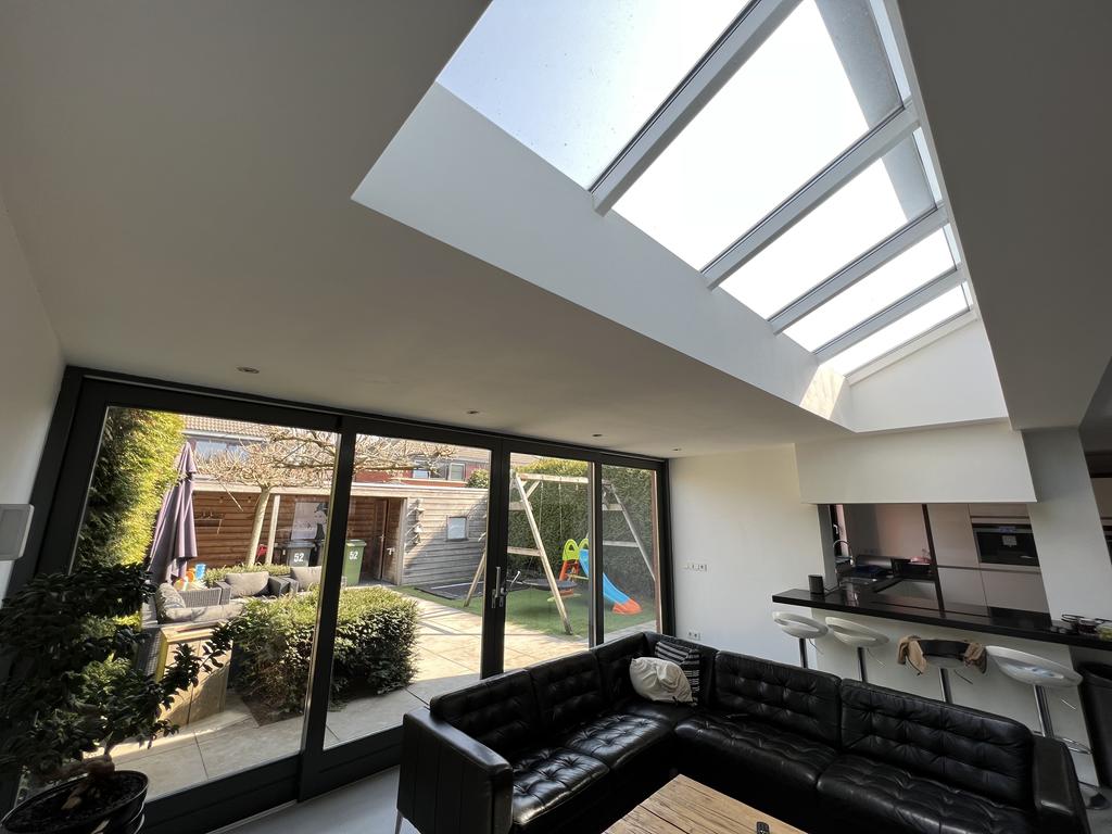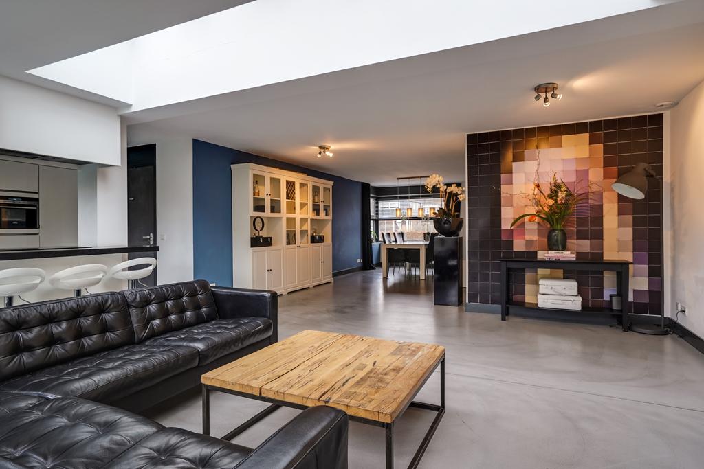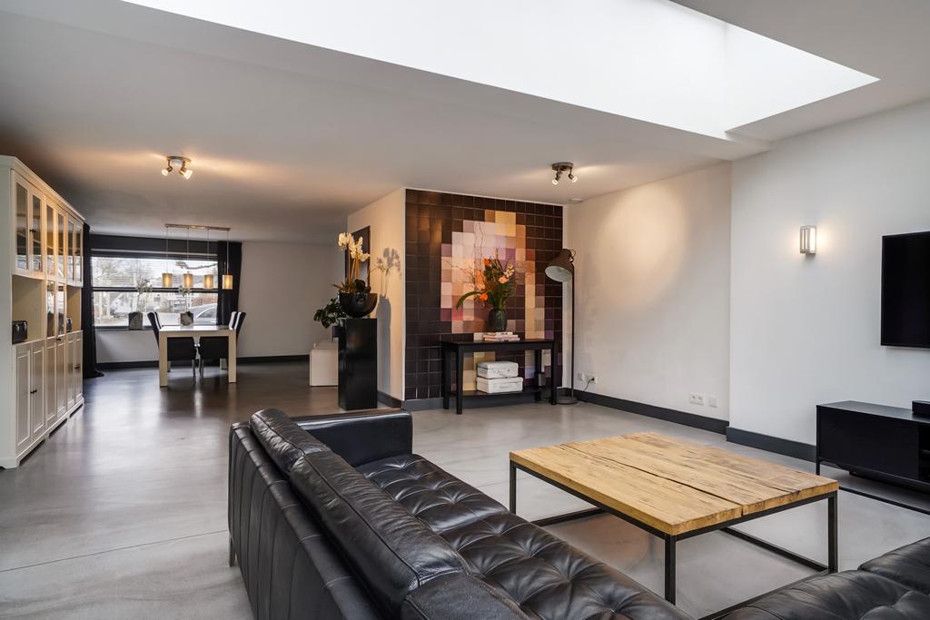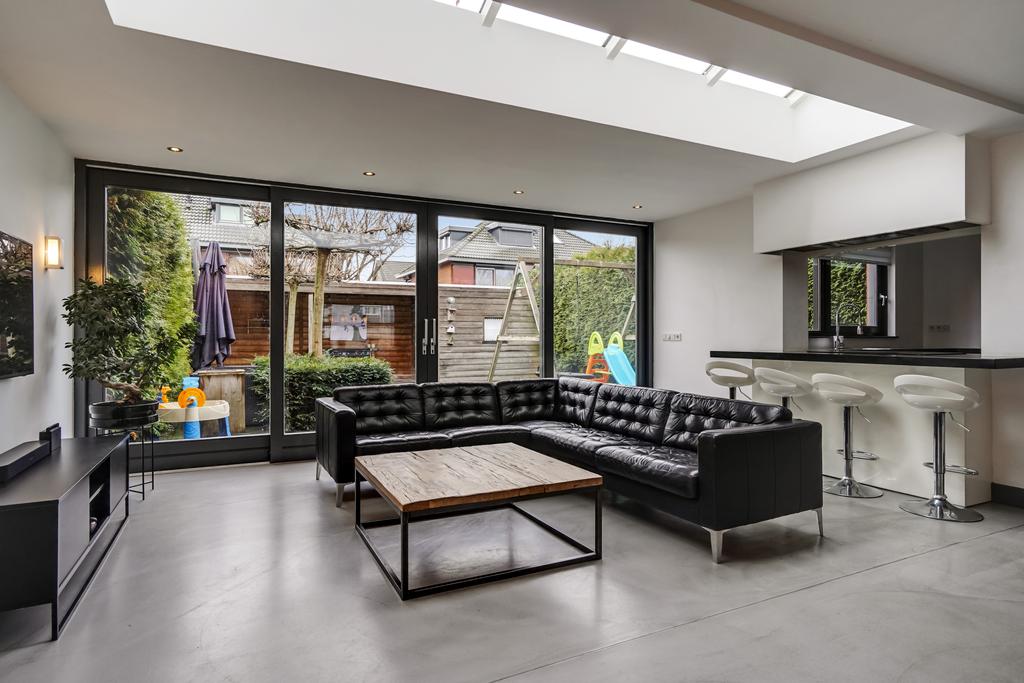 De royale uitgebouwde living met een schuifpui en lichtstraat voor extra natuurlijke lichtinval is afgewerkt met een gietvloer voorzien van vloerverwarming, strak stucwerk wanden en een stucwerk plafond.