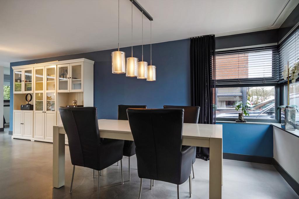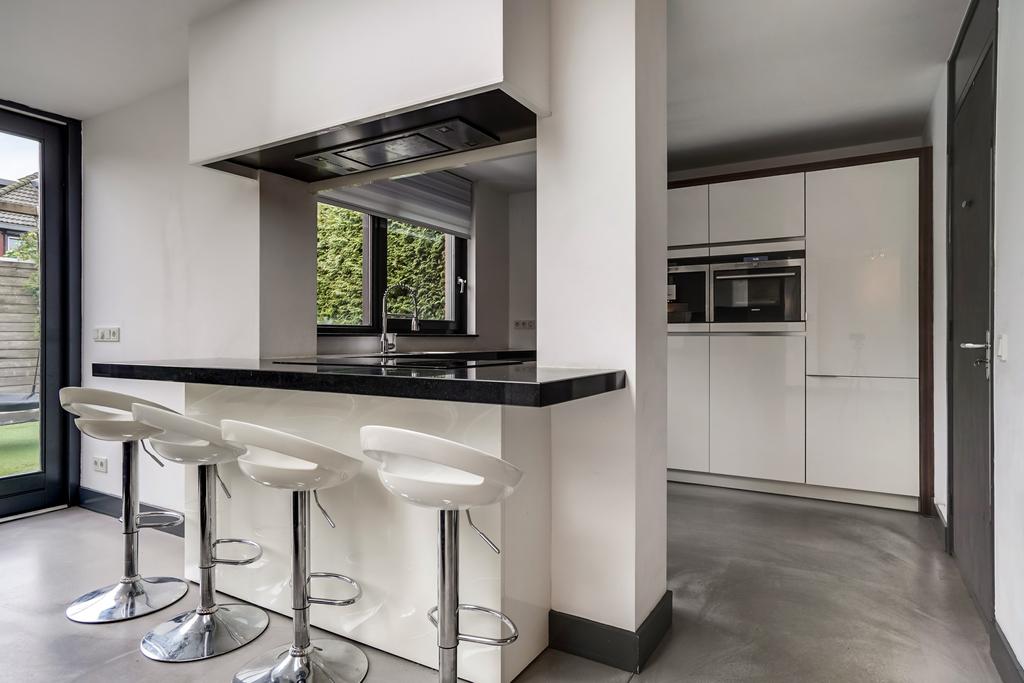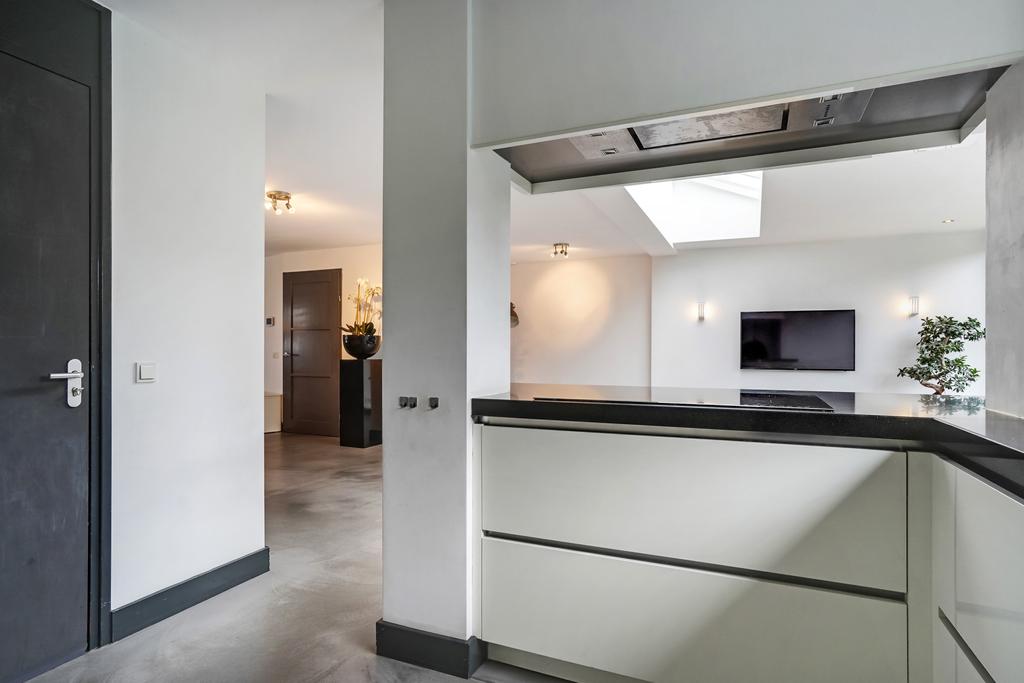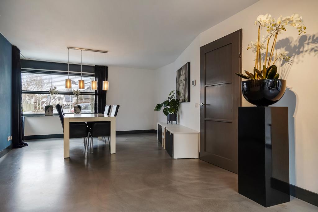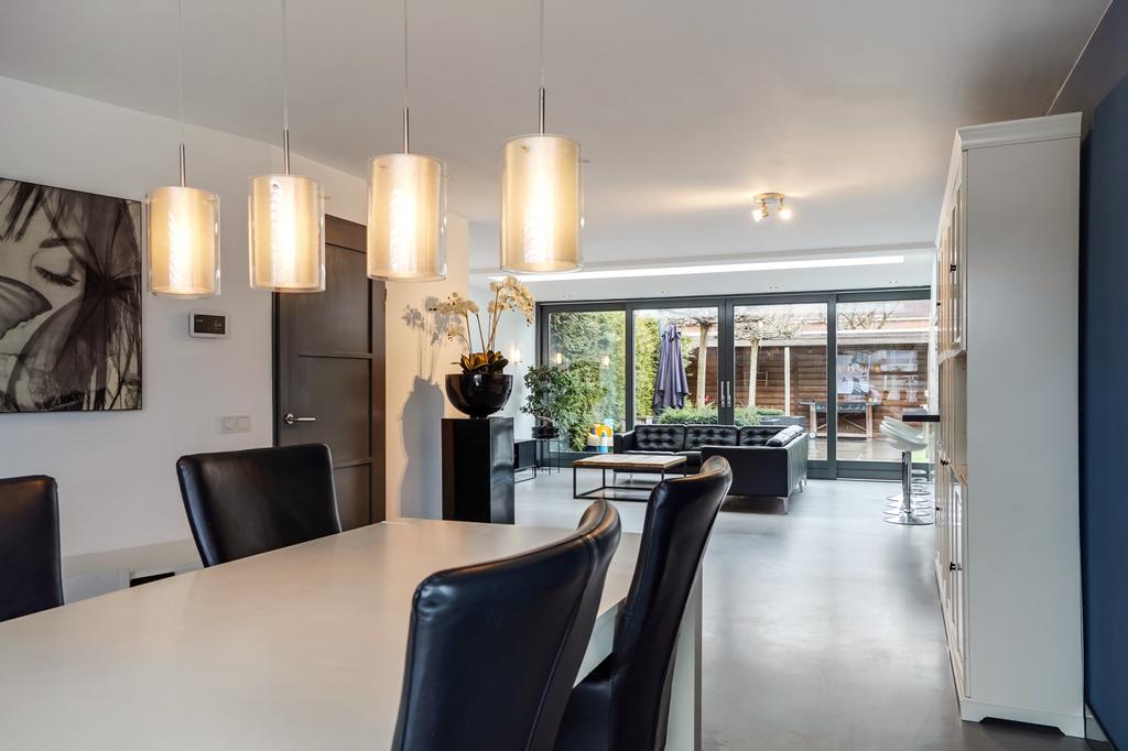 De royale uitgebouwde living met een schuifpui en lichtstraat voor extra natuurlijke lichtinval is afgewerkt met een gietvloer voorzien van vloerverwarming, strak stucwerk wanden en een stucwerk plafond.