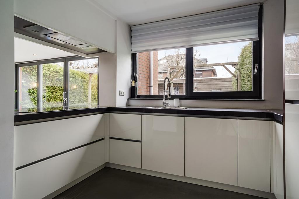 Open keuken met een eigentijdse en luxe keukeninrichting in U-opstelling geplaatst en voorzien van diverse laden en kasten, apothekerskast, natuurstenen aanrechtblad, Siemens koelkast, 3 diepvriesladen, Siemens stoomoven, Siemens koffie machine, Siemens vaatwasmachine, Inventum 5-pits inductie kookplaat en een rvs afzuigkap.