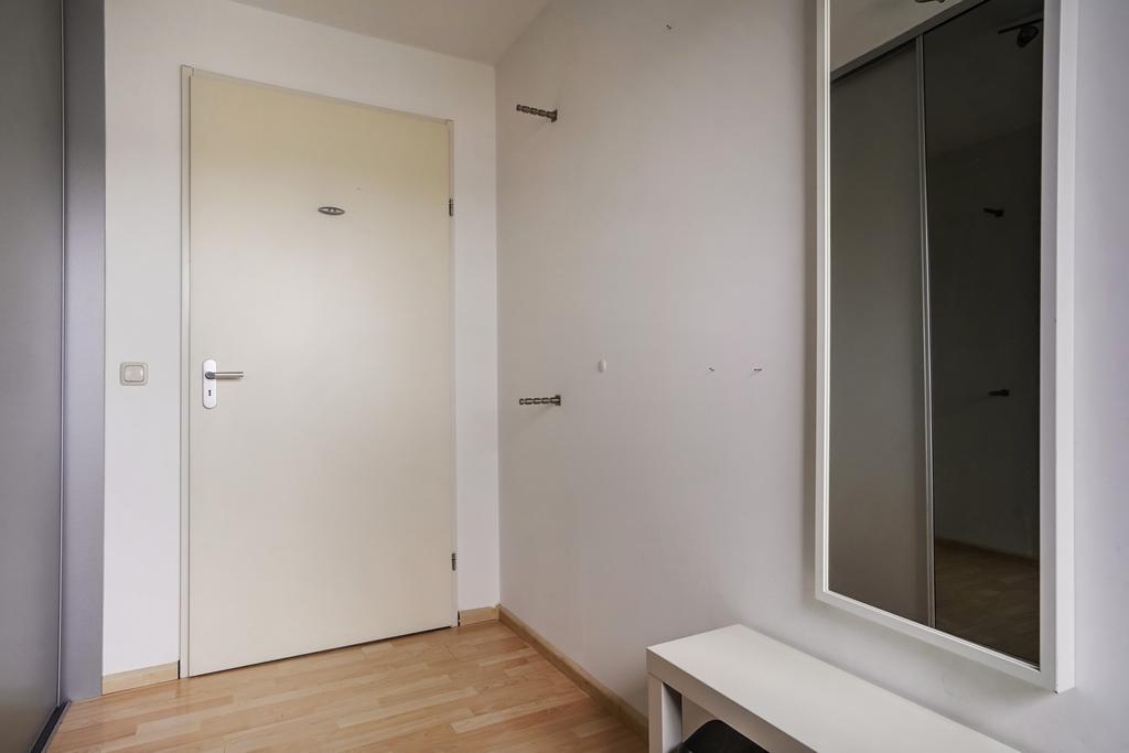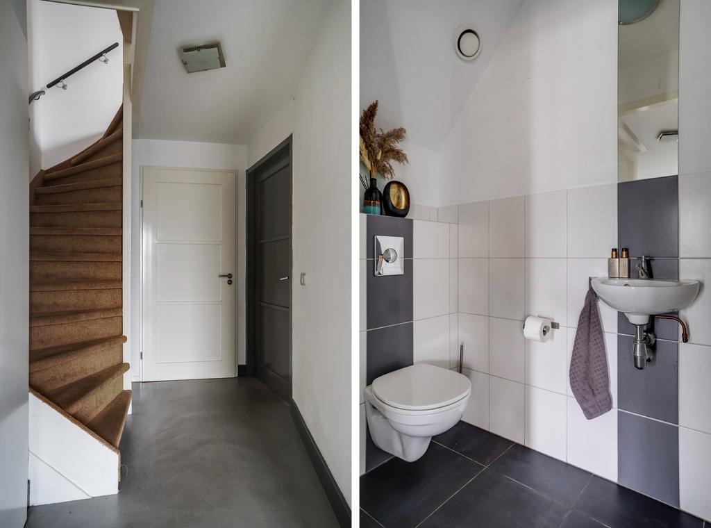 Hal afgewerkt met een gietvloer, stucwerk wanden en een stucwerk plafond.