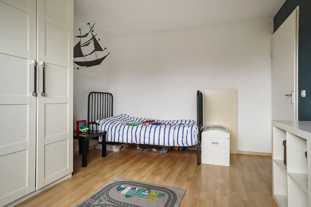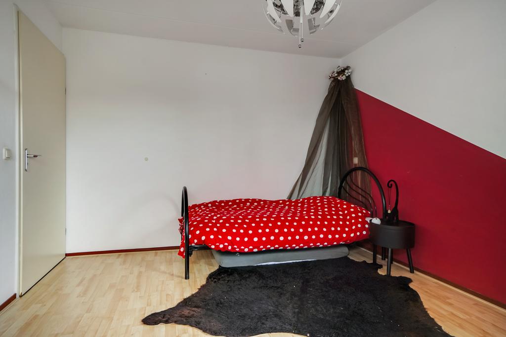 Slaapkamer 1 aan voorzijde is afgewerkt met een laminaatvloer, pleisterwerk wanden en een spuitwerk plafond.