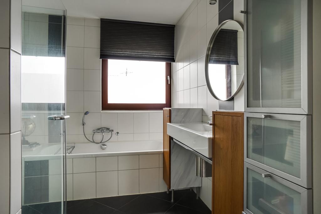 Moderne en geheel betegelde badkamer voorzien van een ligbad, wastafel, separate douche en een zwevend closet met muurspoeling van (Villeroy & Boch).