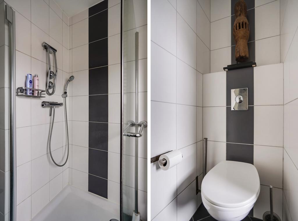 Betegelde toiletruimte met een fonteintje en een zwevend closet met muurspoeling van (Villeroy en Boch).