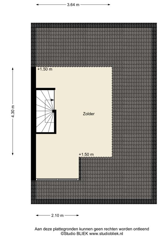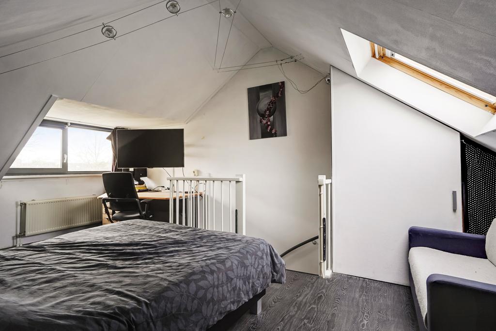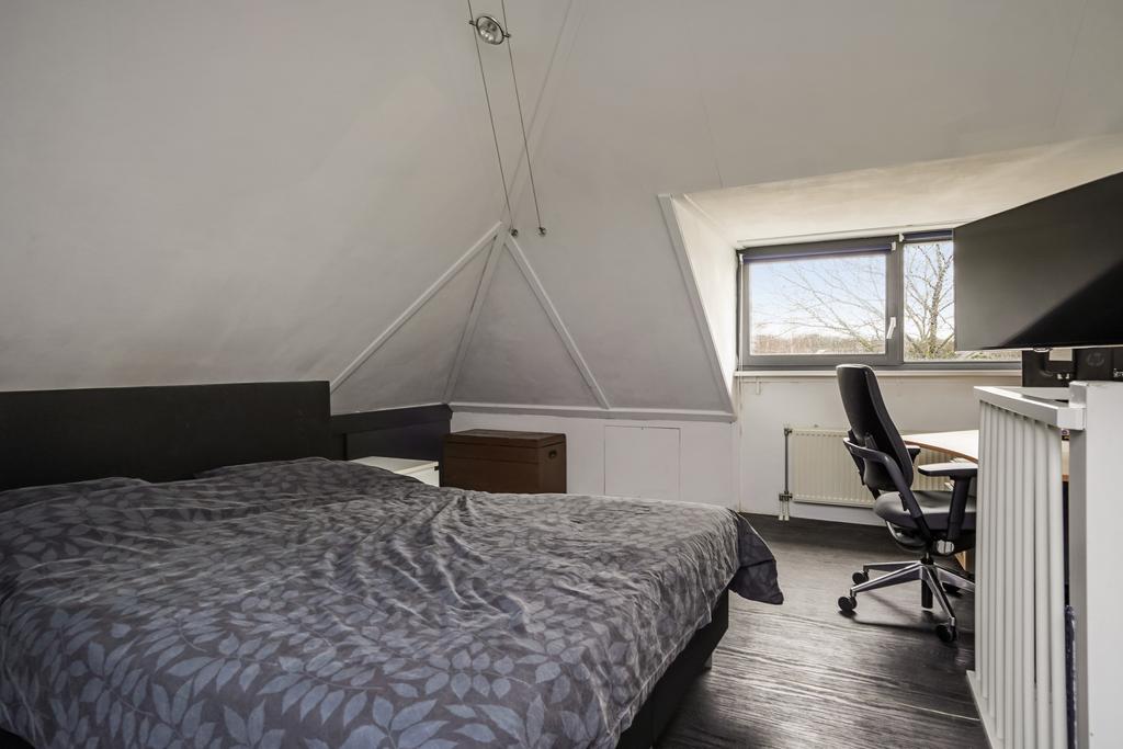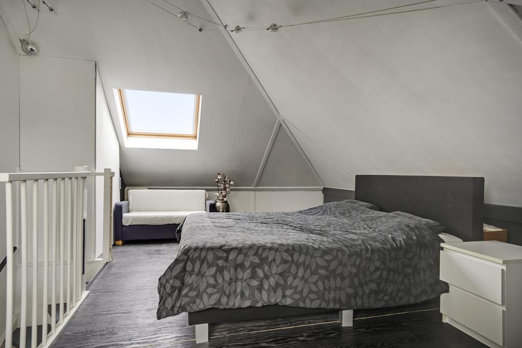 Zolderetage met een dakkapel aan voorzijde, Velux dakvenster en bergruimte onder de schuinte van de kap.