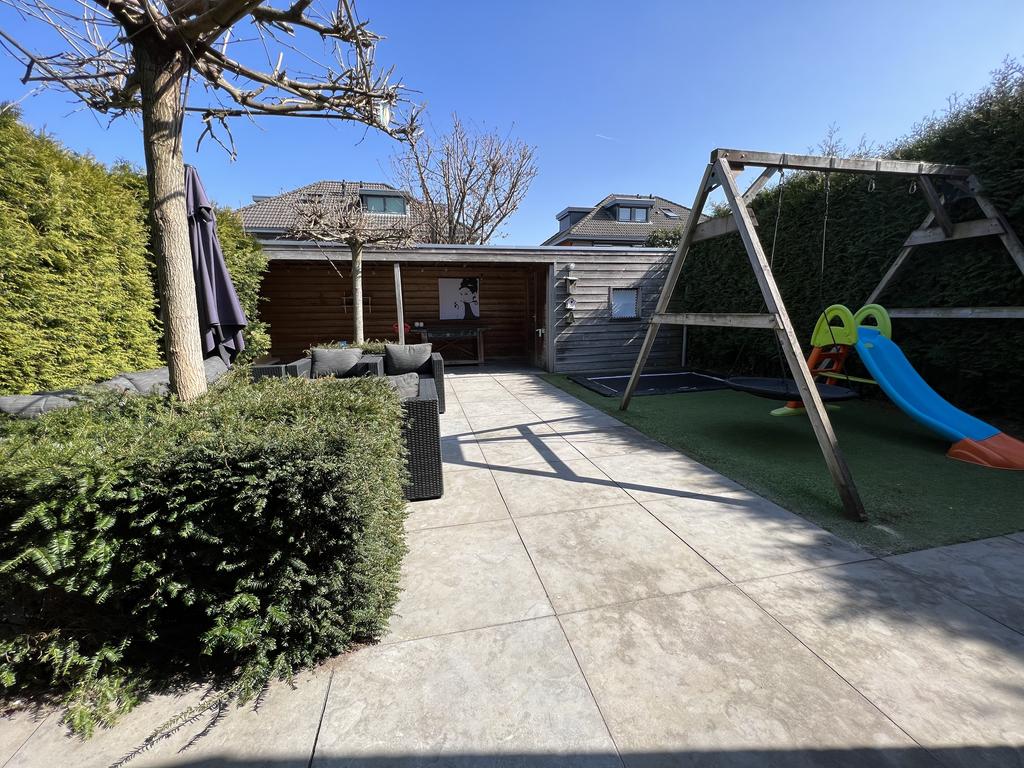 Fraai en onder architectuur aangelegde privacy biedende omsloten achtertuin welke is aangelegd met terrastegels, kunstgras en aan achterzijde een gezellige terrasoverkapping en aangesloten houten berging voorzien van elektra.