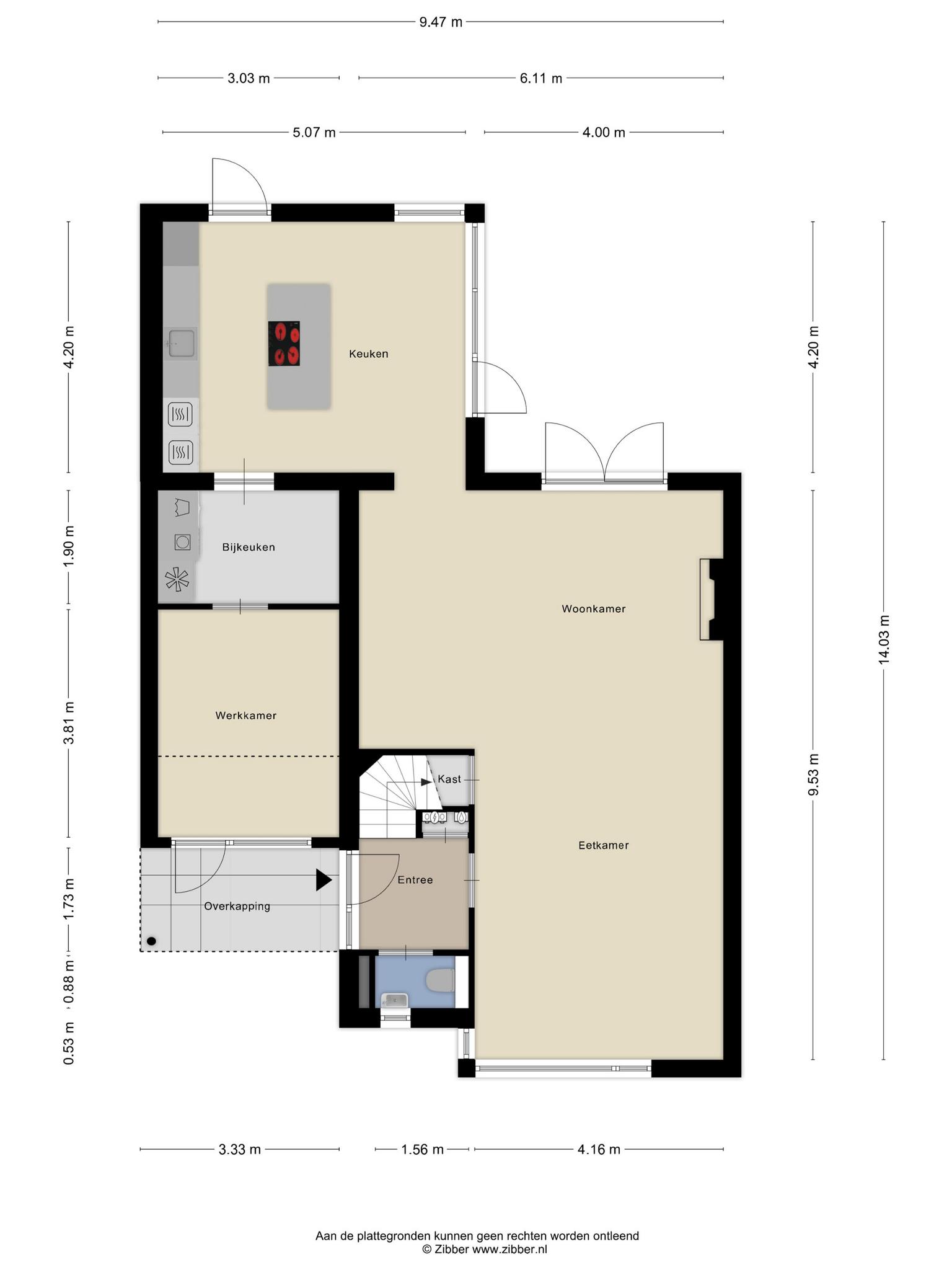 De werkkamer (momenteel in gebruik als berging) is te bereiken via de bijkeuken en heeft een eigen voorpui met loopdeur naar de oprit.