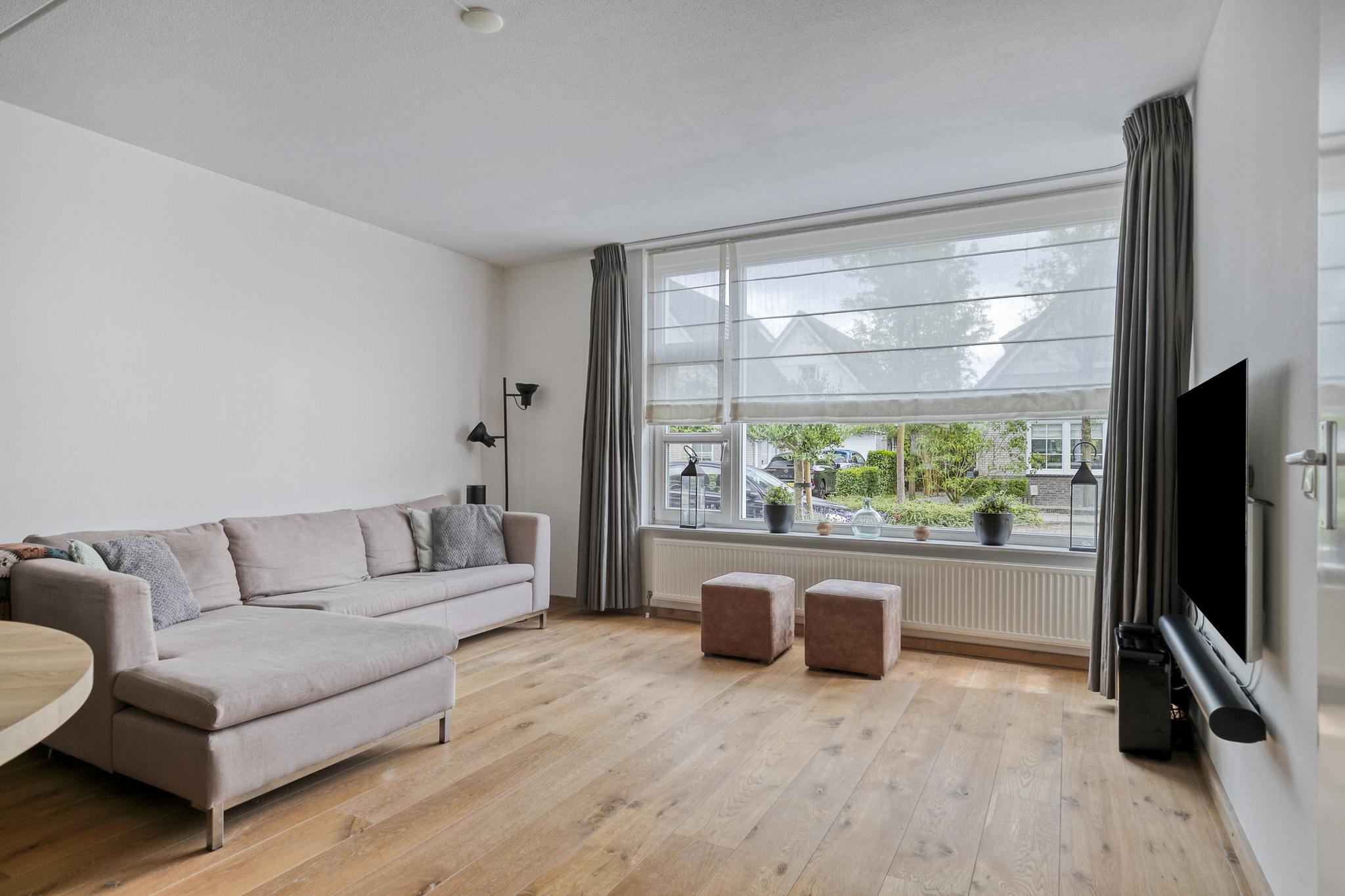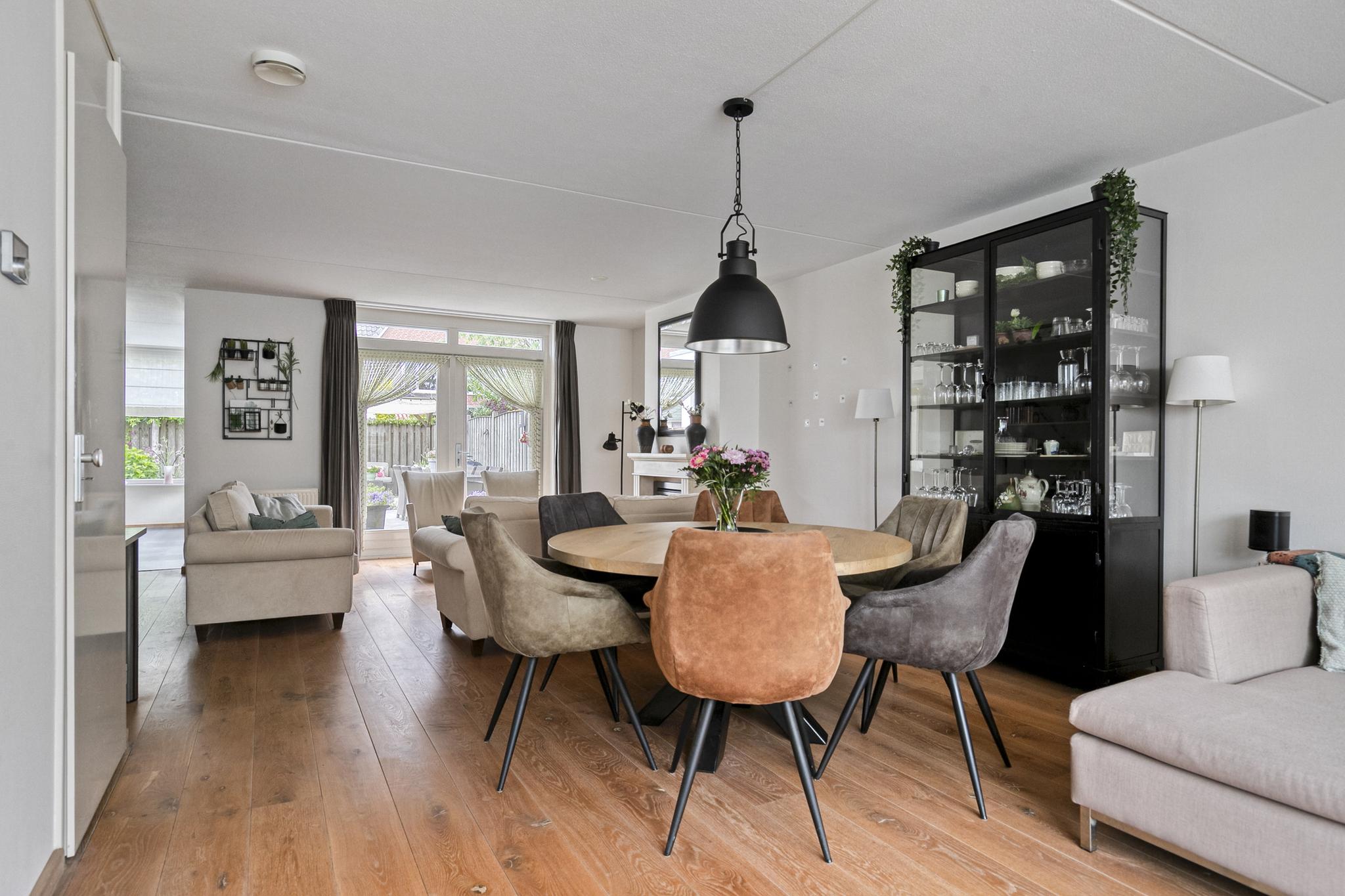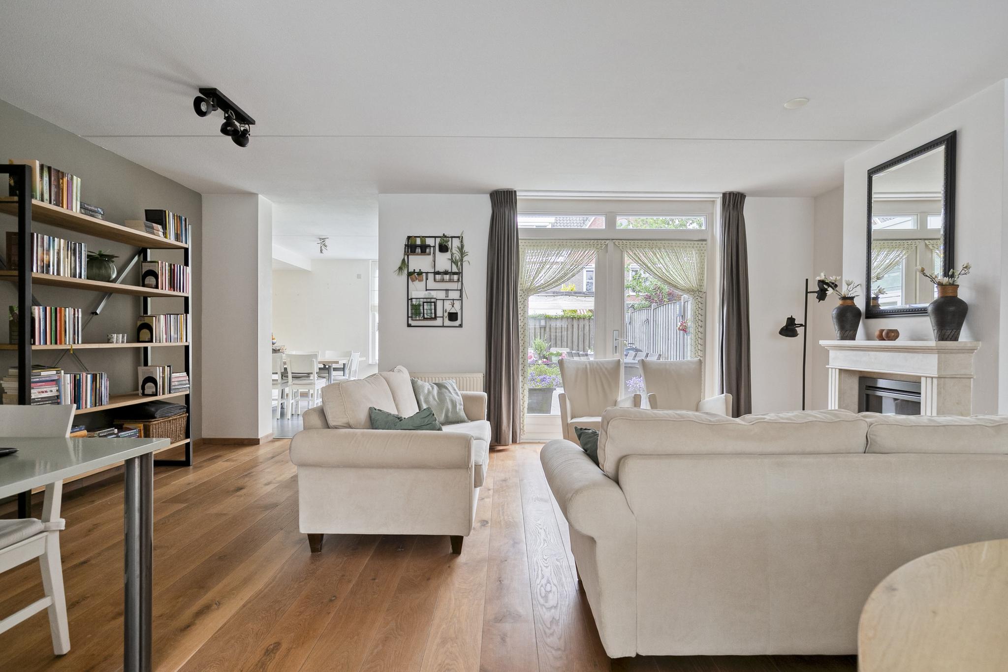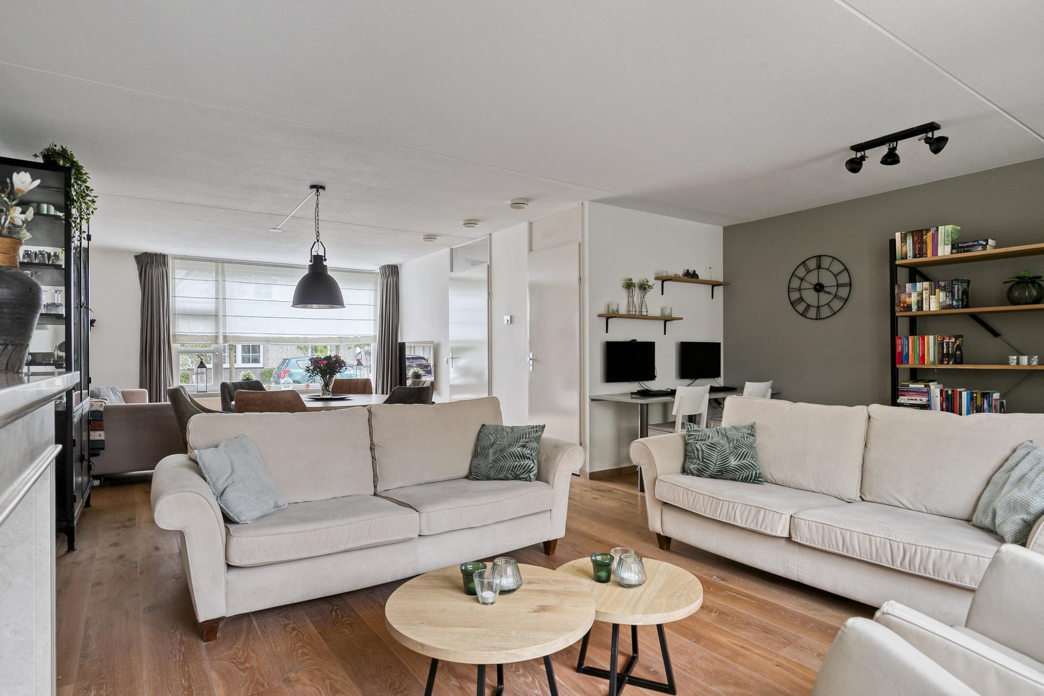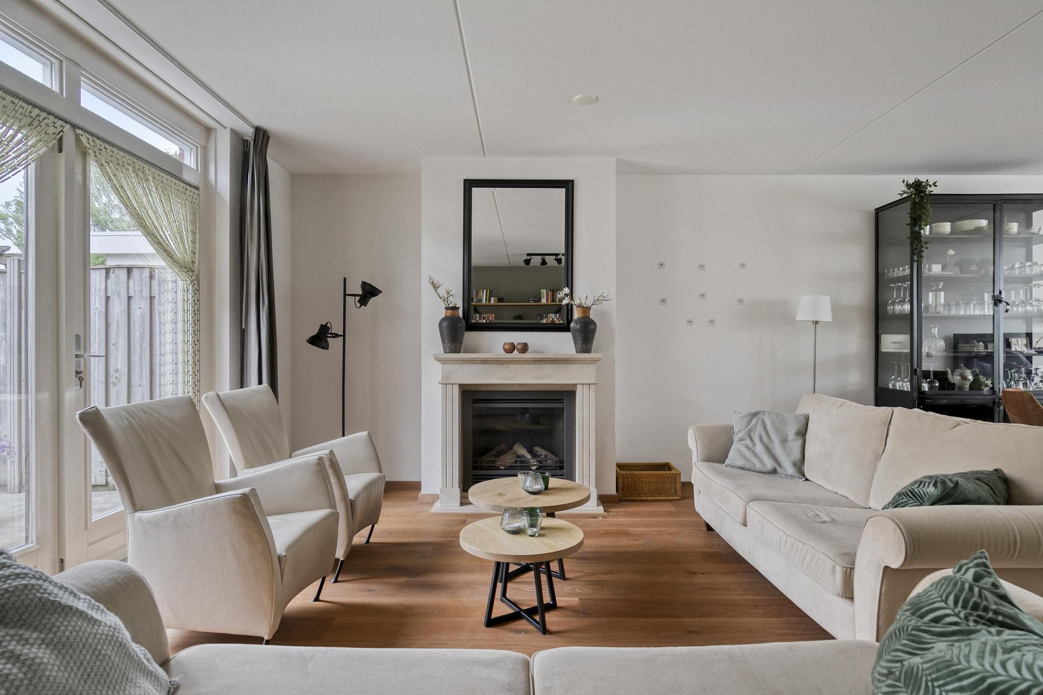 De royale living met openslaande tuindeuren naar het terras, sfeervolle gesloten gashaard met natuurstenen schouw en afgewerkt met een massief houten delen vloer, glasvezel behangen wanden en een spuitwerk plafond.