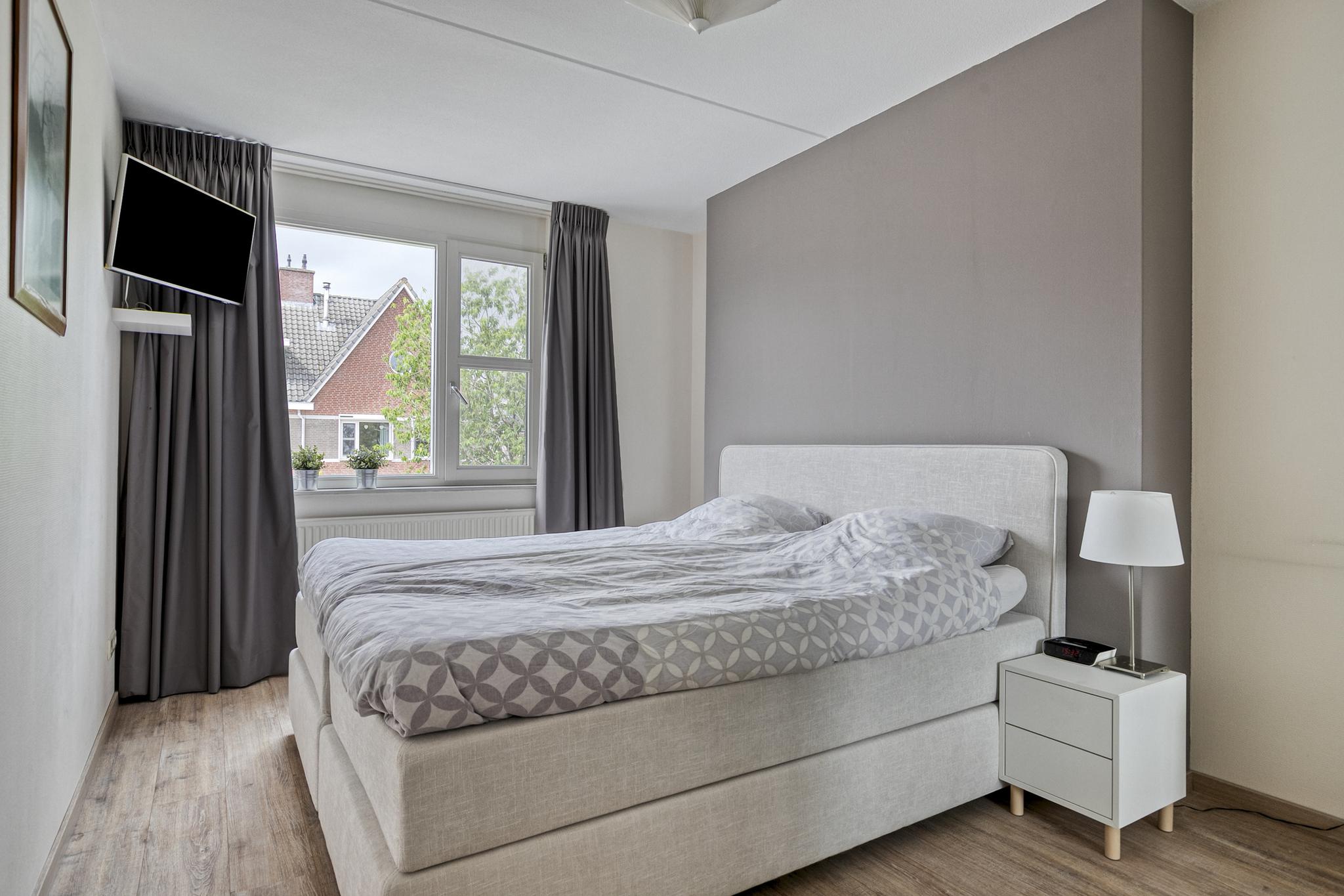 Slaapkamer 1 aan achterzijde (hoofdslaapkamer) is afgewerkt met een laminaatvloer, glasvezelbehangen wanden en een spuitwerk plafond.