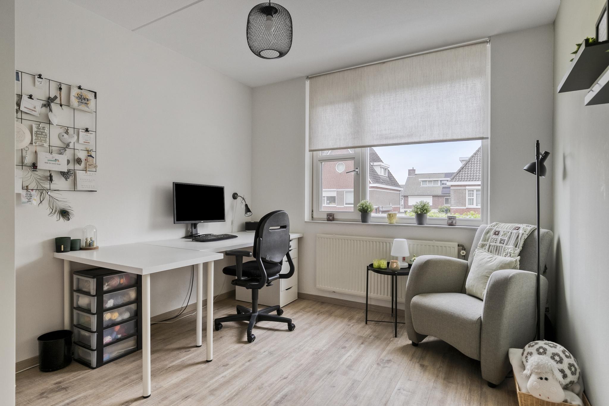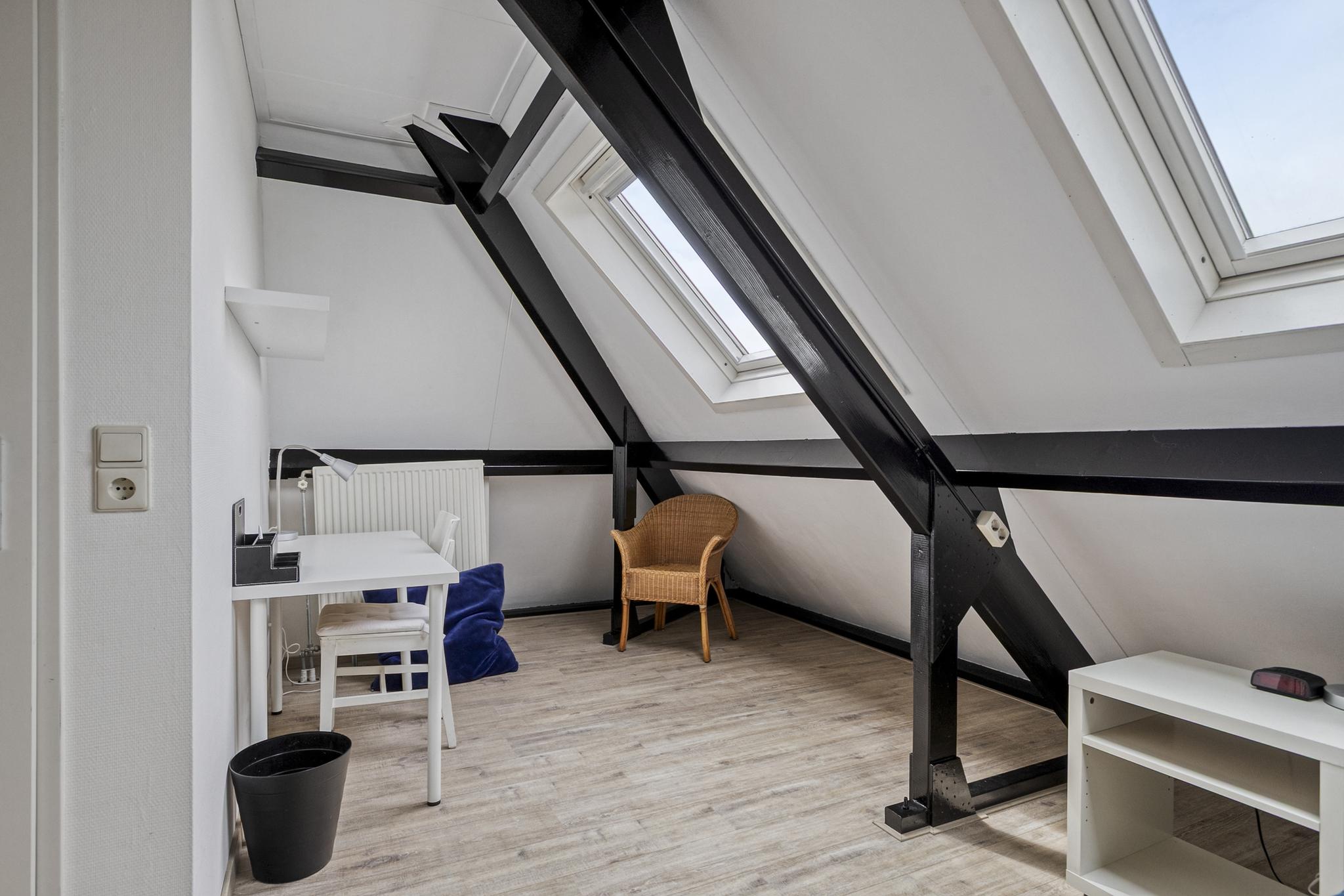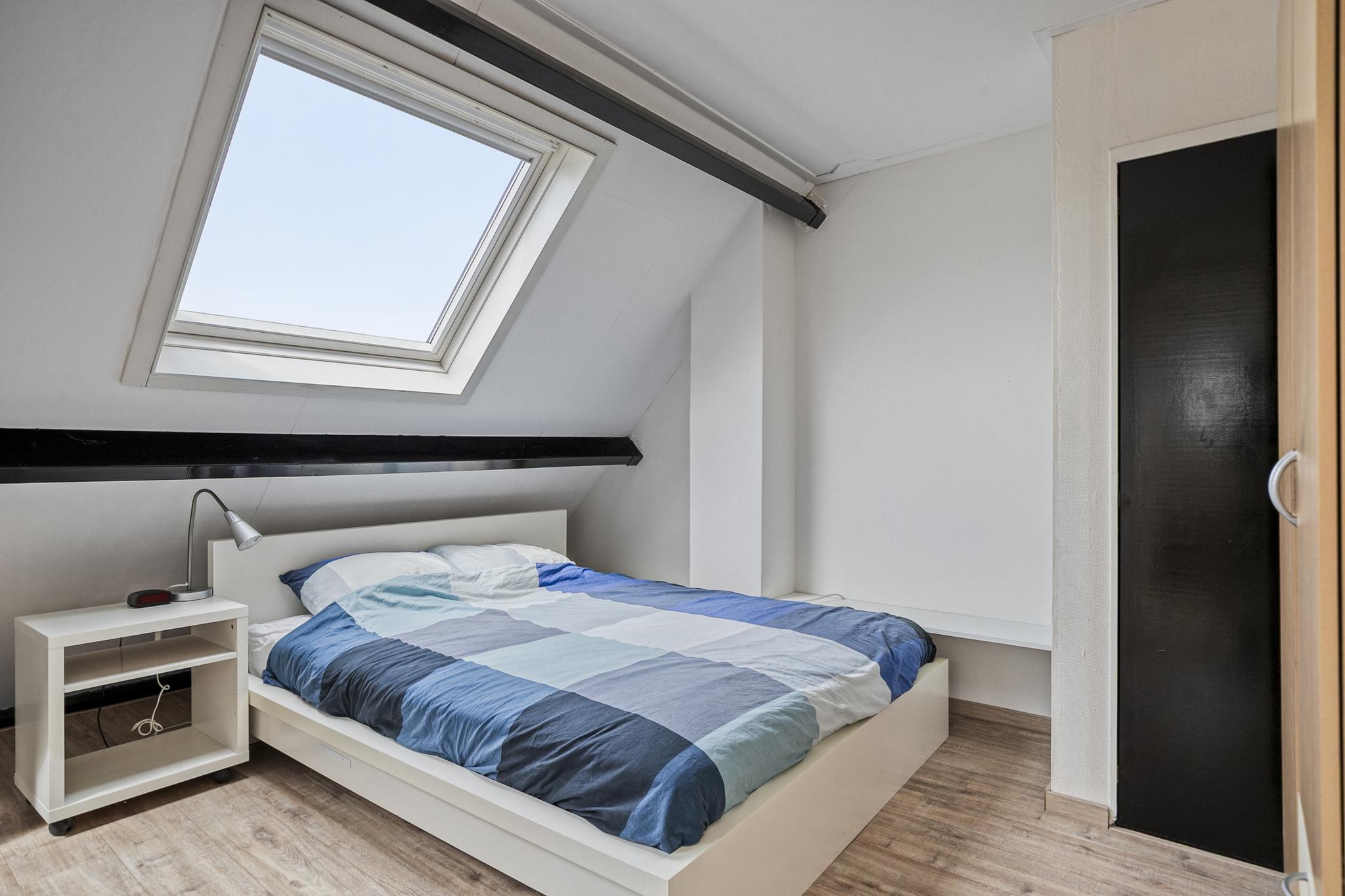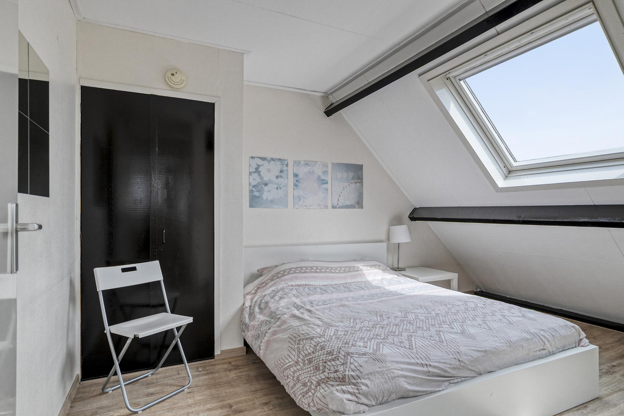 Slaapkamer 5 aan achterzijde met 2 Velux dakvensters, radiator, vaste kastenwand met de opstelling van de Remeha Calenta HR c.v. combiketel (2016) en de kamer is afgewerkt met een laminaatvloer.