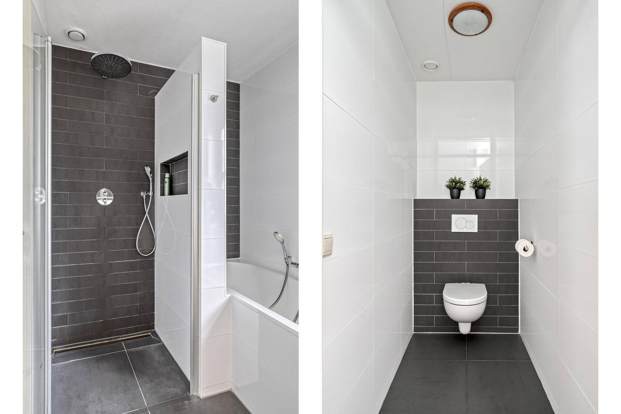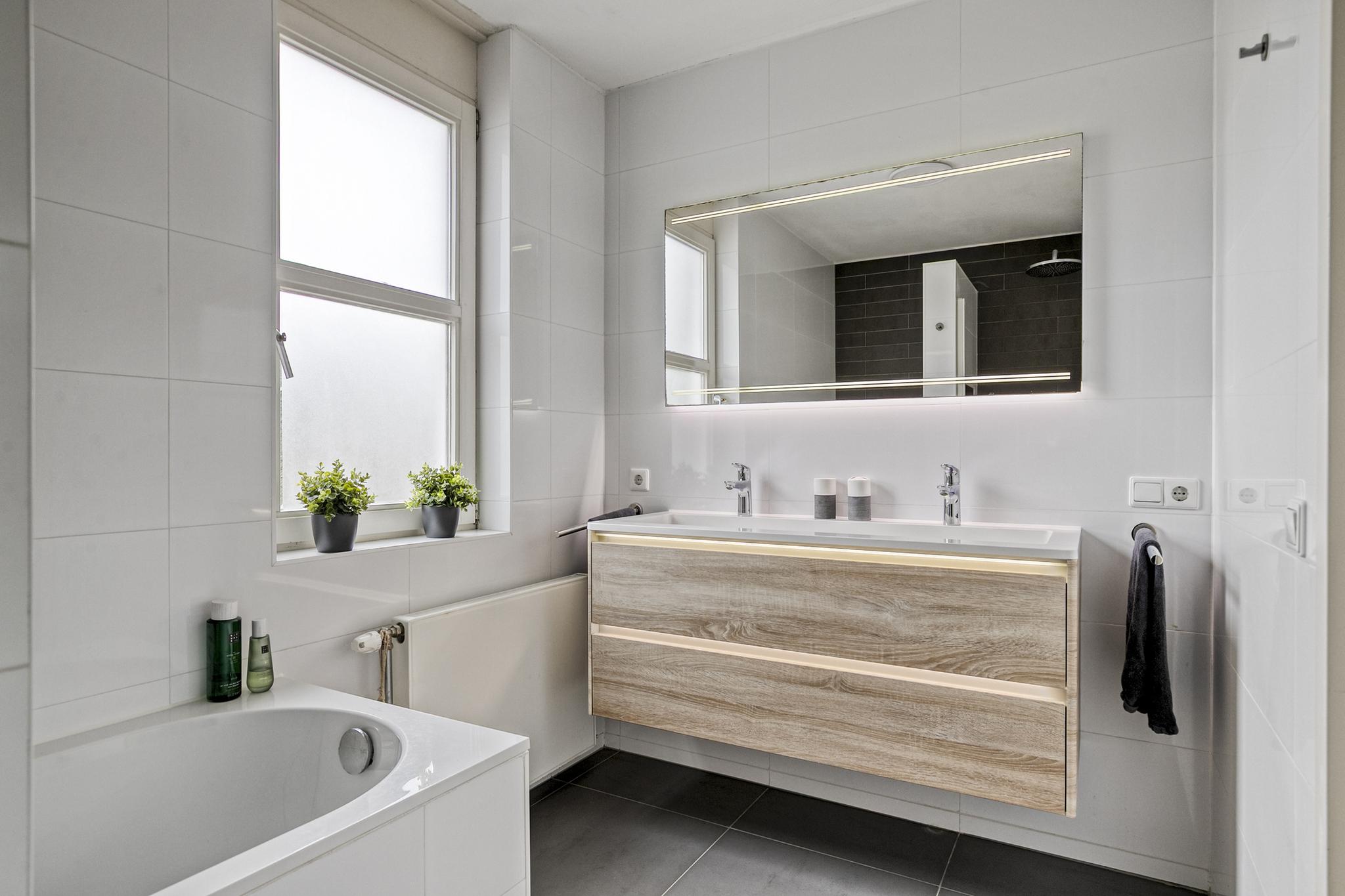 De eigentijdse en luxe badkamer is geheel betegeld en voorzien van een badmeubel met geïntegreerde dubbele wastafel, afsluitbare inloopdouche, kunststof ligbad en thermostaat kranen.
