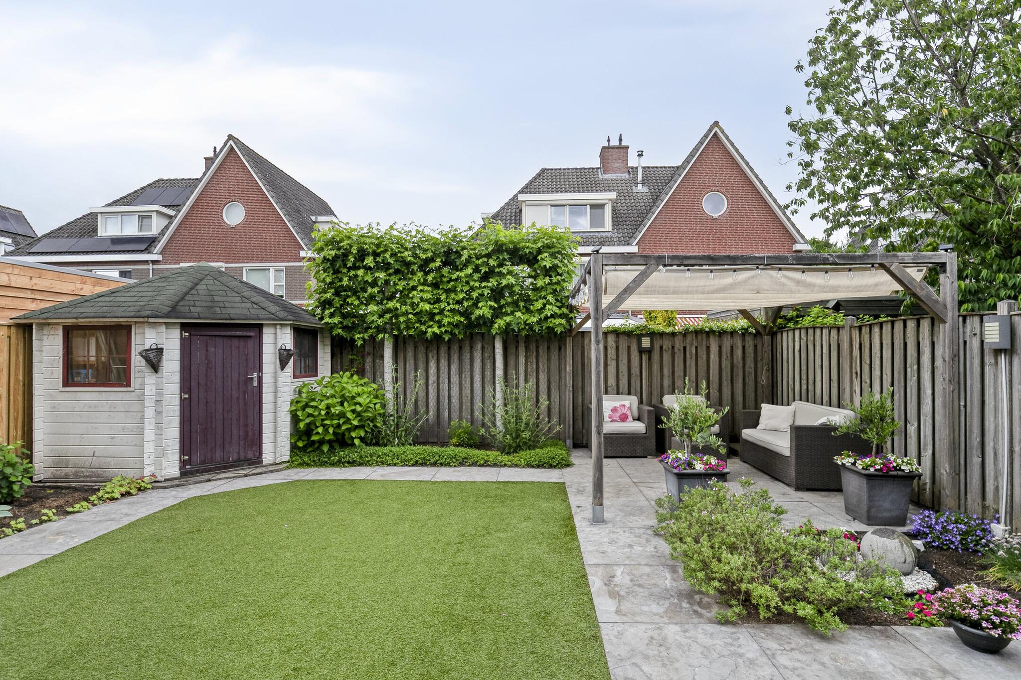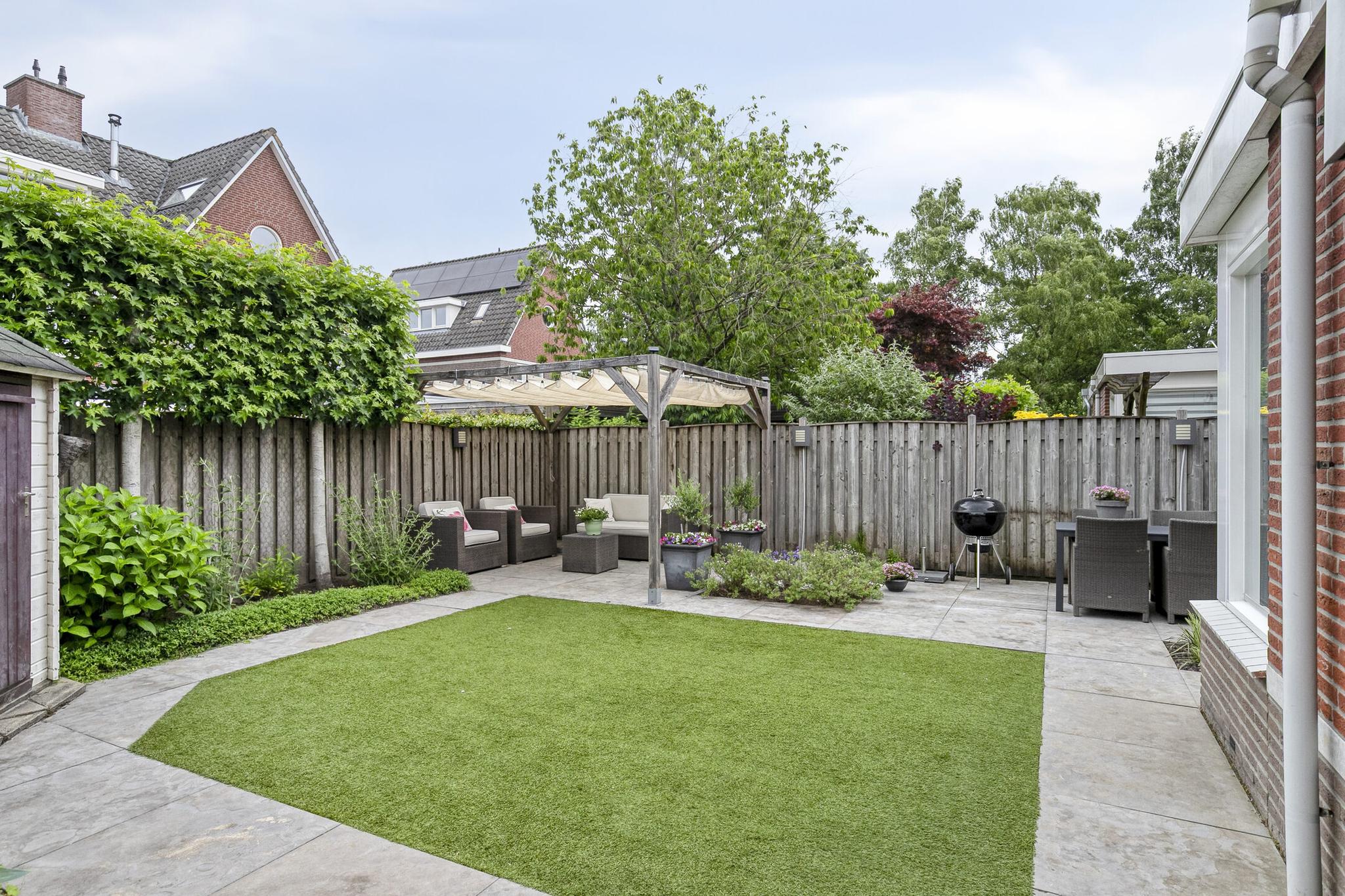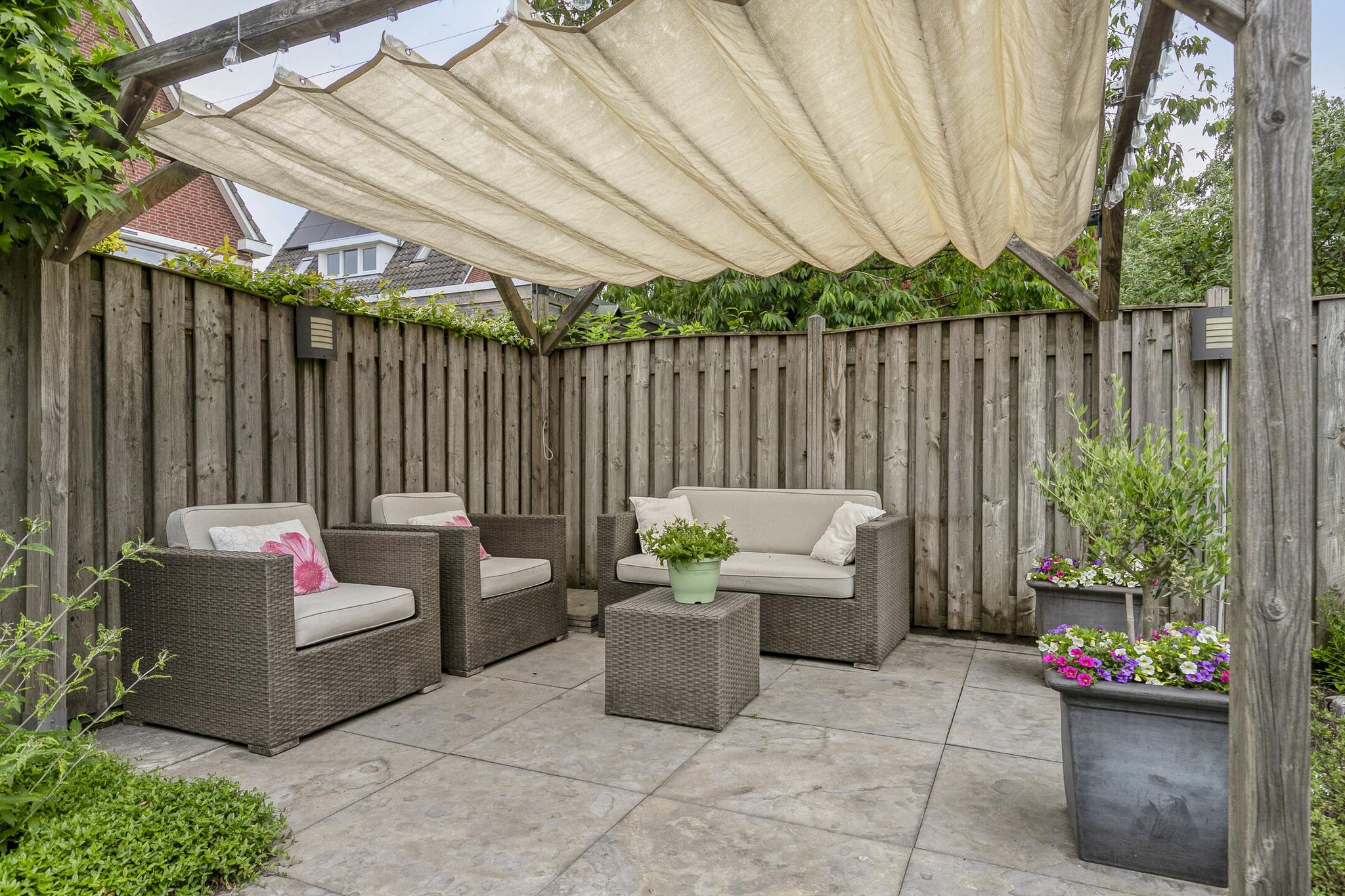 Deze tuin is afgescheiden middels een houten delen erfafscheiding en aangelegd met 2 zonneterrassen waarvan één overkapt met een nette terrasoverkapping, mooie terrastegels, diverse beplanting en kunstgras.