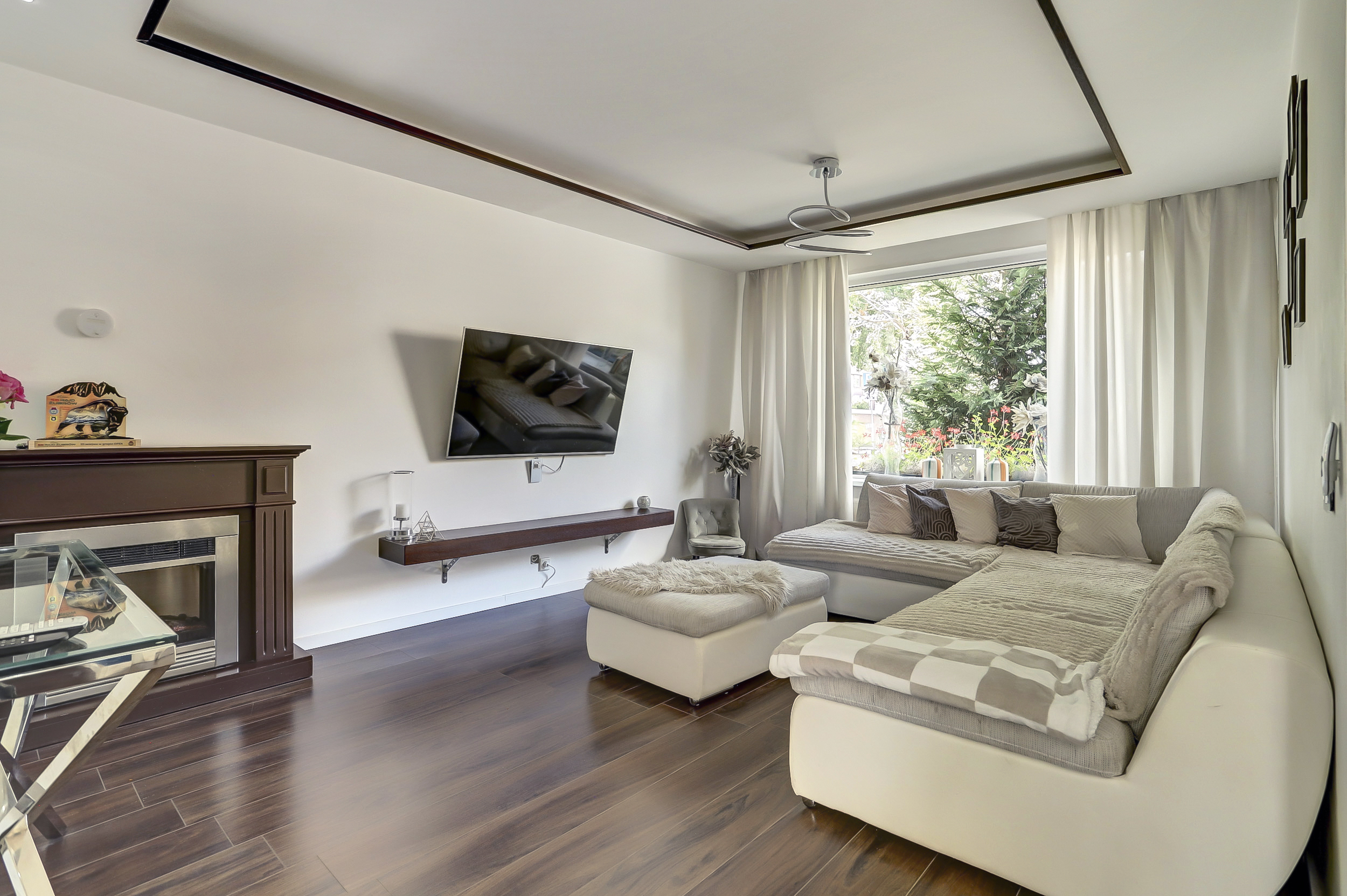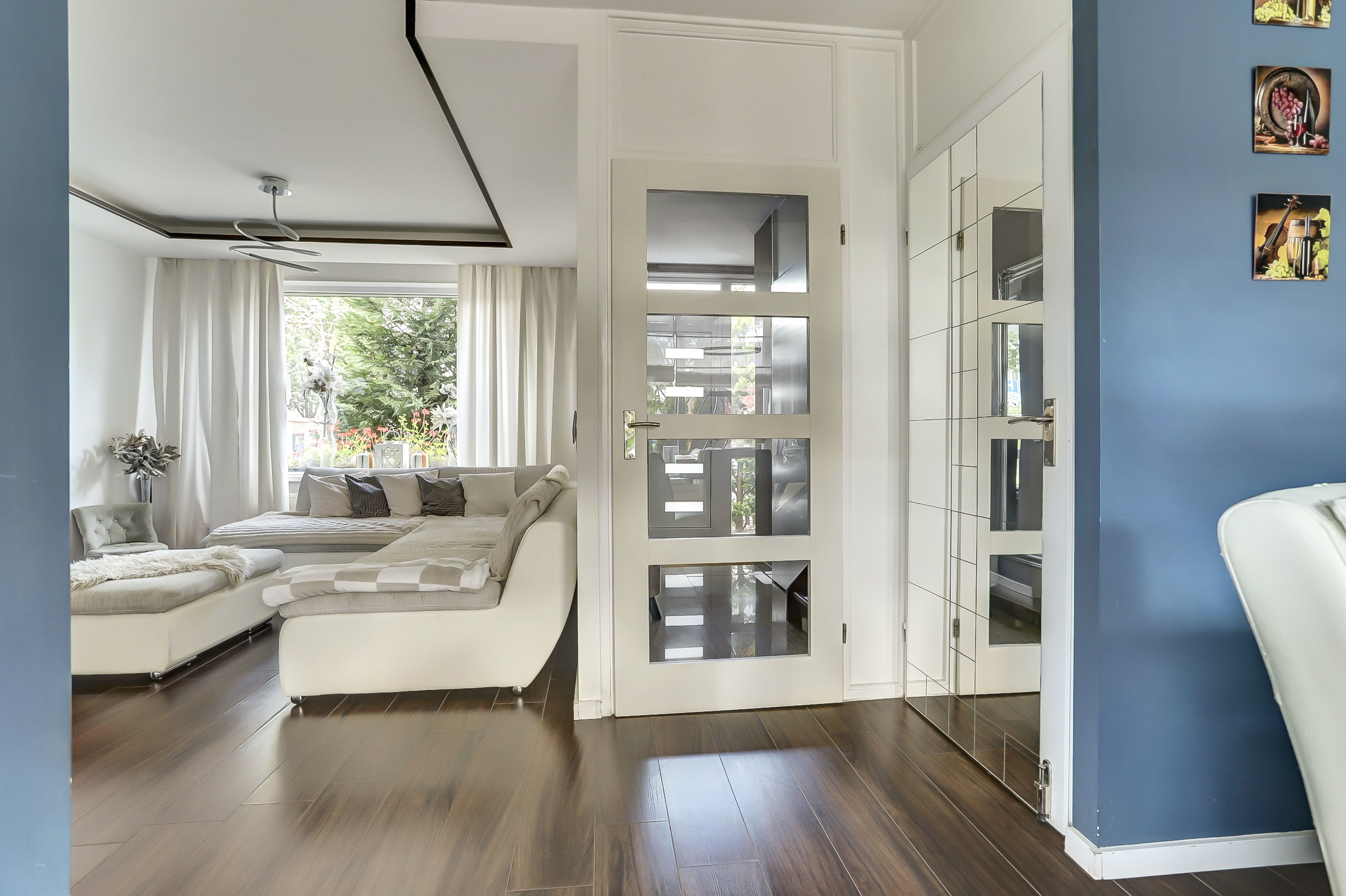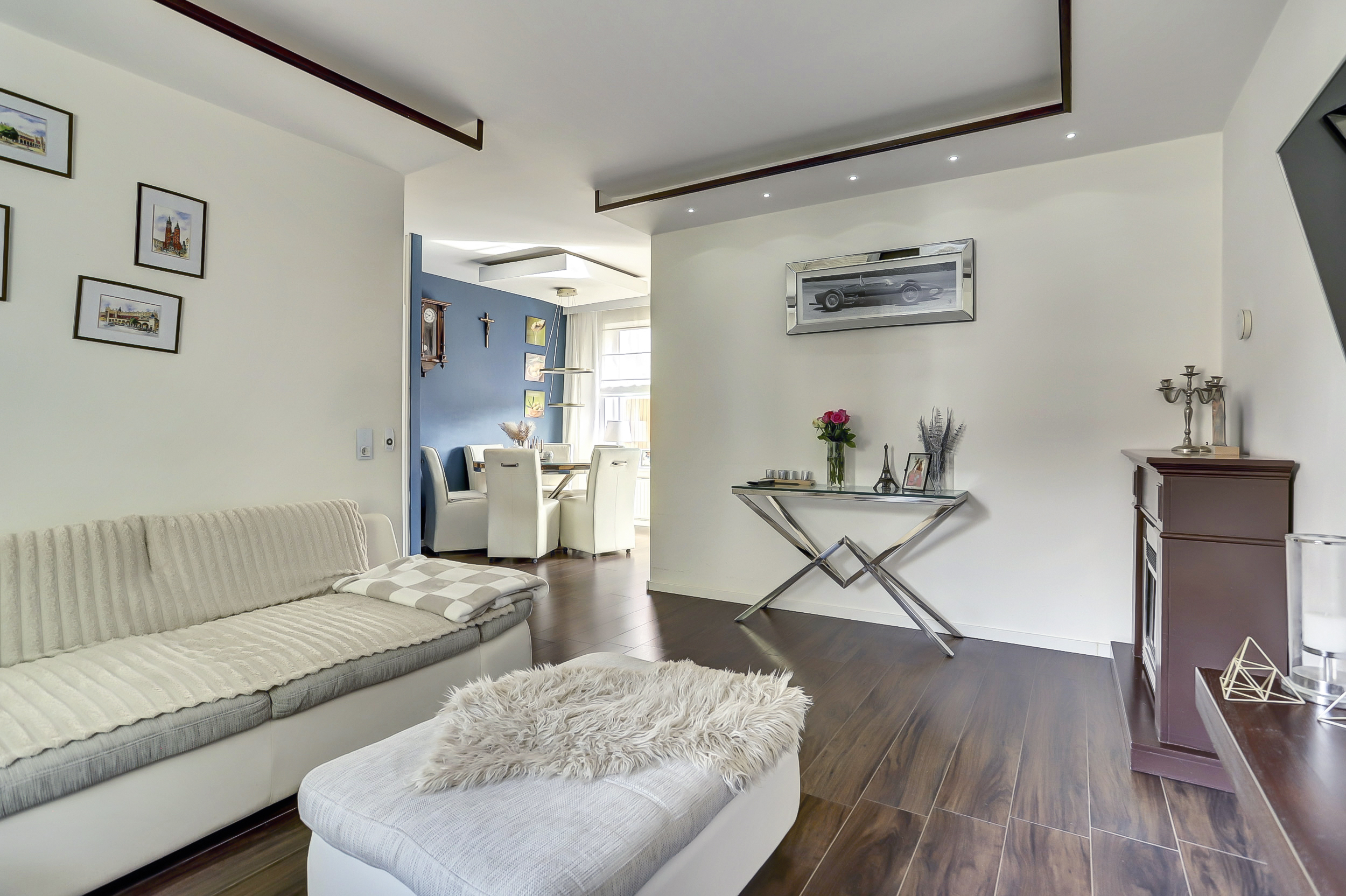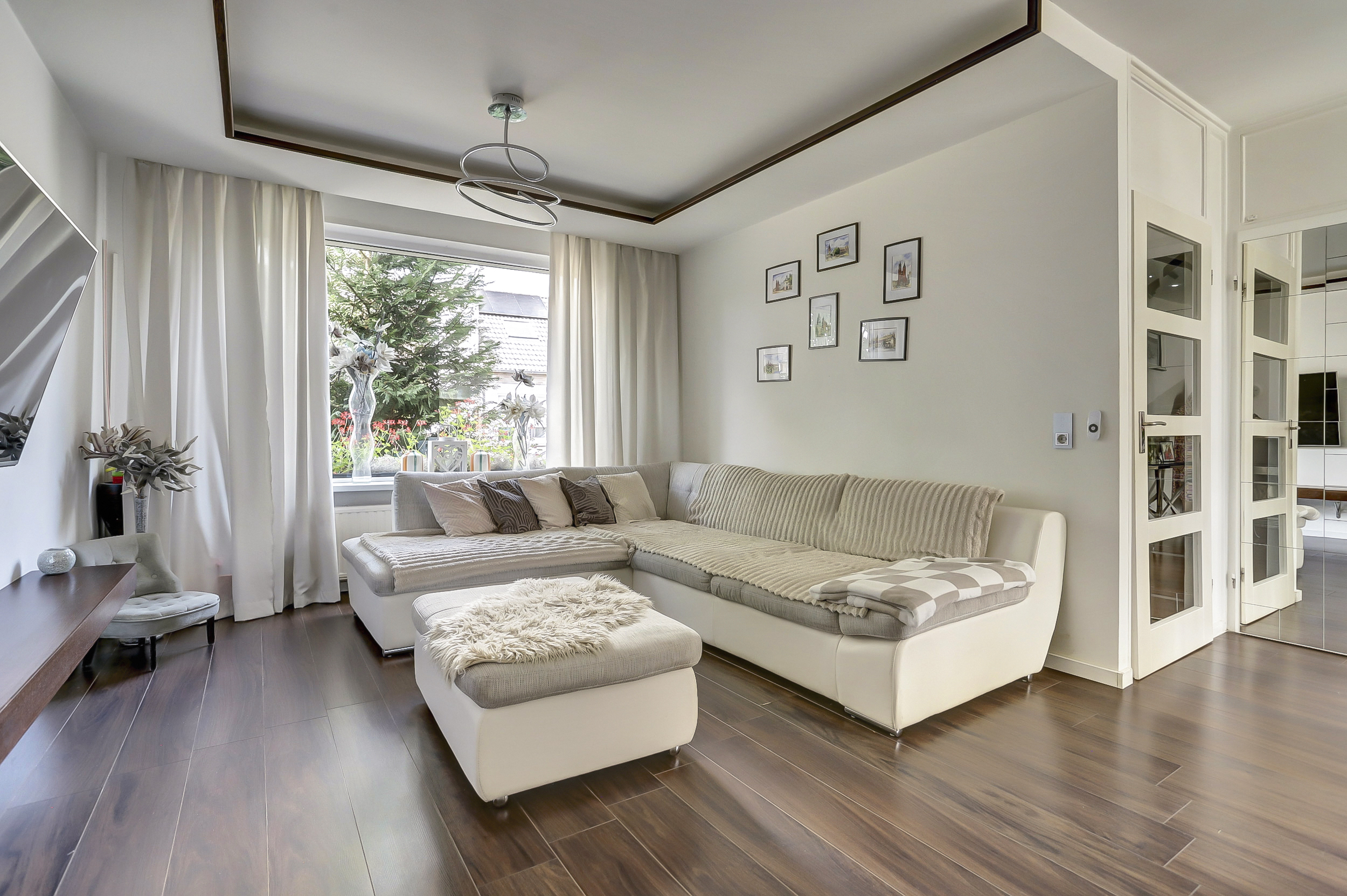 Sfeervolle living in Z-vorm afgewerkt met een laminaatvloer, stucwerk wanden en een stucwerk plafond.