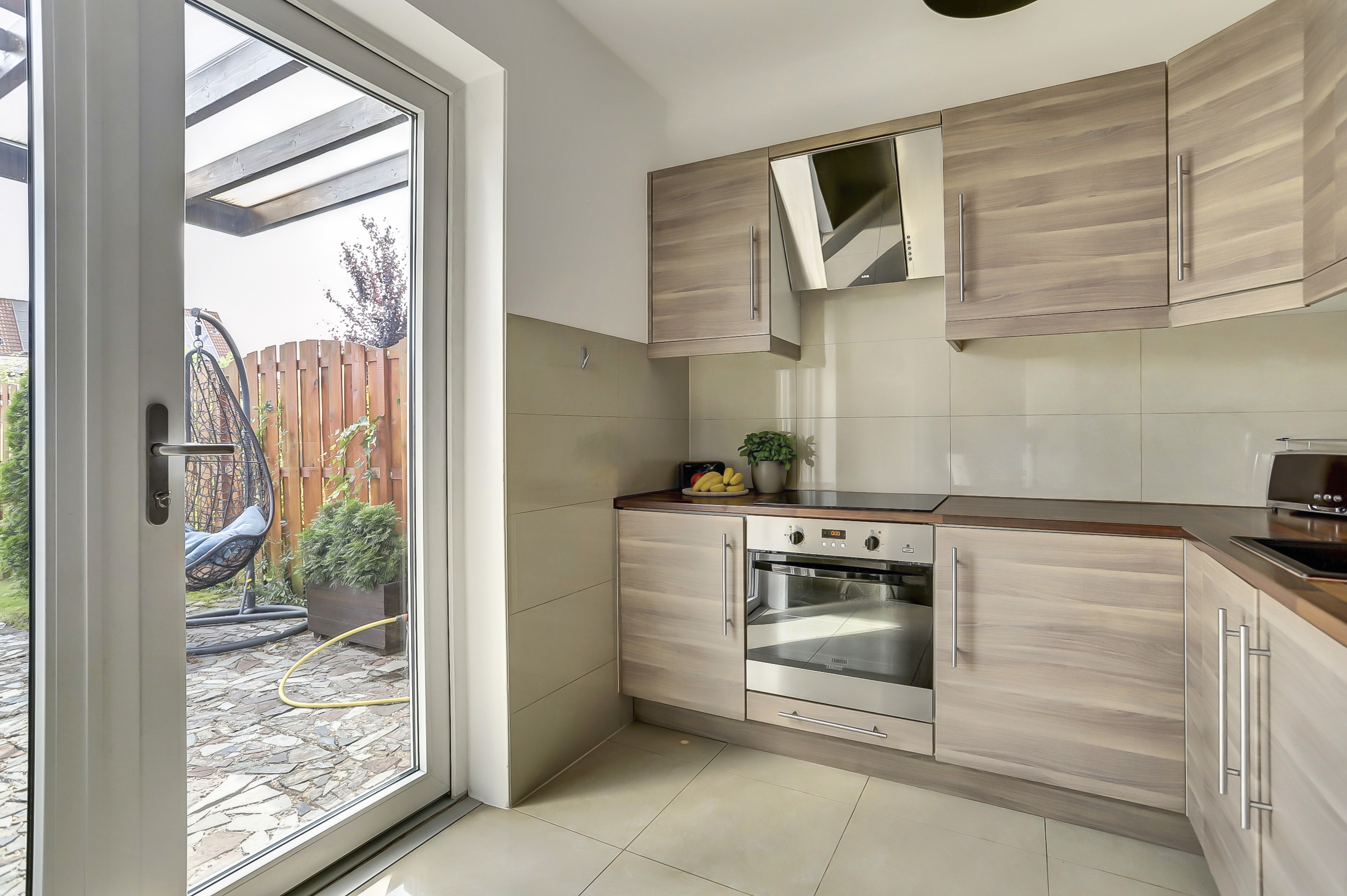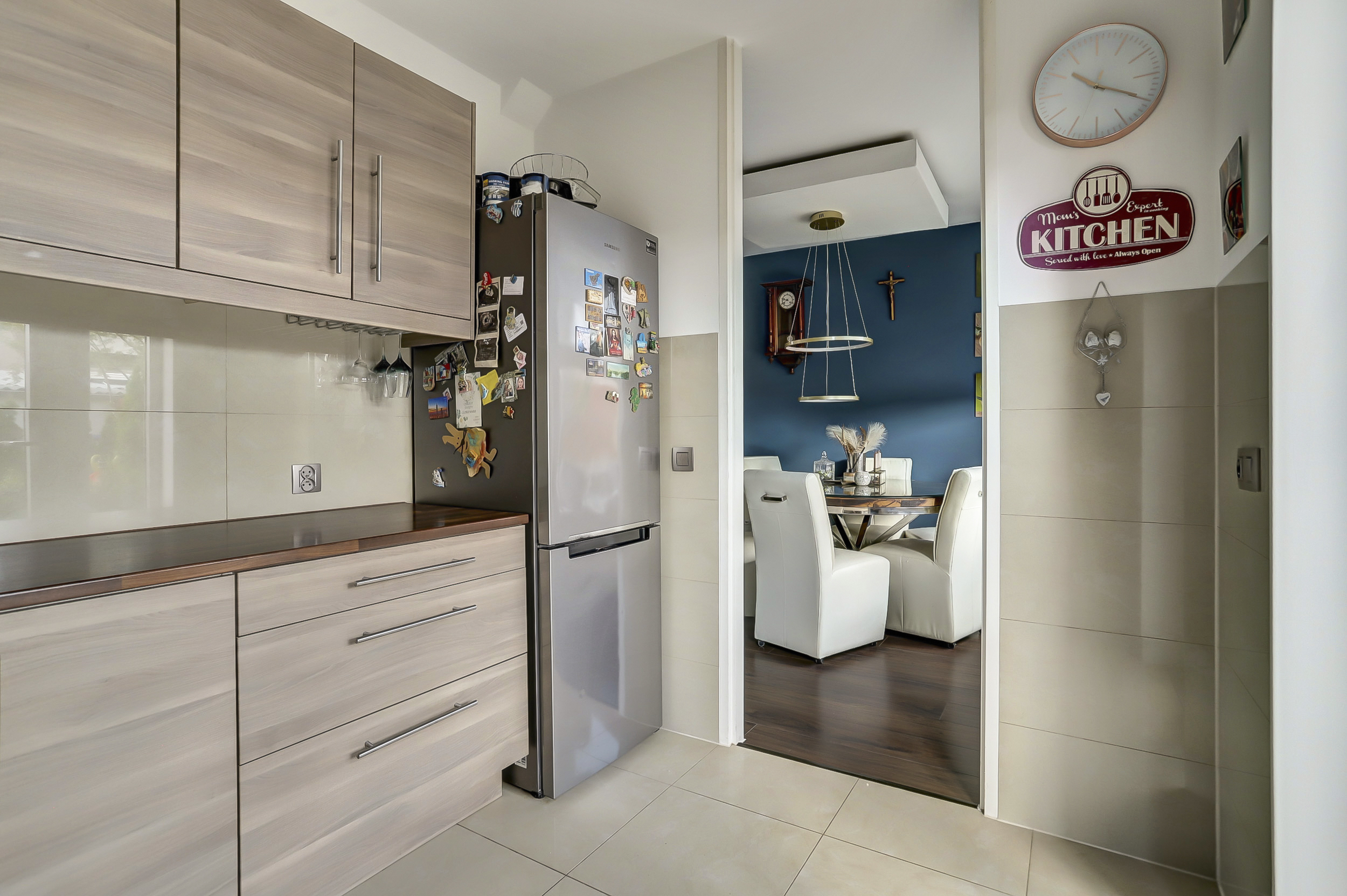 Semi open en deels betegelde keuken met een met een eigentijdse keukeninrichting in hoekopstelling voorzien van diverse laden en kasten, kunststof werkblad, spoelbak, koel/vriescombinatie, elektrische oven, inductie kookplaat, inductie kookplaat en de afzuigkap.