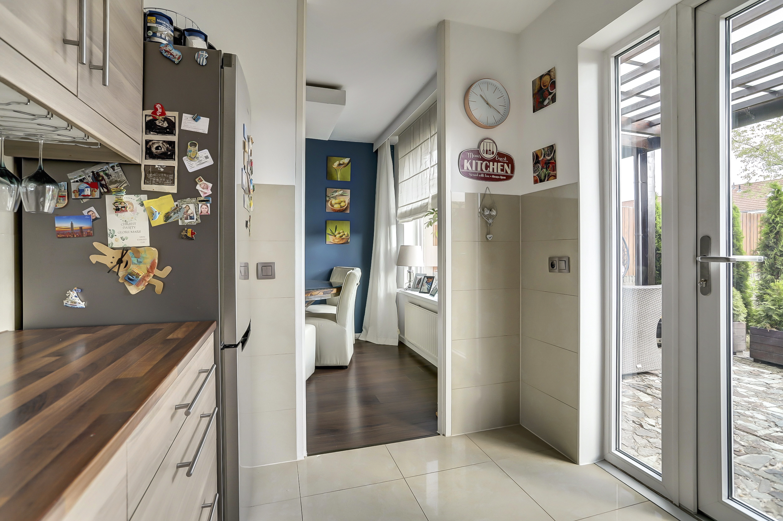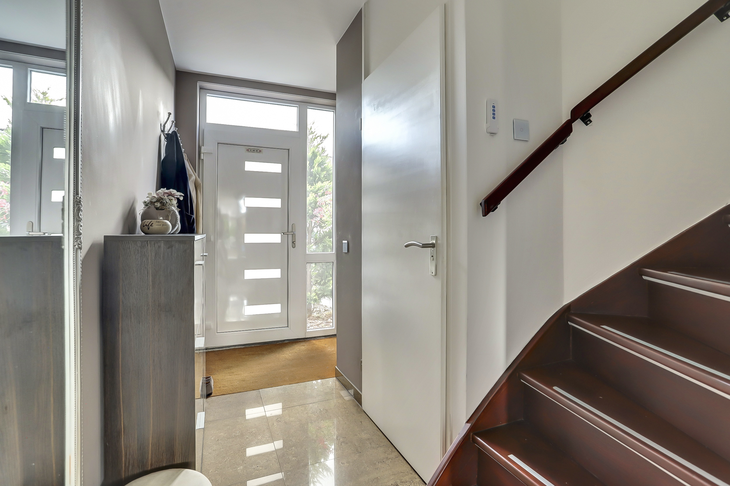 Hal afgewerkt met een tegelvloer, stucwerk wanden en een stucwerk plafond.