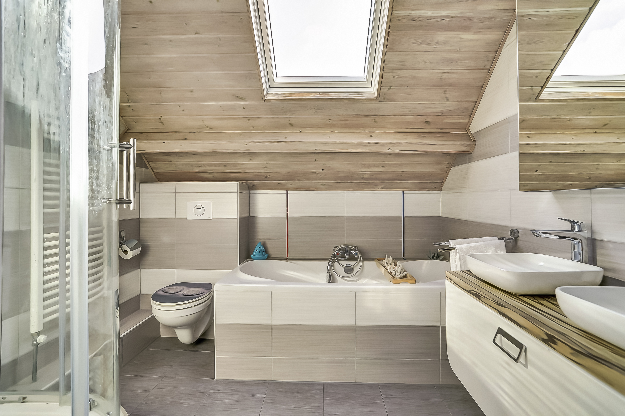 Eigentijdse betegelde badkamer voorzien van een kunststof ligbad, separate douche en een badmeubel met dubbele wastafel.